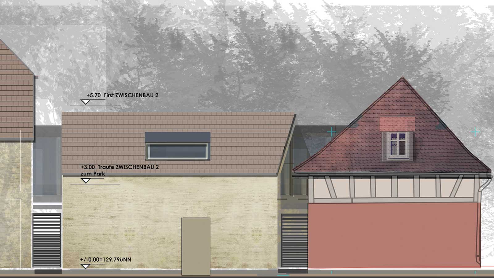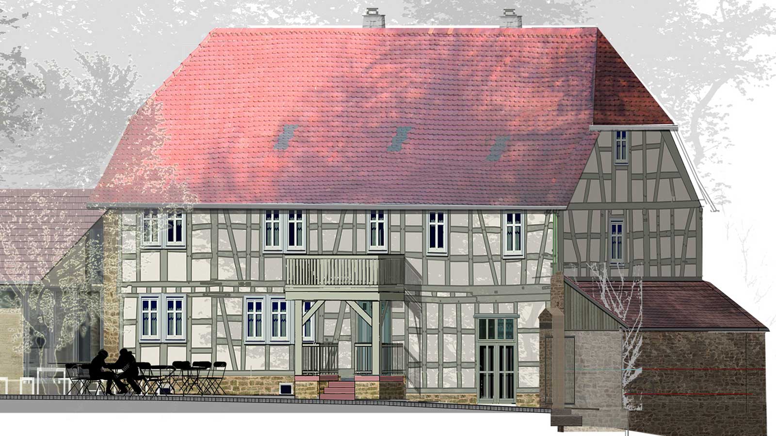 Das Haupthaus aus Fachwerk und das markante Torhaus auf dem Mühlenanwesen, deren früheste Bausubstanz aus der Wende vom 17. zum 18. Jahrhundert stammt, zählen zu den ältesten Bauten Eschborns. Einst bildeten sie zusammen mit nicht mehr erhaltenen Gebäuden, wie Ställen und Scheunen, ein geschlossenes Ensemble um einen Innenhof. Dieser Charakter wird nun wiederhergestellt. Die bestehenden Gebäudeteile – das Haupthaus, das Scheunenhaus und das kleine Torhaus – werden, unter Auflagen des Denkmalschutzes, vollständig saniert. Die verloren gegangenen Baukörper werden wieder aufgebaut. Da es kaum aussagekräftige alte Unterlagen wie Pläne, Zeichnungen oder Fotos gibt, ist eine historische Rekonstruktion nicht möglich. Die Abmessungen der neuen Bauteile sind einer alten Liegenschaftskarte entnommen. Die neuen Gebäude – zwei Zwischenbauten und ein Eckhaus – werden in Abstimmung mit den Denkmalschutzbehörden passend zum Ensemble errichtet.