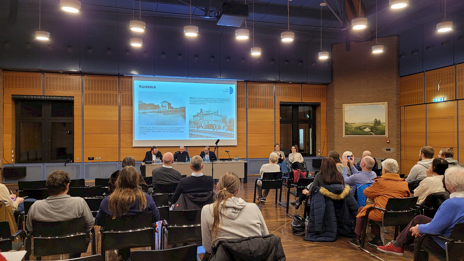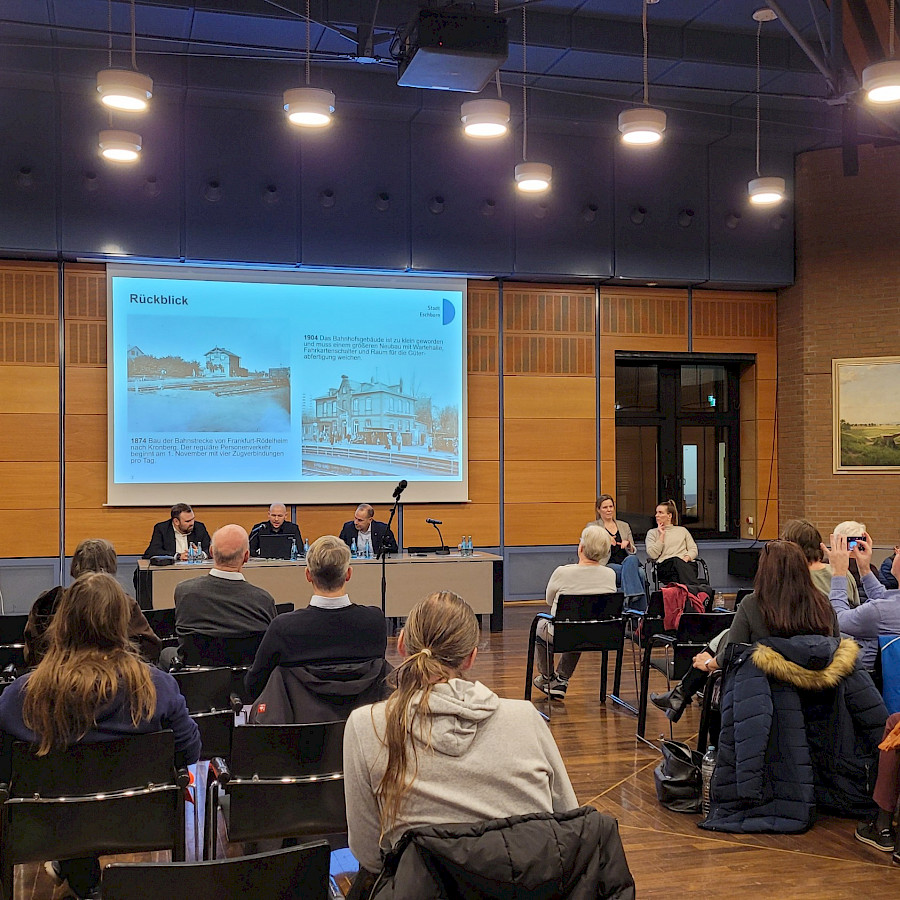 Am 3. Dezember fand im Eschborner Stadtverordnetensitzungssaal ein Werkstattgespräch zum Umbau des Bahnhofs Eschborn Mitte statt. Rund 20 interessierte Bürgerinnen und Bürger erhielten von Bürgermeister Adnan Shaikh und dem Nahmobilitätbeauftragen Andreas Gilbert an dem Abend einen Einblick in die Planentwürfe zur zukünftigen Gestaltung des Bahnhofs und dem Bahnhofsumfeld. Die öffentliche Veranstaltung wurde von zwei Gebärdendolmetschern unterstützt.