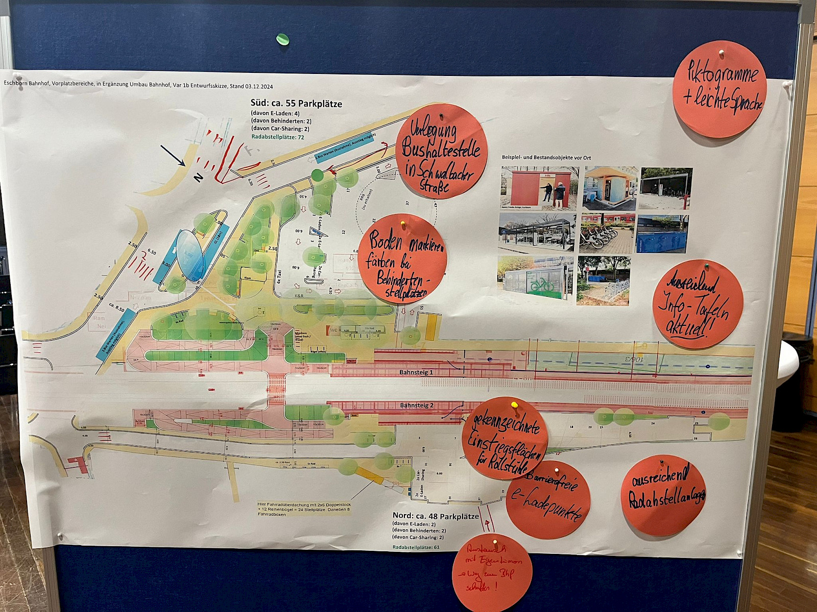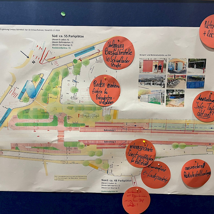 „Nach langer Zeit gehen die Planung nun endlich weiter voran. Dies Betrifft die Planung der Deutschen Bahn zum Bahnsteig, der Personenunterführung und Zugängen, als auch die städtische Planung zum Bahnhofsumfeld“, so der Bürgermeister. „Außenbahnsteige, eine breitere und offen gestaltete Personenunterführung und natürlich barrierefreie Rampen werden das Bild des zukünftigen Bahnhofs Eschborn Mitte prägen. Auf beiden Seiten des Bahnhofs soll es Parkmöglichkeiten geben und die Bushaltestelle in das Bahnhofsumfeld integriert werden. Nach Aussage der Deutschen Bahn soll der Umbau der Bahnsteige Anfang 2028 starten und etwas über 1 Jahr dauern. Dabei ist von der DB aktuell geplant, möglichst immer ein Gleis im Betrieb zu halten. Im Werkstattgespräch hatten wir besonders zum zukünftigen Bahnhofsumfeld einen konstruktiven Austausch und nehmen daraus einige wichtige Hinweise und Anregungen mit, die wir im Zuge der weiteren Planung prüfen werden. Ich danke allen Teilnehmerinnen und Teilnehmer für ihr Kommen und Beteiligung“, berichtet Adnan Shaikh.