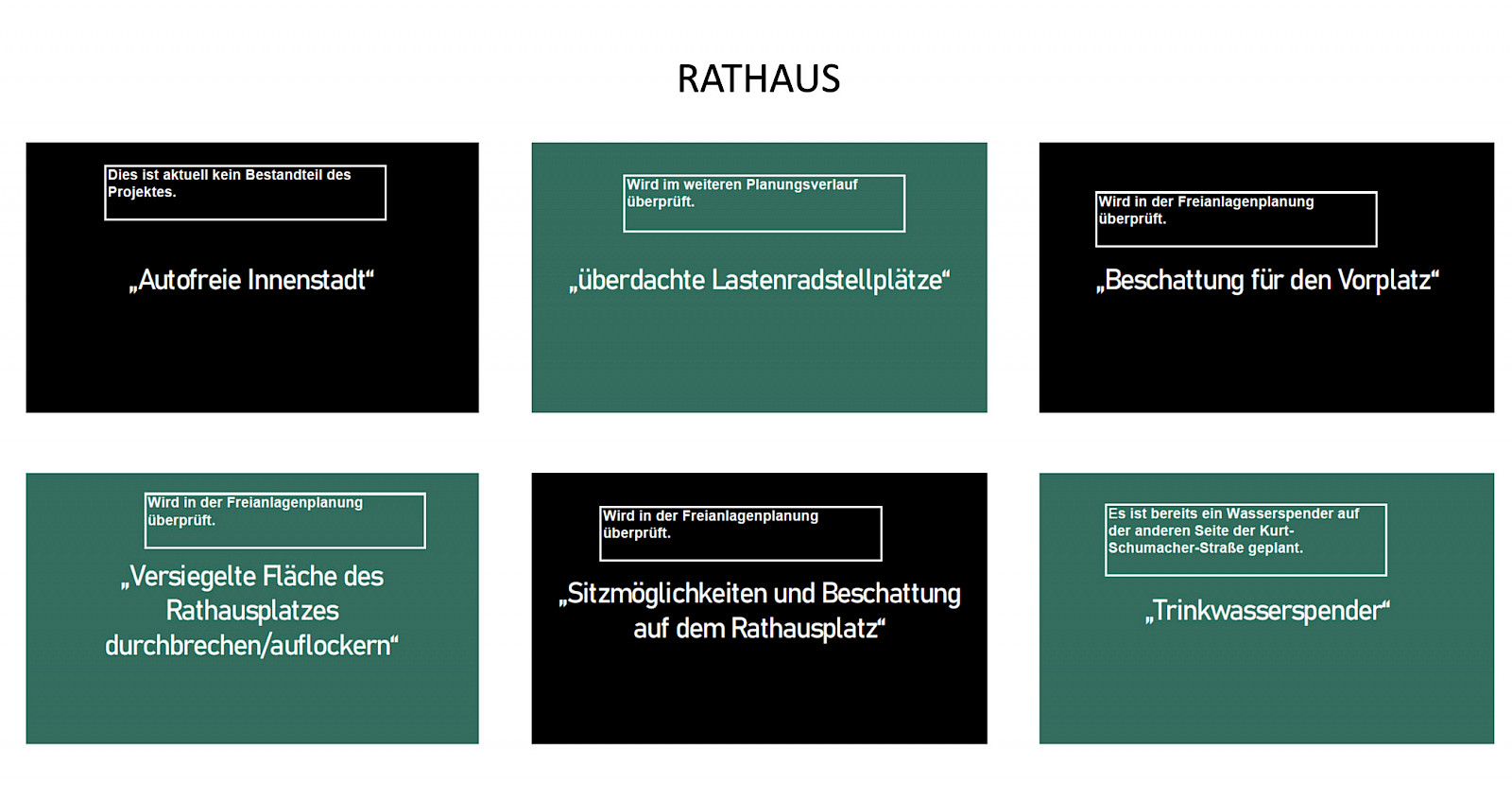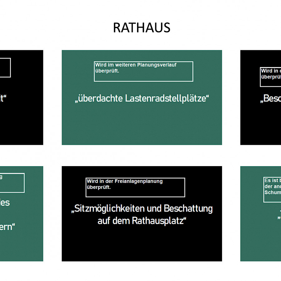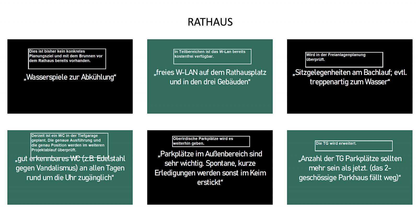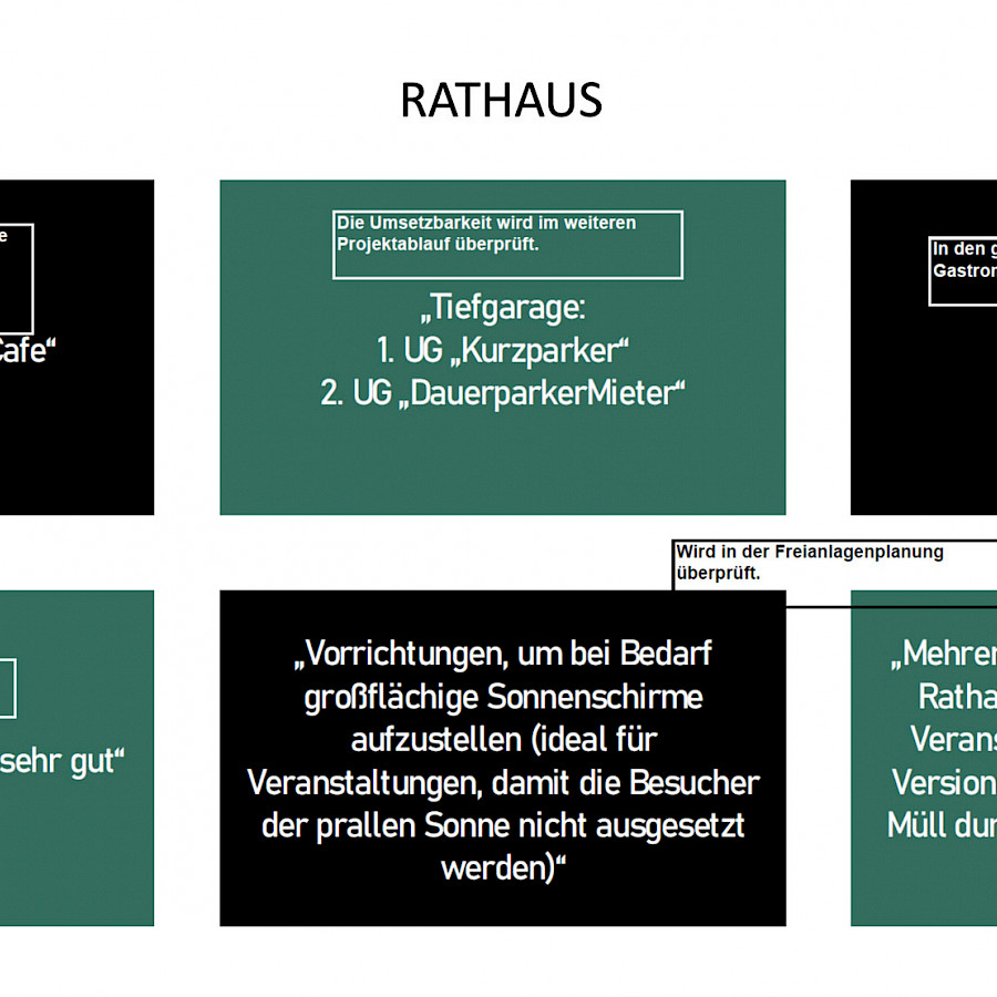 Der erste Abend widmete sich thematisch dem Rathausgebäude. Hier lag der Fokus der eingehenden Ideen allerdings weniger auf dem Gebäude selbst, sondern viel mehr auf dem Rathausplatz. Den Vorschlägen der Bürgerinnen und Bürger war zu entnehmen, dass viele sich einen Rathausplatz wünschen, der nicht nur funktional, sondern auch als Aufenthaltsort attraktiv ist. So wurden beispielsweise beschattete Sitzmöglichkeiten, Trinkwasserspender, Wasserspiele oder ein neues Café genannt. Aber auch neu durchdachte Parkmöglichkeiten in der Tiefgarage und überdachte Lastenradstellplätze wurden angeregt.