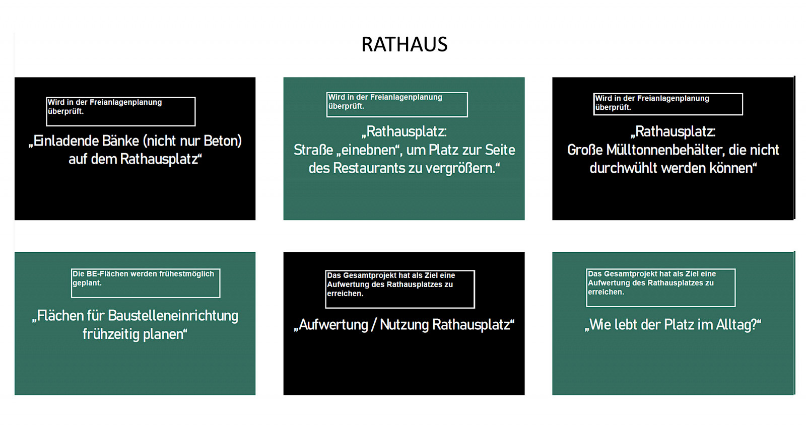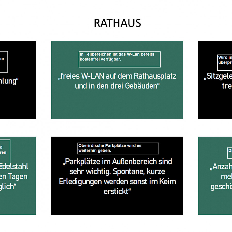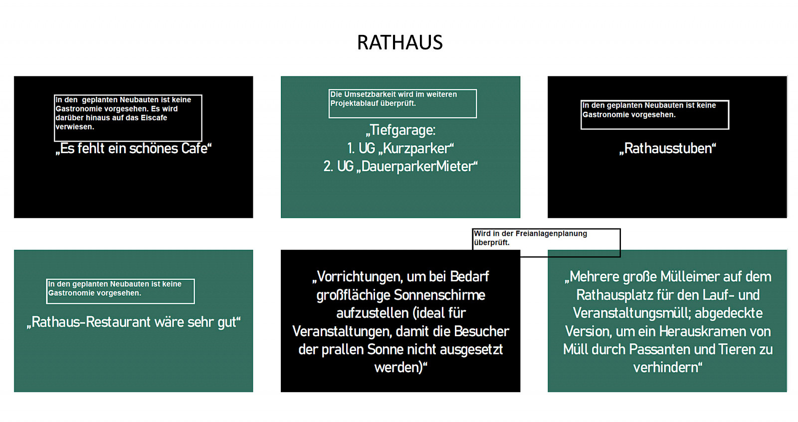 Der erste Abend widmete sich thematisch dem Rathausgebäude. Hier lag der Fokus der eingehenden Ideen allerdings weniger auf dem Gebäude selbst, sondern viel mehr auf dem Rathausplatz. Den Vorschlägen der Bürgerinnen und Bürger war zu entnehmen, dass viele sich einen Rathausplatz wünschen, der nicht nur funktional, sondern auch als Aufenthaltsort attraktiv ist. So wurden beispielsweise beschattete Sitzmöglichkeiten, Trinkwasserspender, Wasserspiele oder ein neues Café genannt. Aber auch neu durchdachte Parkmöglichkeiten in der Tiefgarage und überdachte Lastenradstellplätze wurden angeregt.