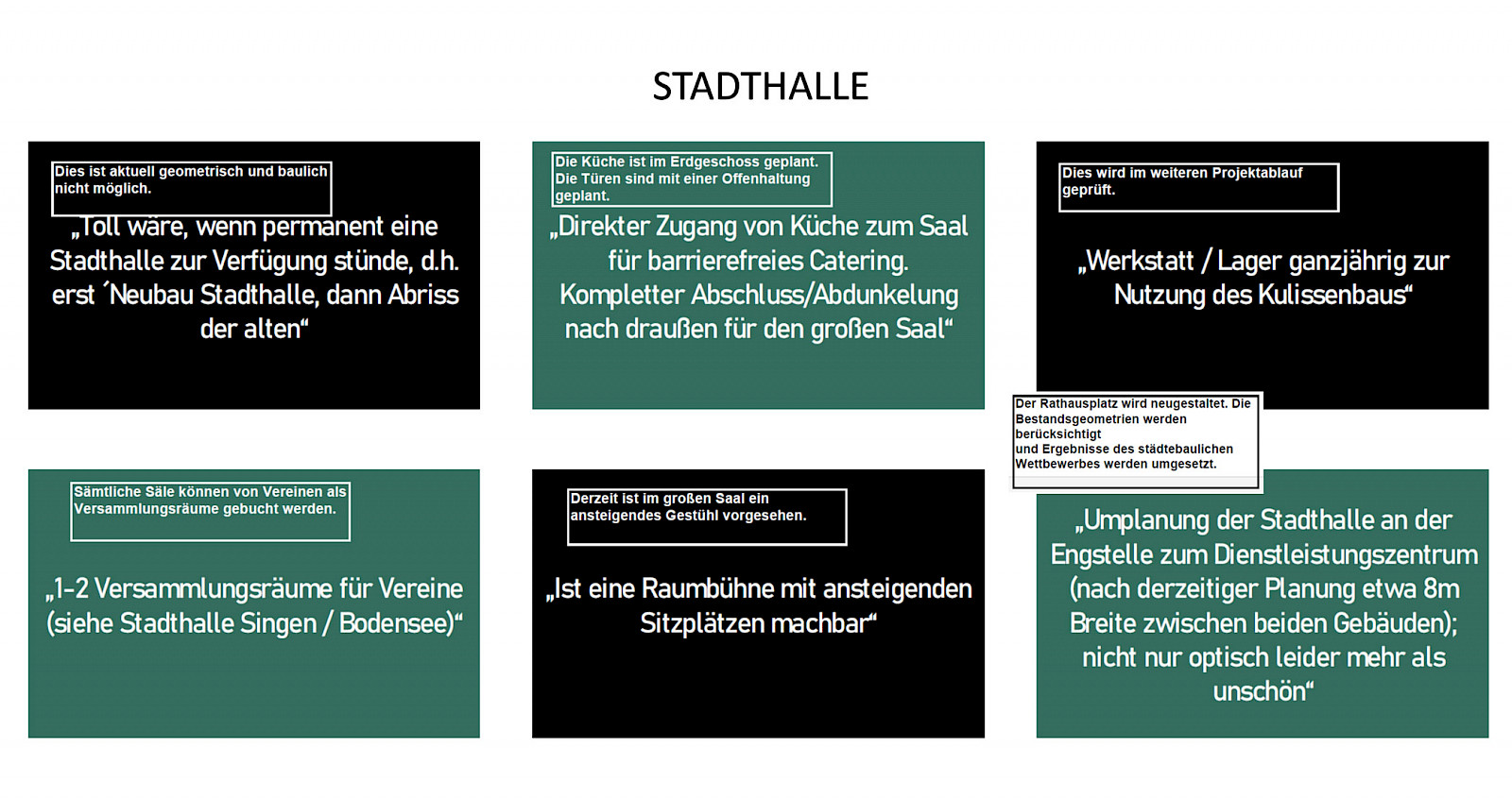 Das in den offenen Werkstattgesprächen Mitte Juli gesammelte Feedback der Bürgerinnen und Bürger wurde nunmehr ausgewertet. Die Ergebnisse haben wir für Sie in mehreren Folien – getrennt nach Wünschen zum neuen Rathaus, zur neuen Stadthalle und zur neuen Stadtbücherei – zum Nachlesen zusammengestellt.