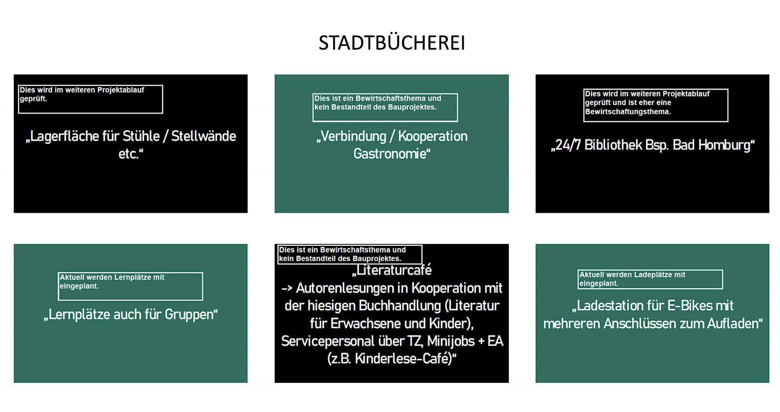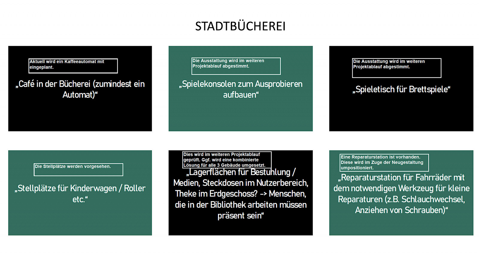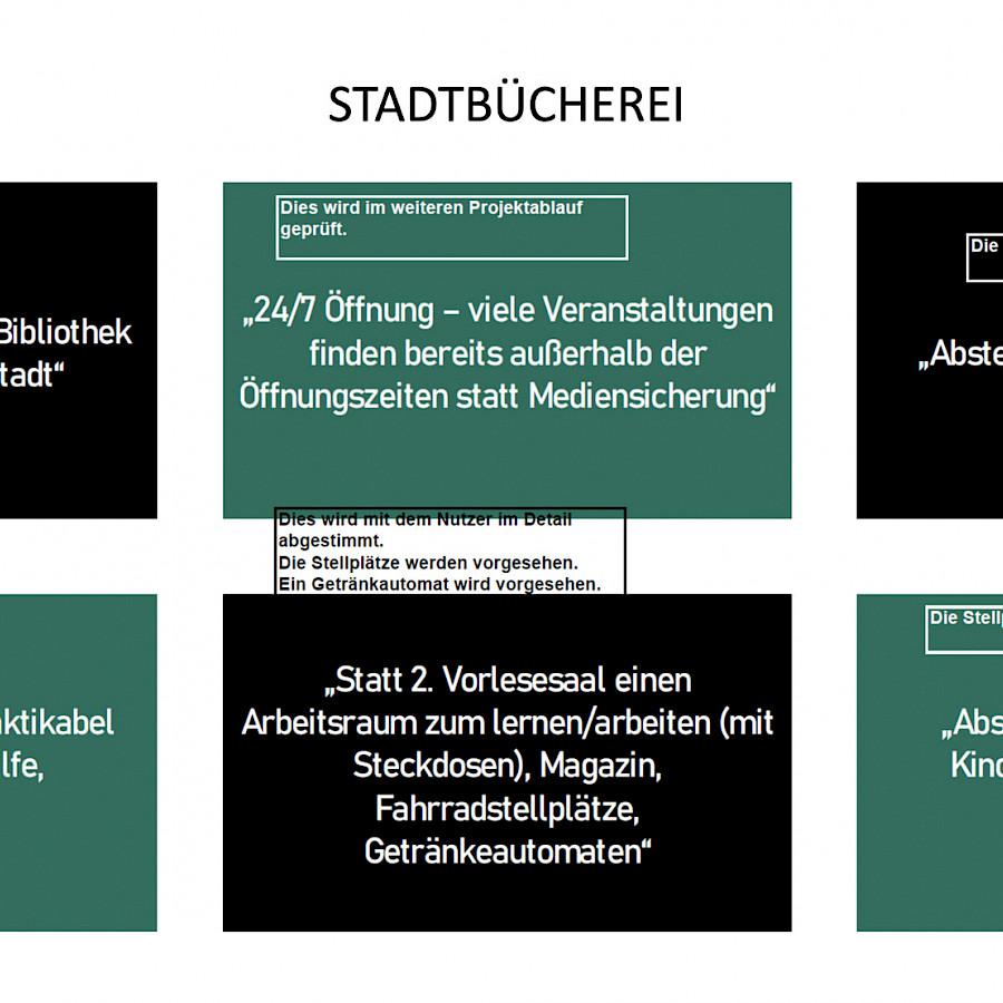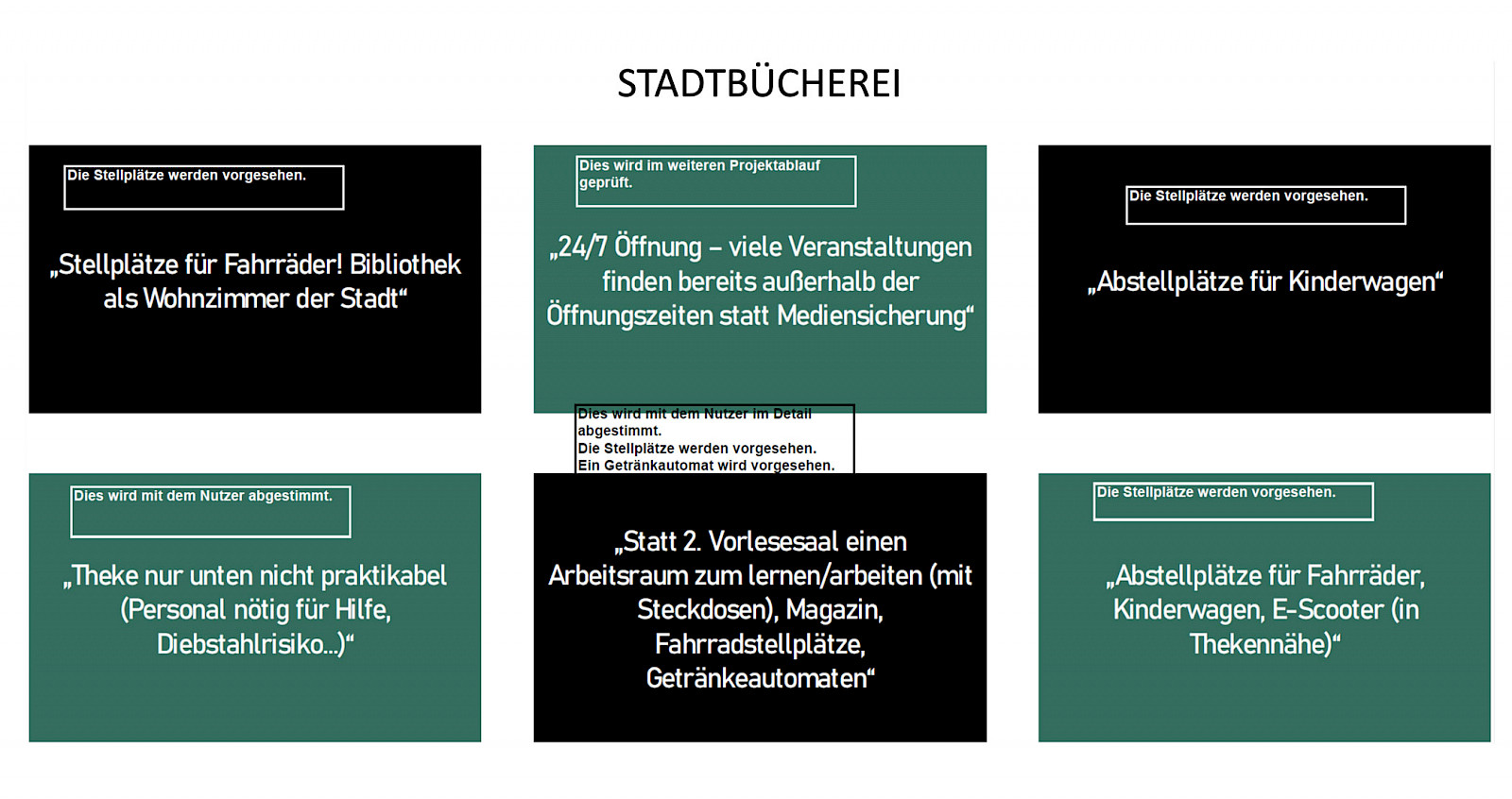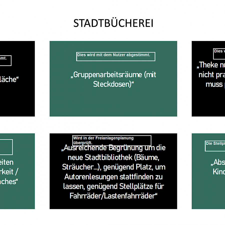 Am dritten Abend wurde über die Gestaltung der Stadtbücherei diskutiert. Hierbei wurden erweiterte Serviceleistungen wie ein gastronomisches Angebot oder mehrere Ausleihtheken auf den unterschiedlichen Geschossen angesprochen. Mehrfach erwähnt wurde aber auch der Wunsch nach Lagerflächen für Stühle, Tische oder Stellwände sowie die Einrichtung von Gruppenarbeitsplätzen oder Stellplätzen für Kinderwagen, Roller und Fahrräder.