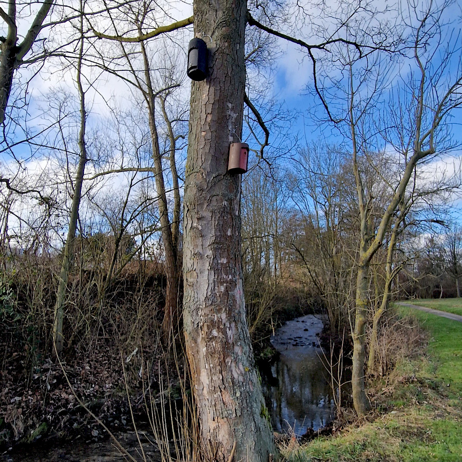 Als Ausgleichsmaßnahme für die natürlichen Nistmöglichkeiten, die durch die notwendigen Baumfällungen entfallen, wurden seit der vergangenen Woche nahe des Westerbachs 2 Fledermausflachkästen, 11 Fledermaushöhlen und 14 Nisthöhlen für Vögel angebracht. Die Zahl der Kästen wurde anhand einer Habitatbaumkartierung ermittelt.