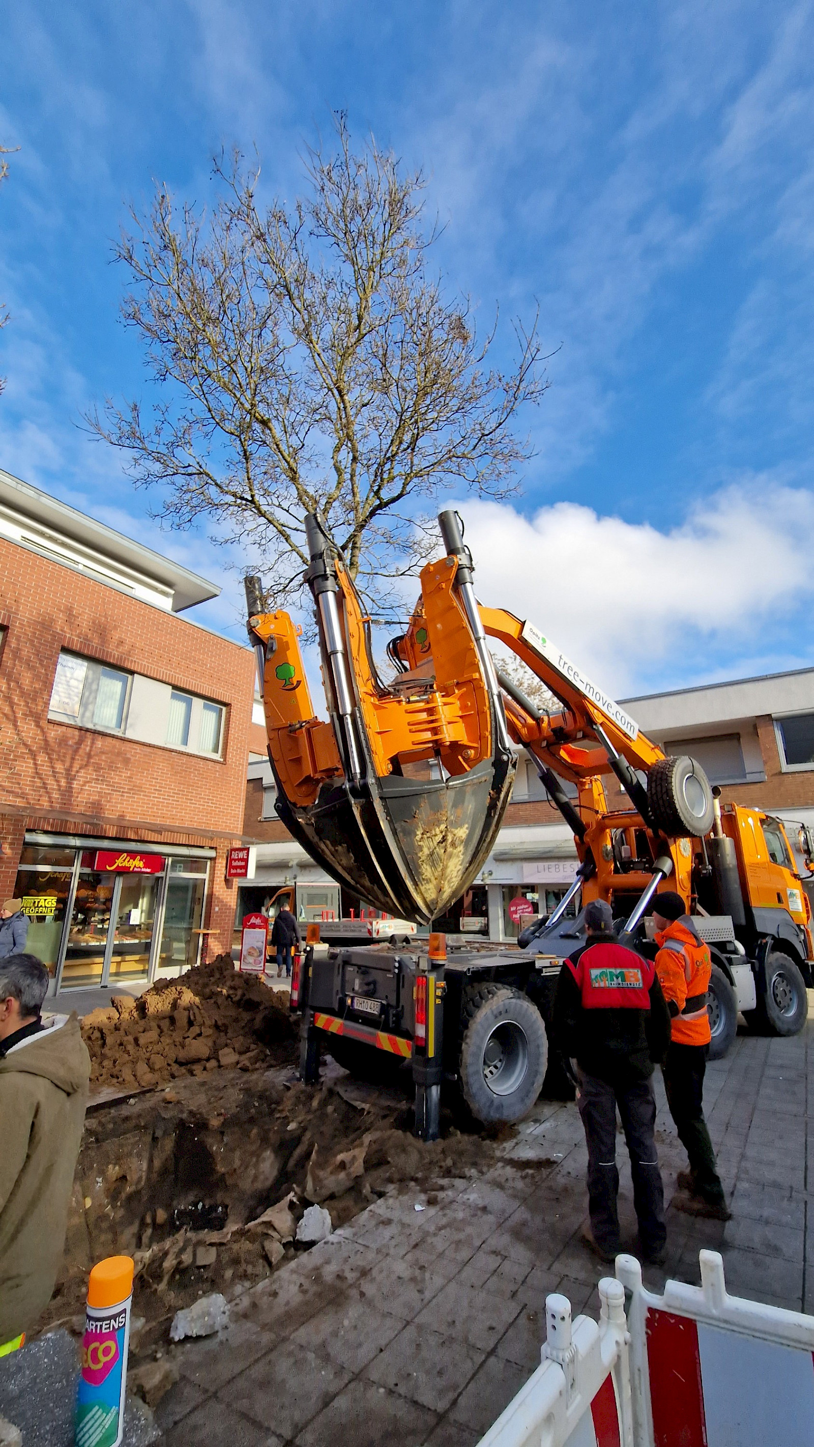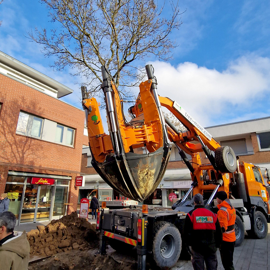 Drei große Bäume, die vor dem Rewe-Markt am Rathausplatz standen, mussten in der vergangenen Woche weichen. Grund dafür sind die bevorstehenden Bauarbeiten für den Umbau des Rathauses und den Neubau von Stadthalle und Stadtbücherei. Die Besonderheit in diesem Fall: statt sie zu fällen, beauftragte die Stadtverwaltung Eschborn ein Fachunternehmen damit, sie zu verpflanzen. Dafür wurden zunächst die Bänke und Gitter rund um die Bäume entfernt. Anschließend hob eine Spezialmaschine mit Greifvorrichtung die Bäume nacheinander inklusive Wurzelballen aus der Erde. Die Bäume wurden dann auf ein Fahrzeug geladen und zur Hundewiese gefahren, wo sie einen neuen Standort erhalten haben.