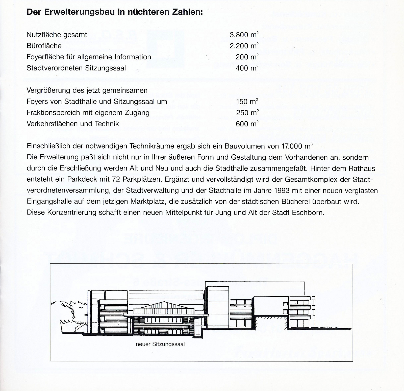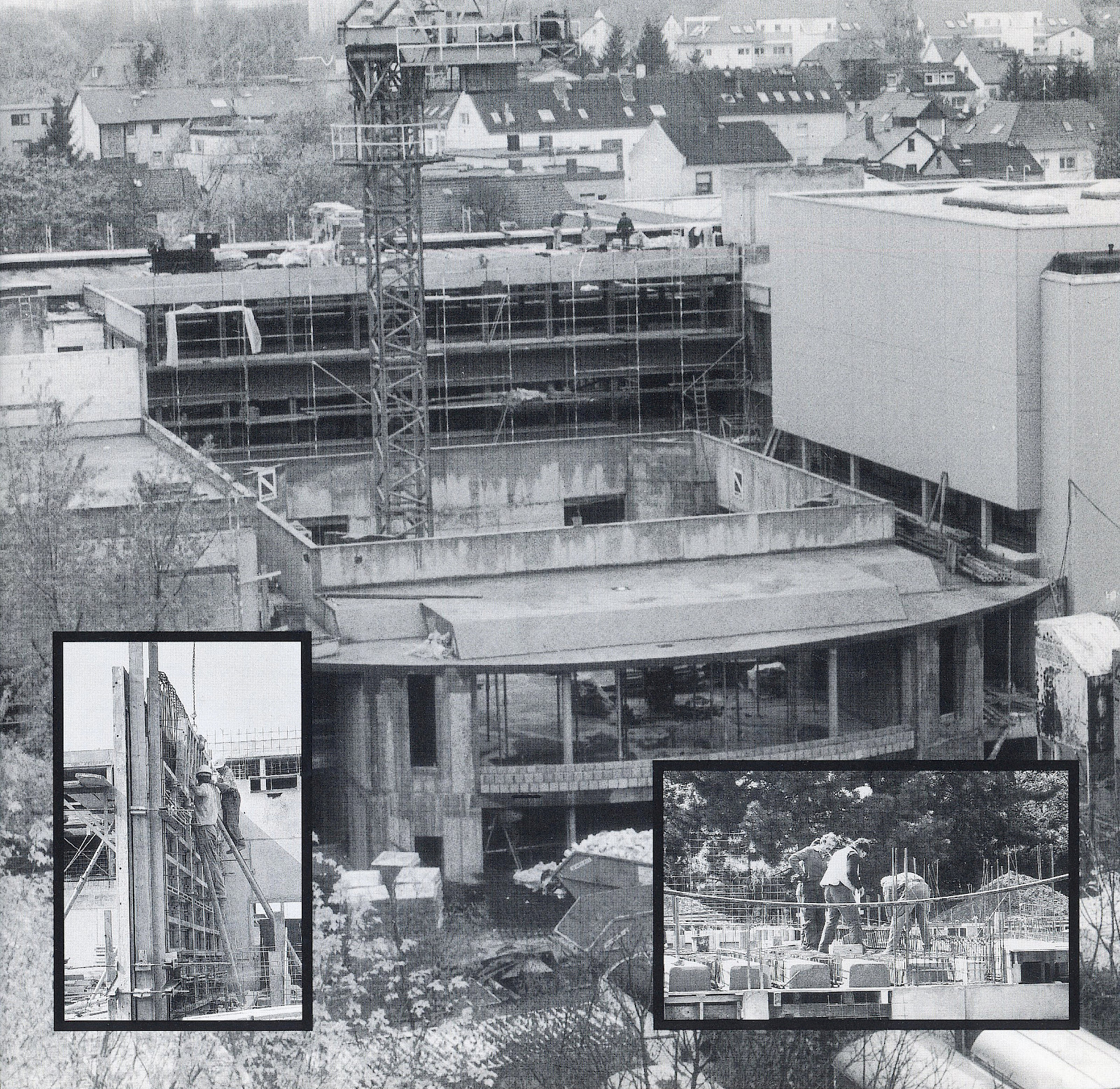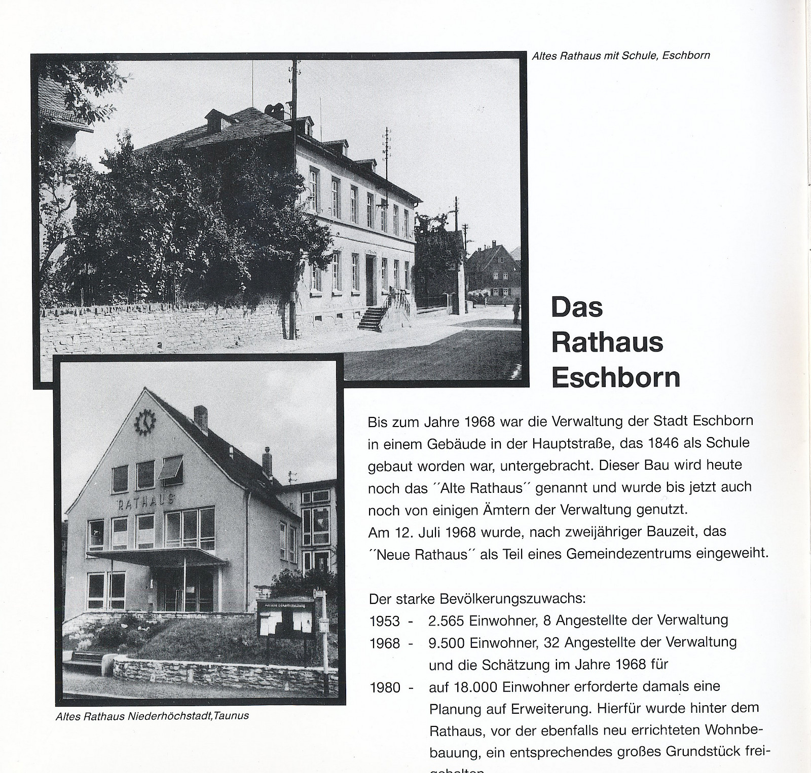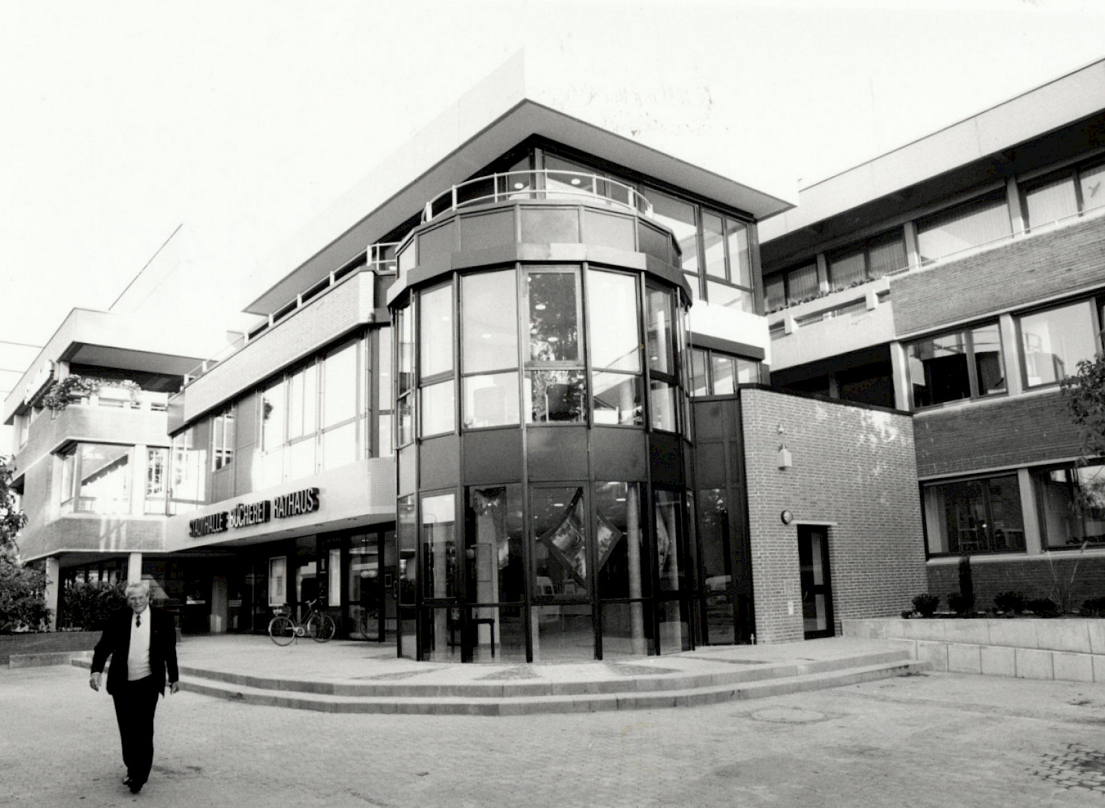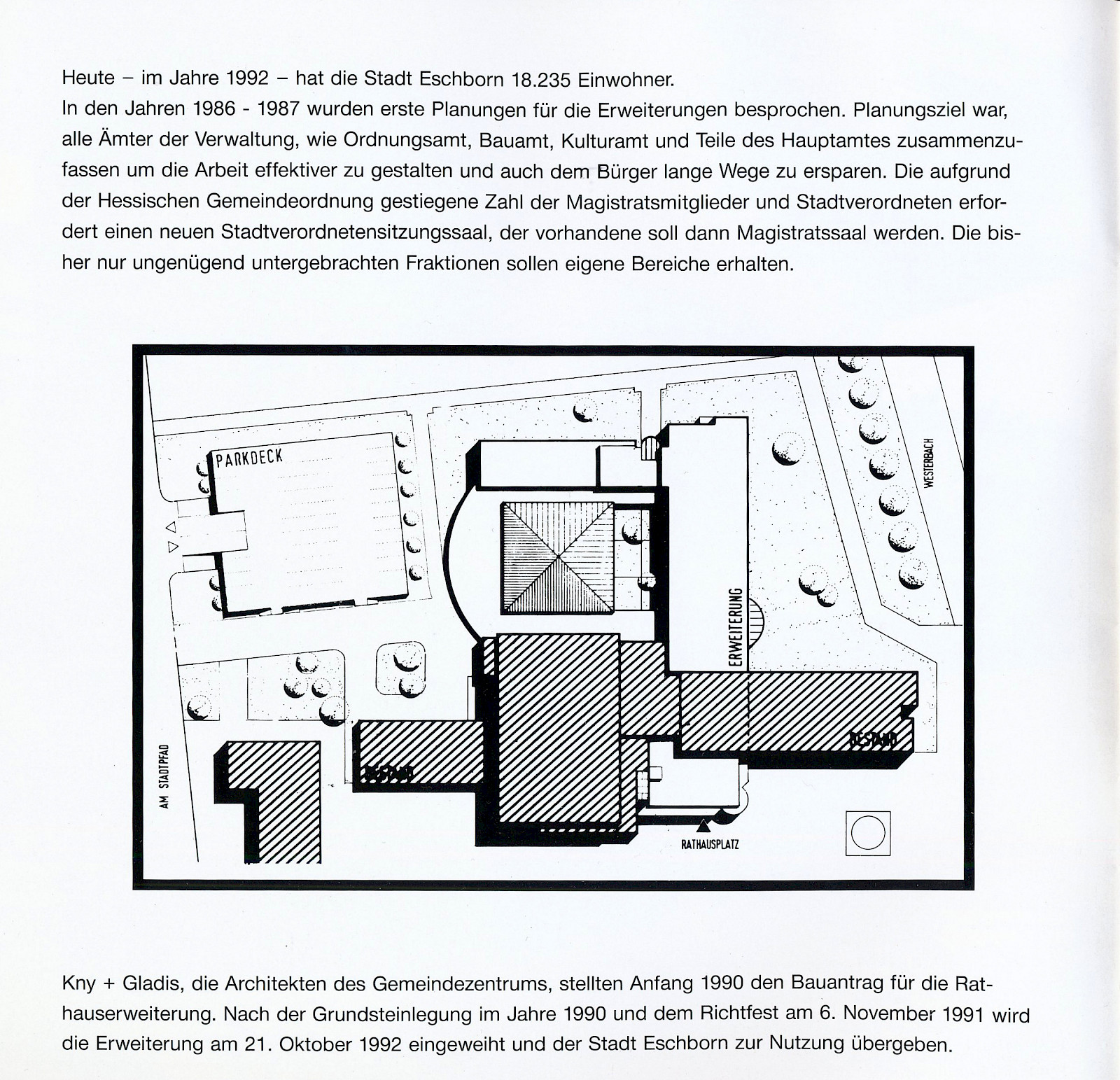1967 1968 1970 1990 1992 1996 1967 Am 3. November finden Richtfest und Grundsteinlegung für das neue Eschborner Rathaus statt. Umgesetzt wird der Entwurf des Frankfurter Architekten Hansjörg Kny, der im März 1966 als Sieger eines landesoffenen Wettbewerbs ausgezeichnet wurde: Kny hatte, wie gefordert, das Rathaus mit Stadthalle als Teil eines Gemeinschaftszentrums geplant. Dieses ist als neue Stadtmitte der schnell wachsenden Kommune südlich das Atstadtrandes an der Nahtstelle zu den neuen Stadtgebieten platziert, um die Stadtteile miteinander zu verbinden. Nach nur sieben Monaten Bauzeit werden Richtfest und Grundsteinlegung für das neue Rathaus zusammen zelebriert: Bürgermeister Hans Georg Wehrheim legt dem Grundstein eine Urkunde bei. 1968 Das neue Rathaus wird am 12. Juli feierlich eingeweiht. Die Bauzeit für den ersten Bauabschnitt der neuen Stadtmitte betrug gerade einmal 13 Monate. Eine Erweiterungsmöglichkeit des Rathauses war schon damals als winkelförmiger Flügel nach Süden vorgesehen. 1970 Im Juni wird die Sadthalle anlässlich der 1200-Jahrfeier zur Verleihung der Stadtrechte für Eschborn eingeweiht. Die stattliche Halle wurde als zweiter Bauabschnitt des Gemeinschaftszentrums unmittelbar nach Fertigstellung des Rathauses 1969 / 70 errichtet und ist als Veranstaltungsort mit mannigfaltigen Nutzungsmöglichkeiten eine echte Bereicherung für das kulturelle Leben Eschborns. 1990 Die stark wachsende Zahl der städtischen Mitarbeiter/innen macht eine Erweiterung des Rathauses erforderlich. Durch das schnelle Wachstum der Kommune und die steigende Anzahl an Stadtverordenten wird außerdem ein größerer Sitzungssaal benötigt. Die Rathauserweiterung wird durch den Architekten Wilfried Gladis, einem langjährigen Mitarbeiter von Hansjörg Kny, geplant. Der L-förmige Anbau nach Süden umfasst mit einem winkelförmigen Büroflügel den mit einem Zeltdach überdeckten Sitzungssaal, der unmittelbar an die Stadthalle angebaut wird. 1992 Der letzte Bauabschnitt des Ensembles am Rathausplatz wird fertiggestellt: In den Baumassenversatz von Rathaus und Stadthalle wird die Stadtbücherei eingefügt, die das Bild des Platzes völlig verändert. Der Eingang im Erdgeschoss wird neu geordnet. Rampen für Rollstuhlfahrer und ein Aufzug werden eingebaut. 1996 Die bestehende Ladenzeile mit Arkade auf dem Rathausplatz wird abgebrochen, um Platz für einen zweischiffigen Neubau zu machen, der zur Kurt-Schumacher-Straße drei Geschosse und zur Stadthalle zwei Geschosse zeigt. Gleichzeitig wird die Apotheke errichtet, die im Erdgeschoss eines punktförmigen Anbaus liegt, der hinter den REWE-Markt gestellt wird. In diesem Zusammenhang wird auch eine Tiefgarage unter dem kompletten Rathausplatz errichtet. Über die aktuellen Entwicklungen informieren wir Sie in unserem Bauticker. »