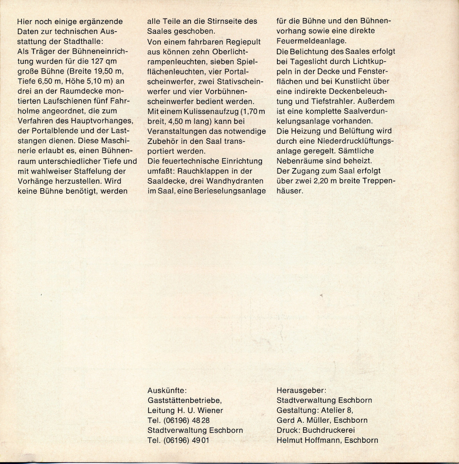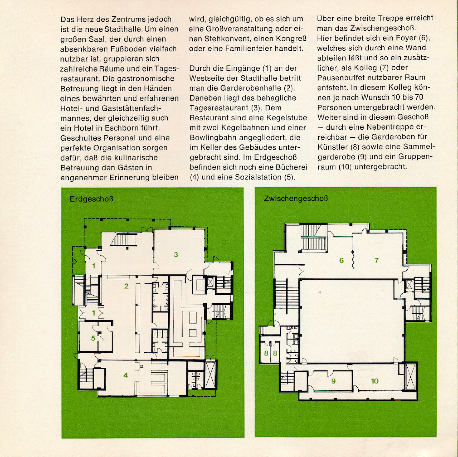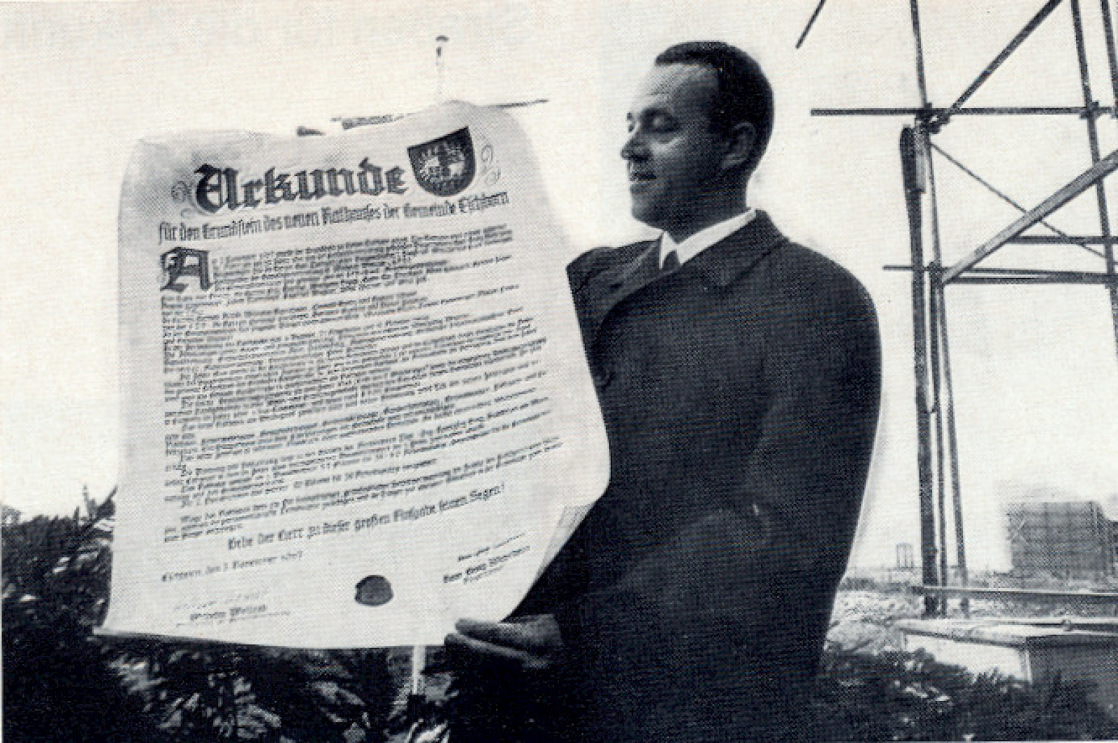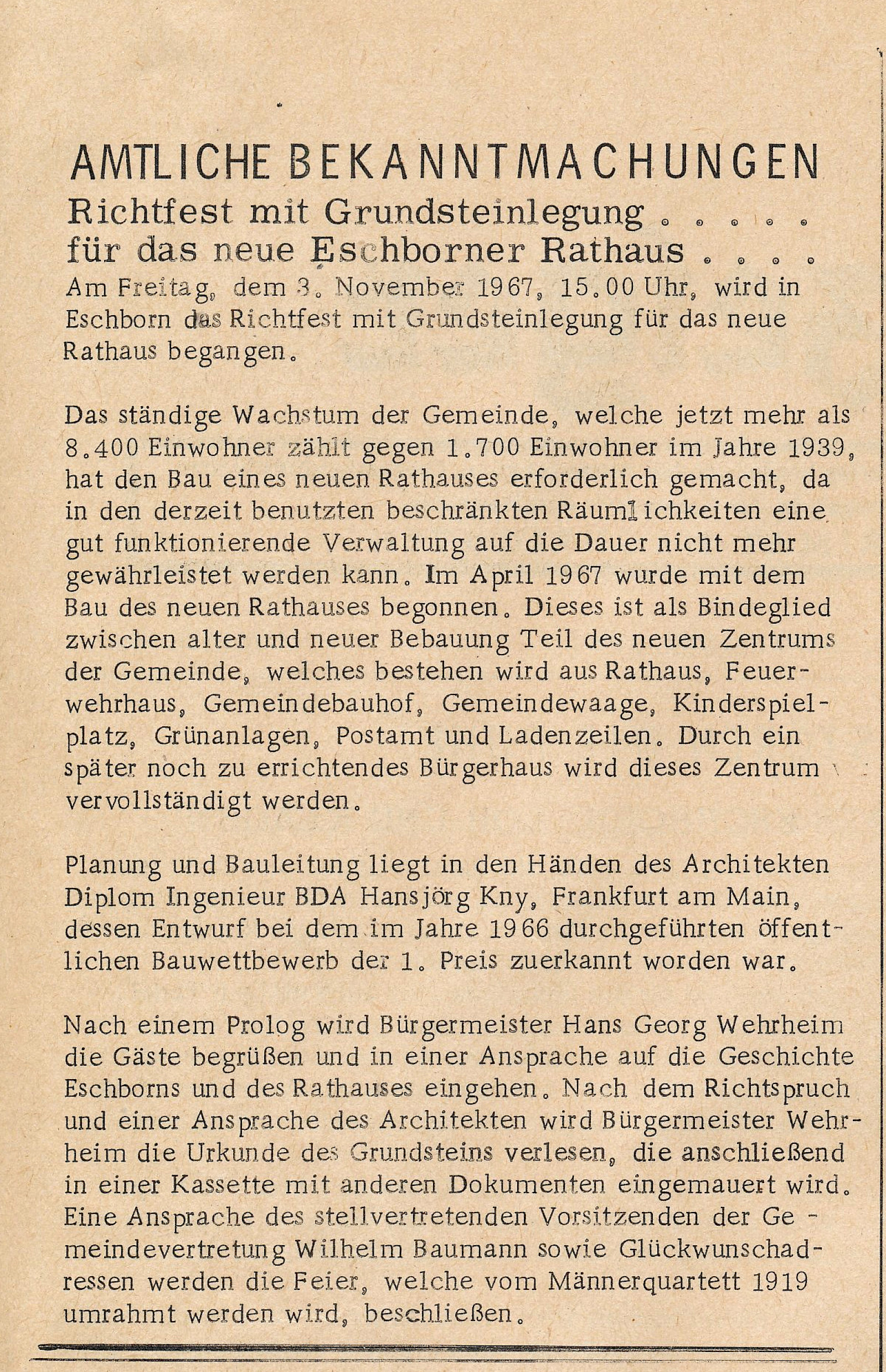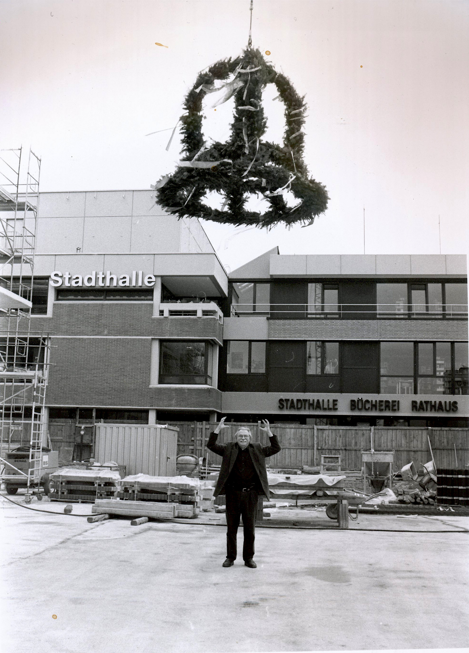 1967 1968 1970 1990 1992 1996 1967 Am 3. November finden Richtfest und Grundsteinlegung für das neue Eschborner Rathaus statt. Umgesetzt wird der Entwurf des Frankfurter Architekten Hansjörg Kny, der im März 1966 als Sieger eines landesoffenen Wettbewerbs ausgezeichnet wurde: Kny hatte, wie gefordert, das Rathaus mit Stadthalle als Teil eines Gemeinschaftszentrums geplant. Dieses ist als neue Stadtmitte der schnell wachsenden Kommune südlich das Atstadtrandes an der Nahtstelle zu den neuen Stadtgebieten platziert, um die Stadtteile miteinander zu verbinden. Nach nur sieben Monaten Bauzeit werden Richtfest und Grundsteinlegung für das neue Rathaus zusammen zelebriert: Bürgermeister Hans Georg Wehrheim legt dem Grundstein eine Urkunde bei. 1968 Das neue Rathaus wird am 12. Juli feierlich eingeweiht. Die Bauzeit für den ersten Bauabschnitt der neuen Stadtmitte betrug gerade einmal 13 Monate. Eine Erweiterungsmöglichkeit des Rathauses war schon damals als winkelförmiger Flügel nach Süden vorgesehen. 1970 Im Juni wird die Sadthalle anlässlich der 1200-Jahrfeier zur Verleihung der Stadtrechte für Eschborn eingeweiht. Die stattliche Halle wurde als zweiter Bauabschnitt des Gemeinschaftszentrums unmittelbar nach Fertigstellung des Rathauses 1969 / 70 errichtet und ist als Veranstaltungsort mit mannigfaltigen Nutzungsmöglichkeiten eine echte Bereicherung für das kulturelle Leben Eschborns. 1990 Die stark wachsende Zahl der städtischen Mitarbeiter/innen macht eine Erweiterung des Rathauses erforderlich. Durch das schnelle Wachstum der Kommune und die steigende Anzahl an Stadtverordenten wird außerdem ein größerer Sitzungssaal benötigt. Die Rathauserweiterung wird durch den Architekten Wilfried Gladis, einem langjährigen Mitarbeiter von Hansjörg Kny, geplant. Der L-förmige Anbau nach Süden umfasst mit einem winkelförmigen Büroflügel den mit einem Zeltdach überdeckten Sitzungssaal, der unmittelbar an die Stadthalle angebaut wird. 1992 Der letzte Bauabschnitt des Ensembles am Rathausplatz wird fertiggestellt: In den Baumassenversatz von Rathaus und Stadthalle wird die Stadtbücherei eingefügt, die das Bild des Platzes völlig verändert. Der Eingang im Erdgeschoss wird neu geordnet. Rampen für Rollstuhlfahrer und ein Aufzug werden eingebaut. 1996 Die bestehende Ladenzeile mit Arkade auf dem Rathausplatz wird abgebrochen, um Platz für einen zweischiffigen Neubau zu machen, der zur Kurt-Schumacher-Straße drei Geschosse und zur Stadthalle zwei Geschosse zeigt. Gleichzeitig wird die Apotheke errichtet, die im Erdgeschoss eines punktförmigen Anbaus liegt, der hinter den REWE-Markt gestellt wird. In diesem Zusammenhang wird auch eine Tiefgarage unter dem kompletten Rathausplatz errichtet. Über die aktuellen Entwicklungen informieren wir Sie in unserem Bauticker. »