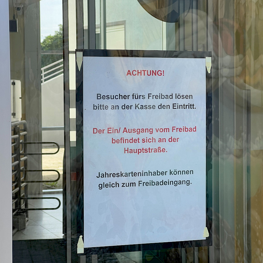 Wegen der anstehenden Erdarbeiten auf dem Gelände wurde der Eingang ins Freibad in die Hauptstraße verlegt. Der Eintritt wird – wie gehabt – an der Hauptkasse bezahlt. Alle Besucherinnen und Besucher mit gültiger Jahreskarte, können direkt den neuen Freibadeingang benutzen. Auch das Verlassen des Freibadgeländes ist aktuell nur über die Hauptstraße möglich.