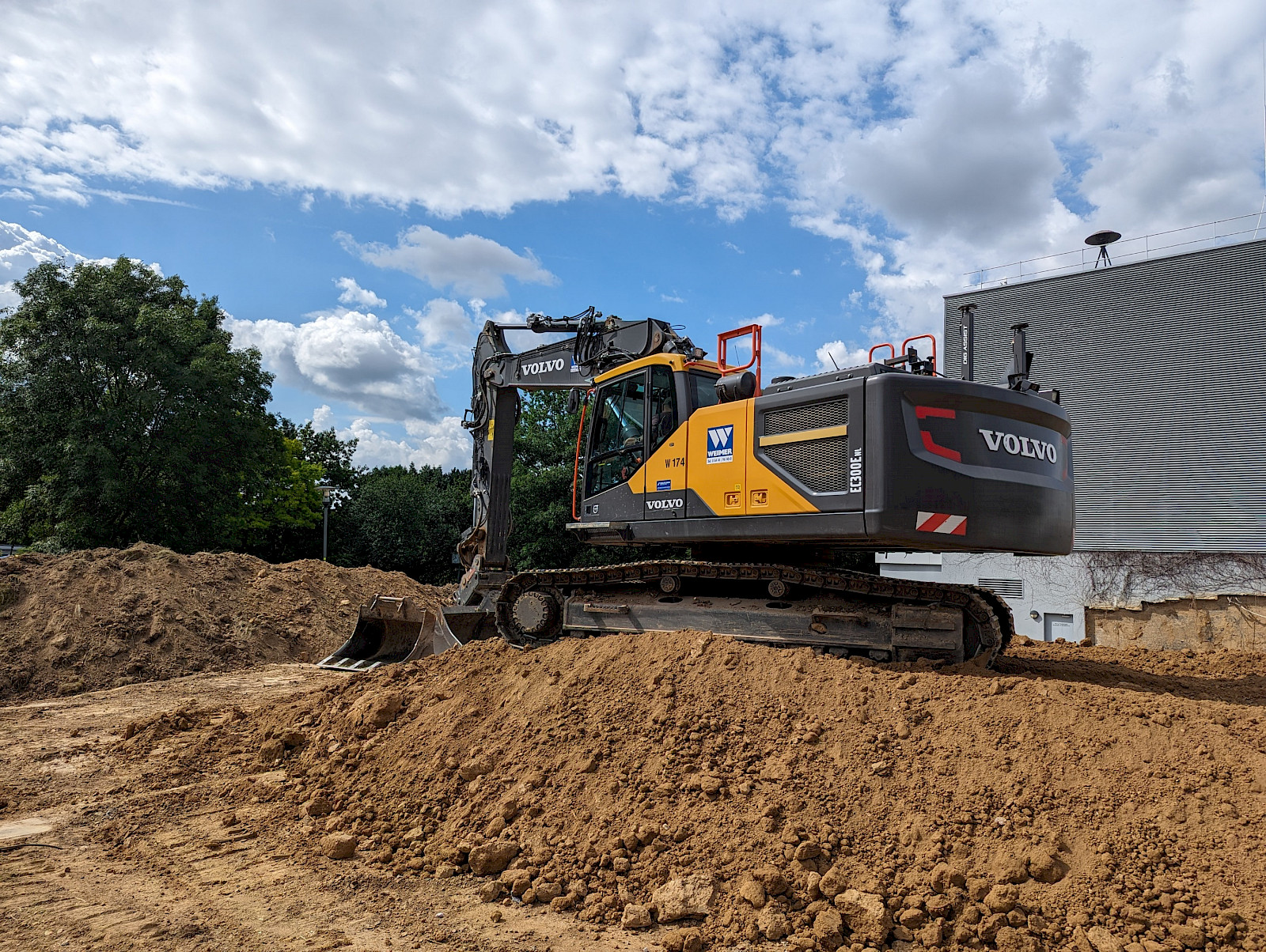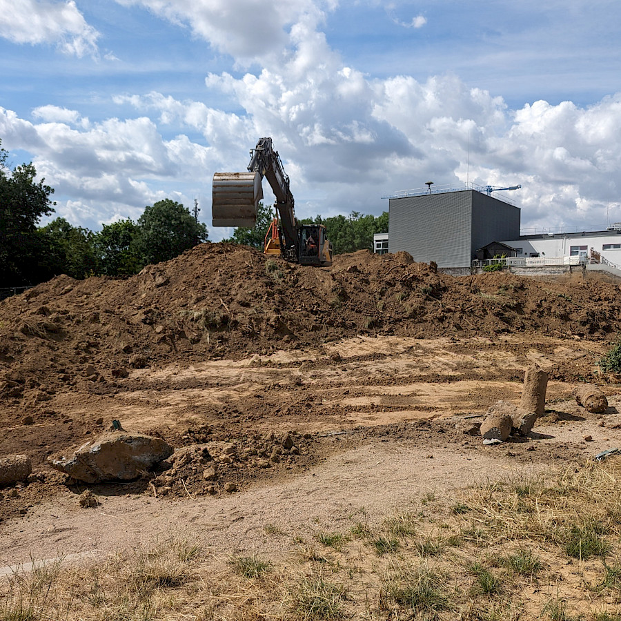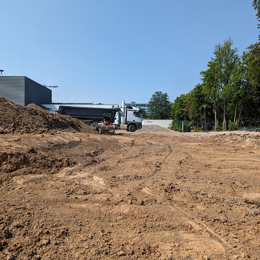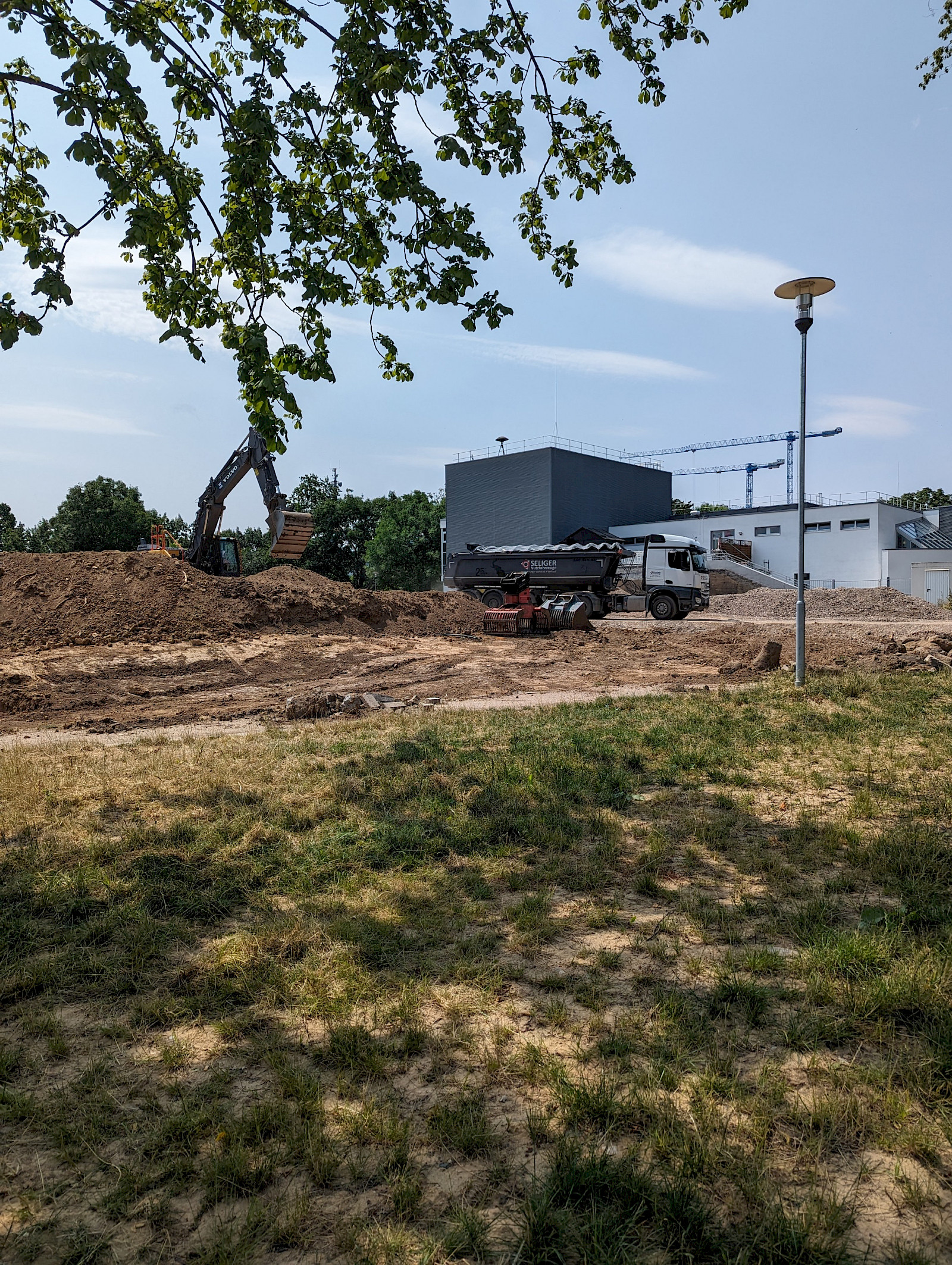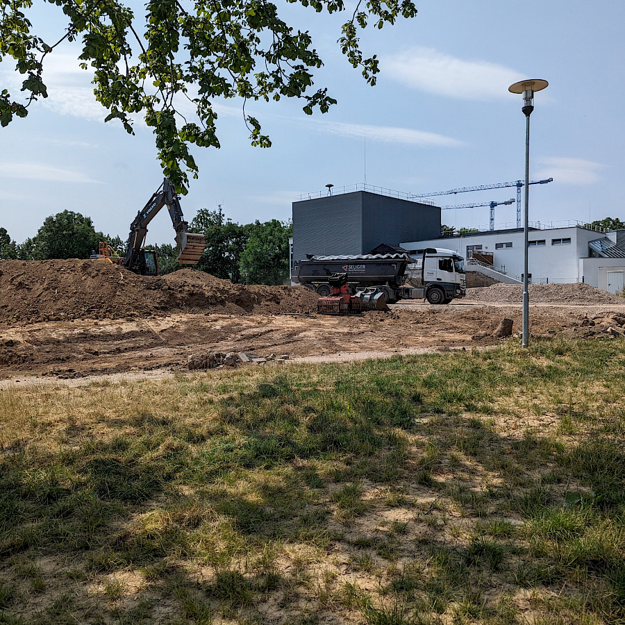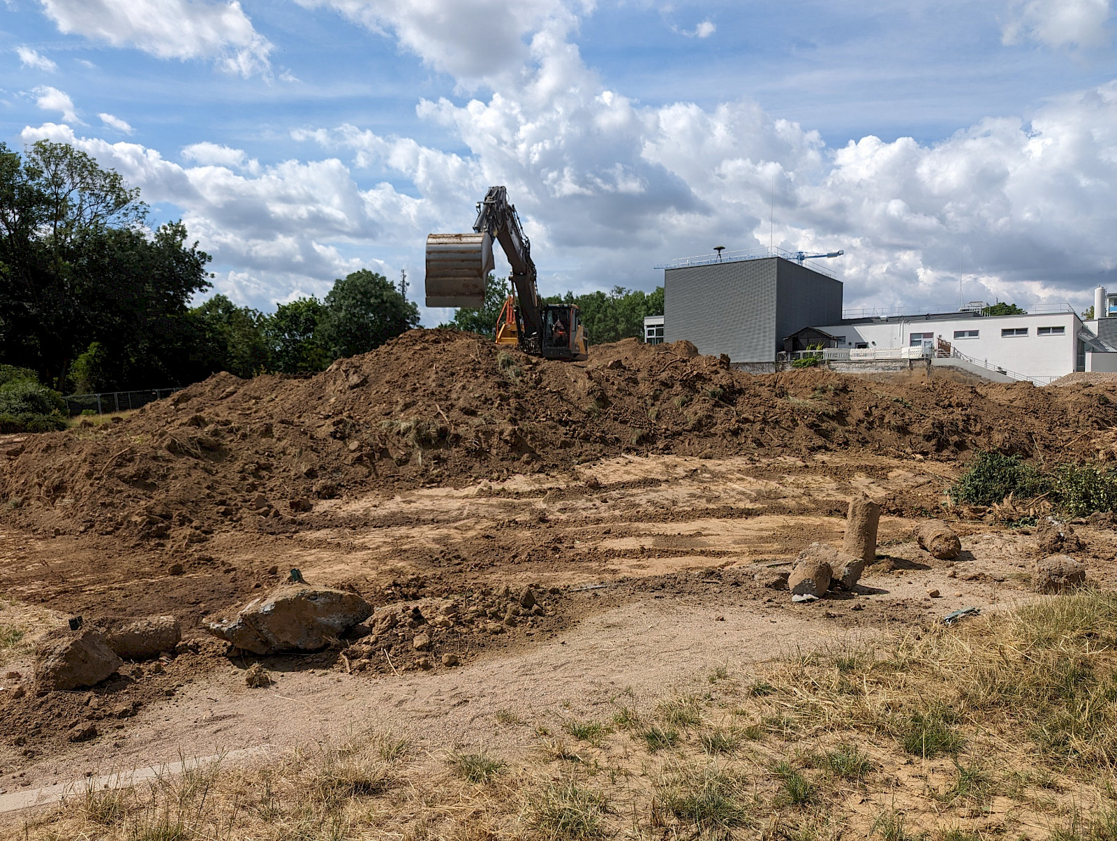 Die Erdarbeiten haben begonnen. Dabei wird eine ganze Menge bewegt: Zur Abfuhr des Erdaushubs sind aktuell 50 bis 60 Fahrbewegungen pro Tag nötig.