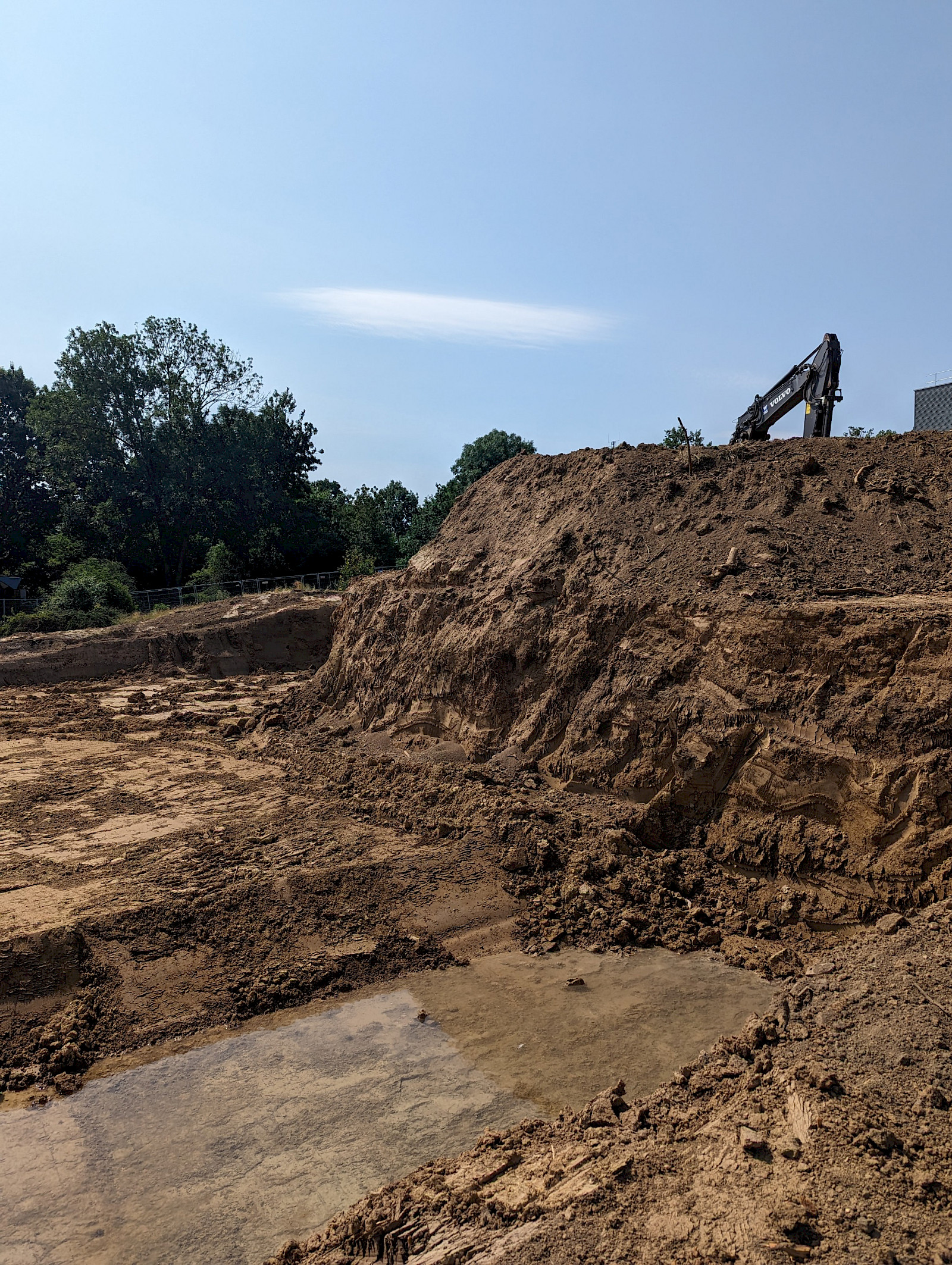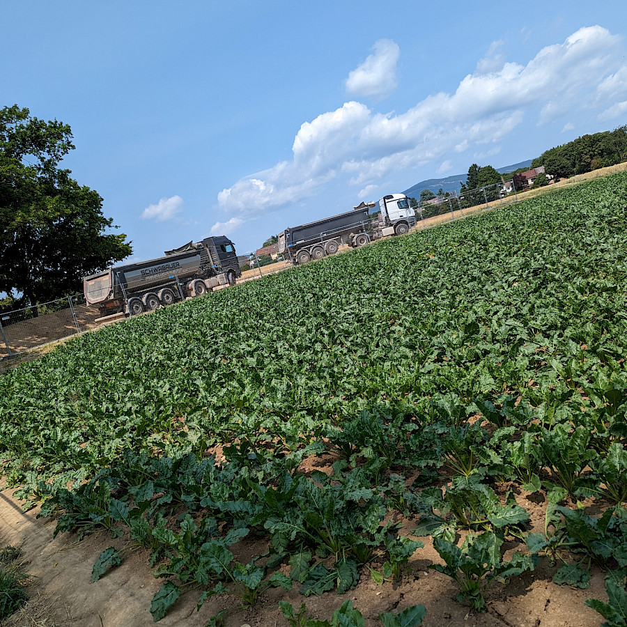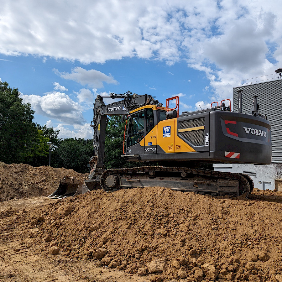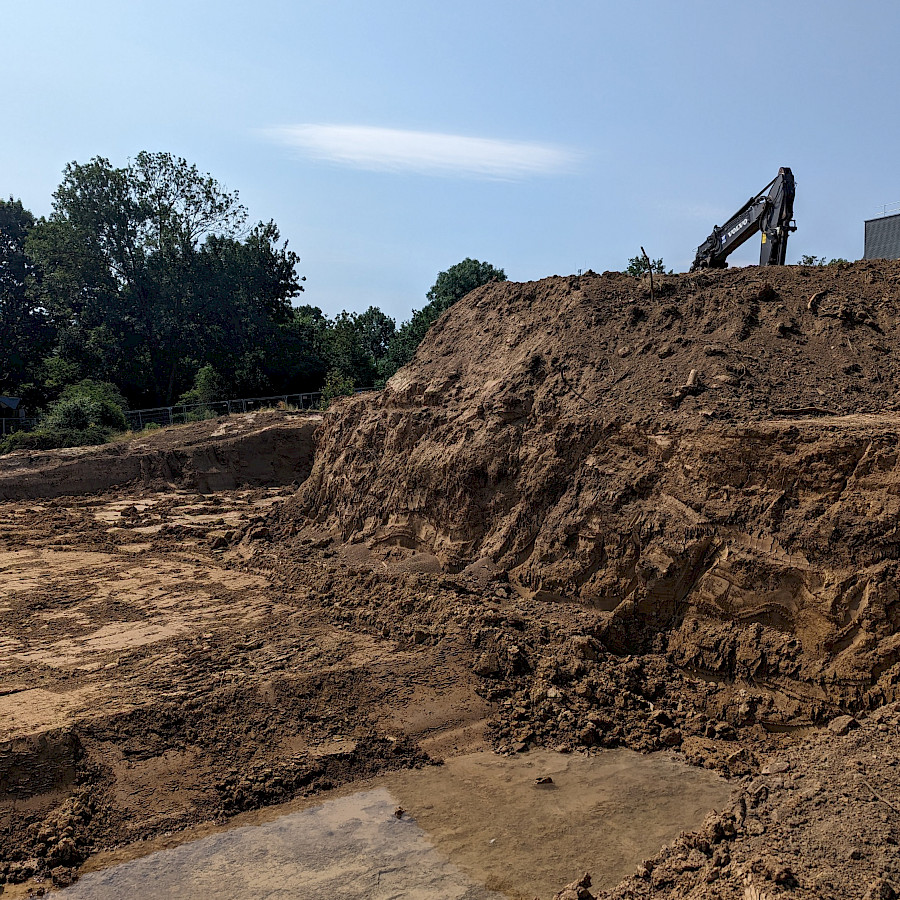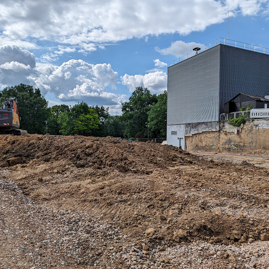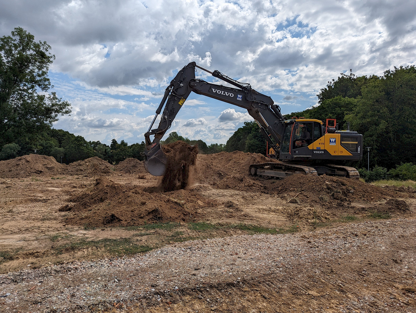 Die Erdarbeiten haben begonnen. Dabei wird eine ganze Menge bewegt: Zur Abfuhr des Erdaushubs sind aktuell 50 bis 60 Fahrbewegungen pro Tag nötig.