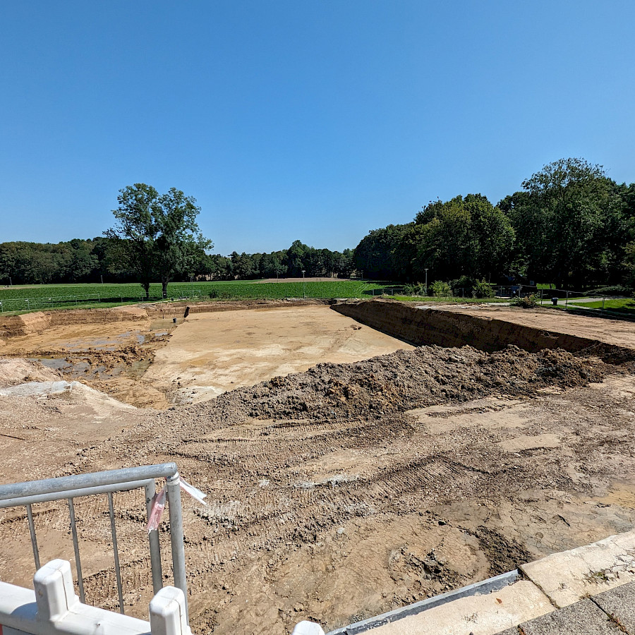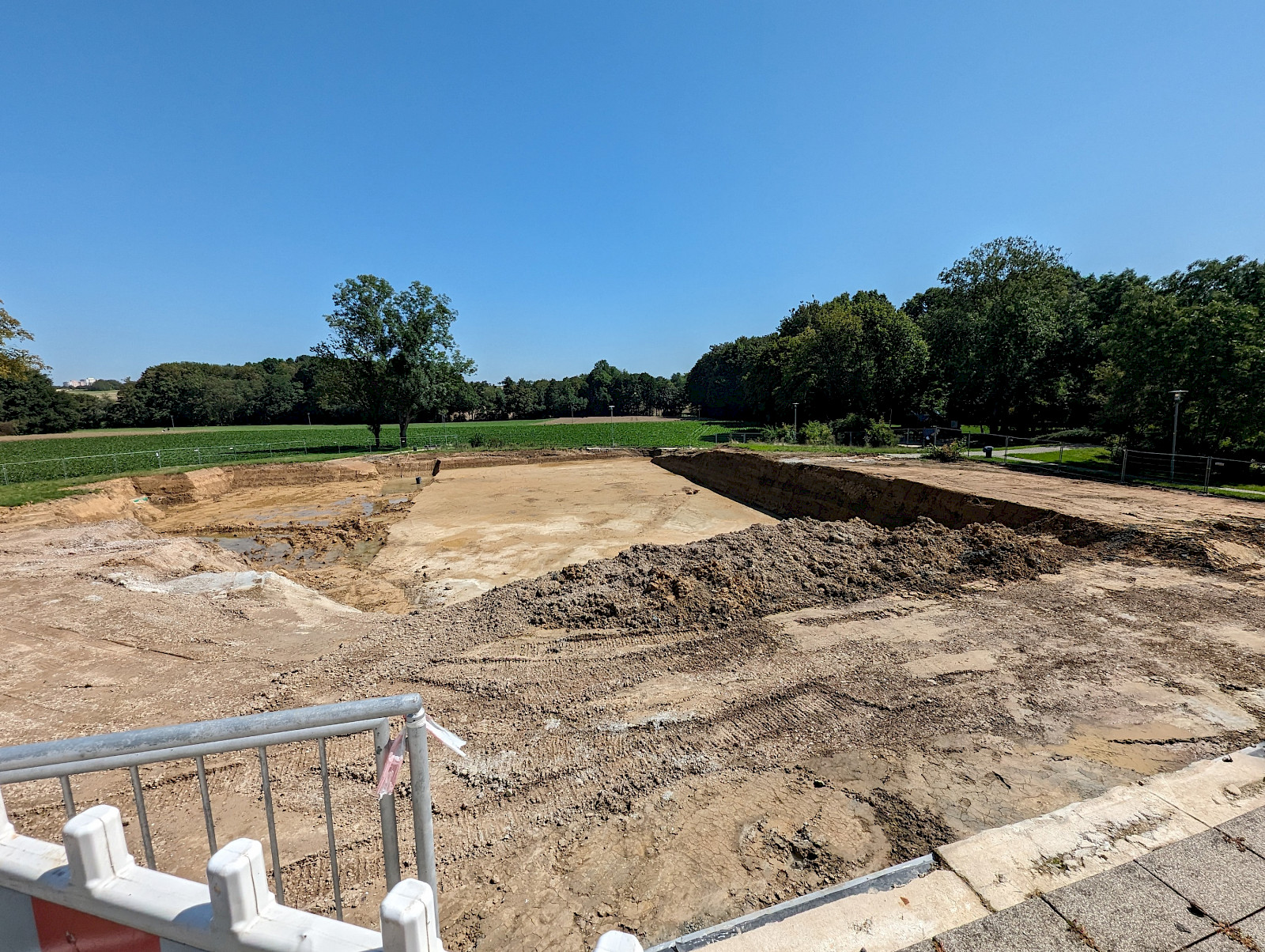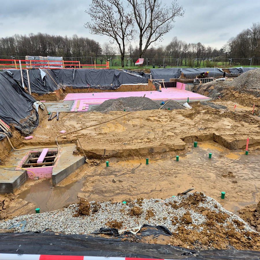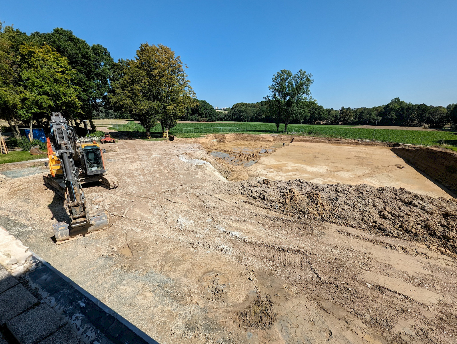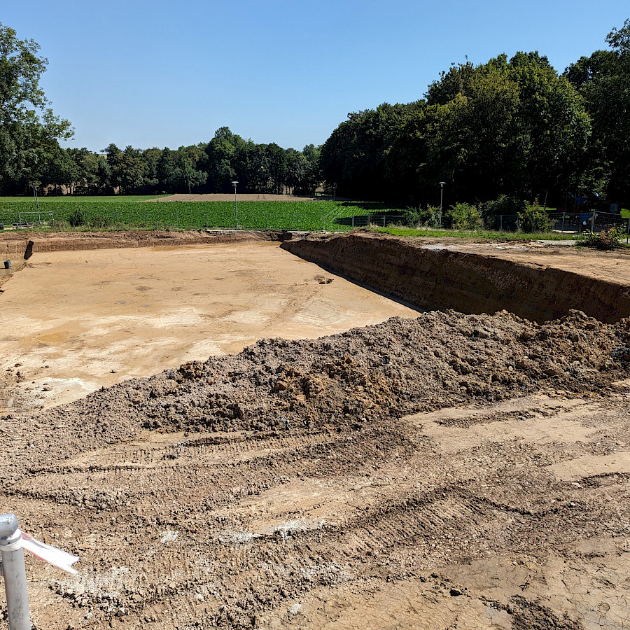Die Baugrube für die neue Schwimmhalle ist in den letzten Wochen um einiges größer geworden. Langsam lassen sich die Dimensionen des Neubaus deutlicher erkennen.