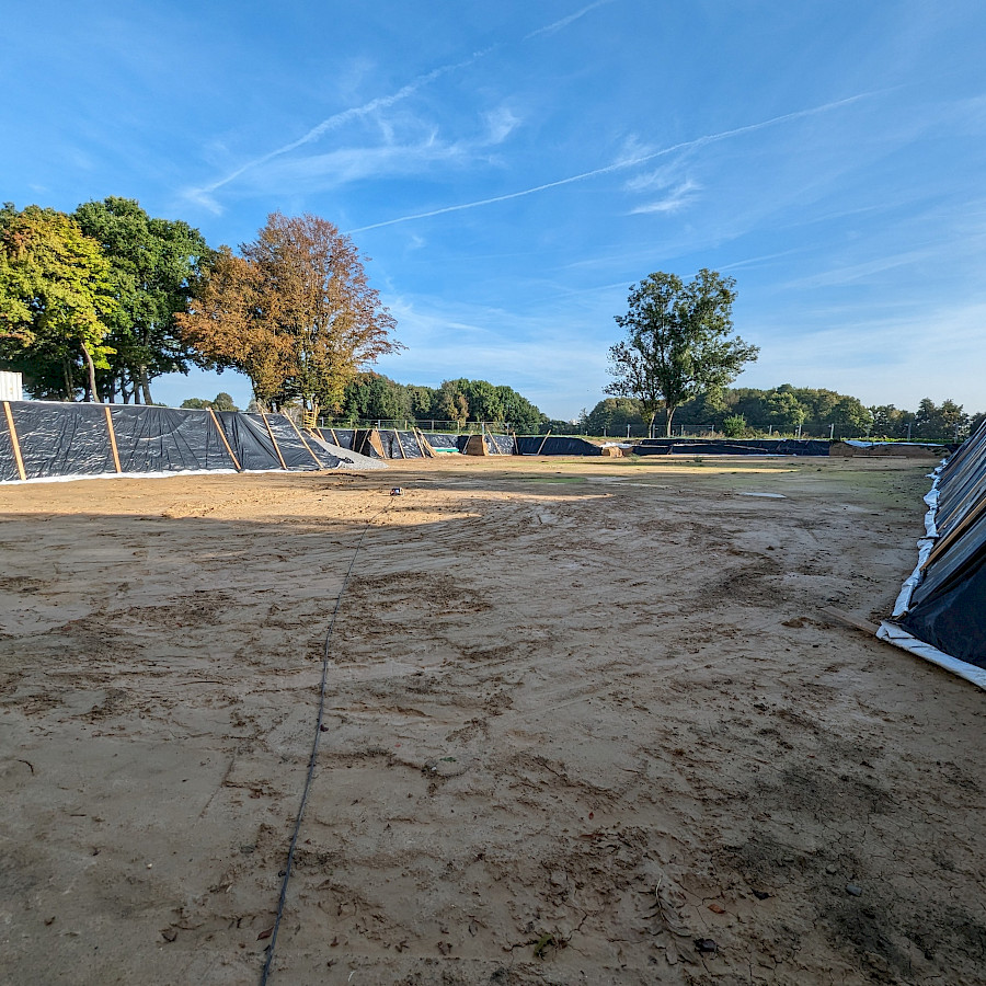 Im Bereich der Zimmererarbeiten werden aktuell die Dachbinder an die baulichen Gegebenheiten angepasst – ihre Montage ist für Ende September geplant. Die Abdichtungsarbeiten an den Dächern von Umkleiden und Foyer sind bereits abgeschlossen.