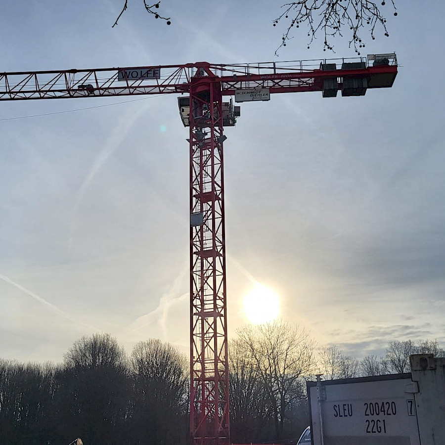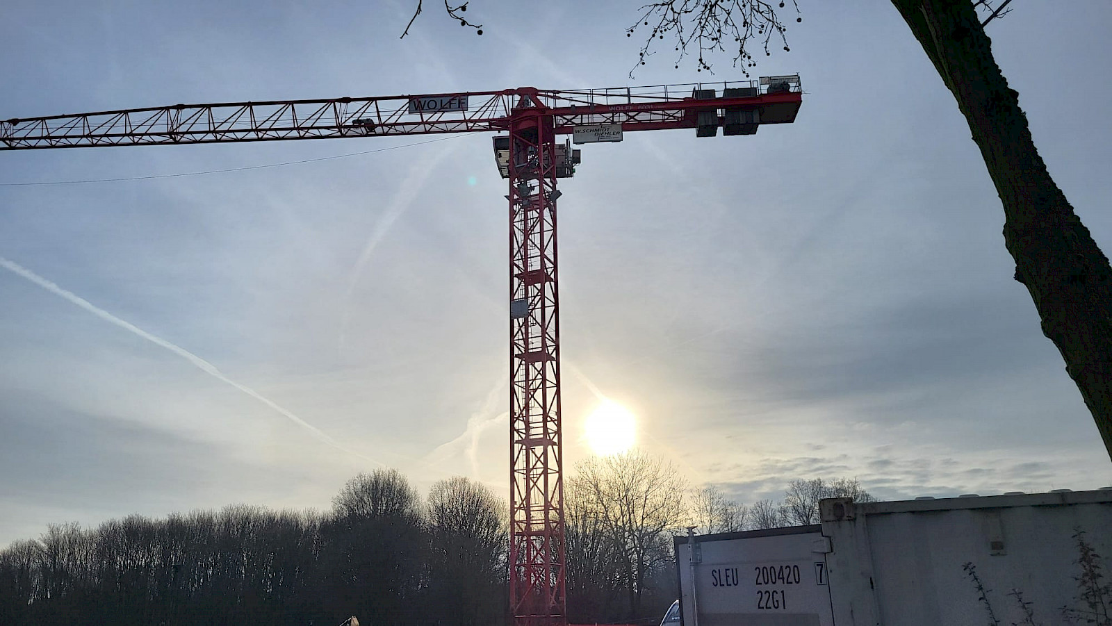 Ab heute ist die Baustelle am Wiesenbad weithin sichtbar: Der Kran ist fertig montiert.