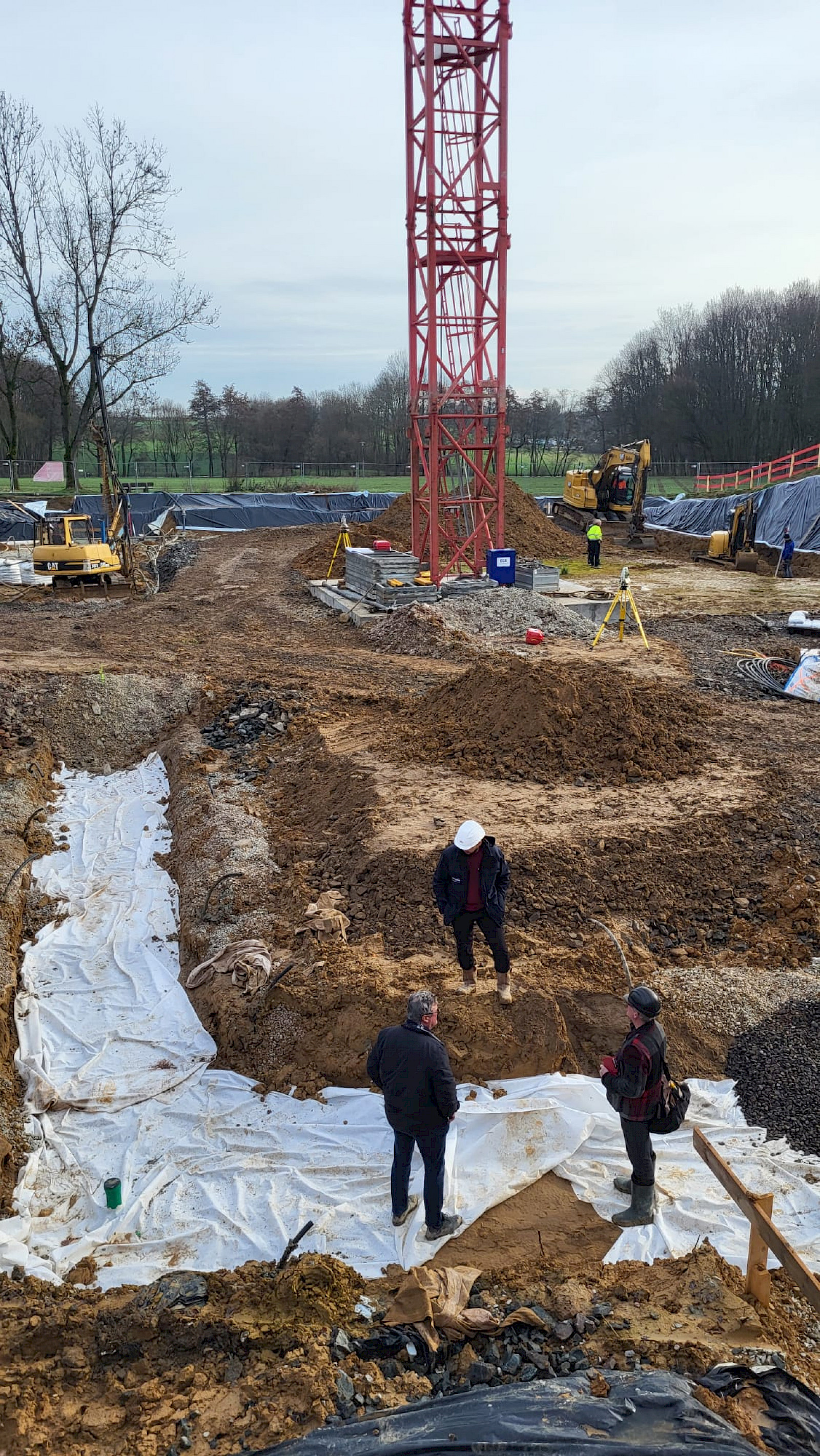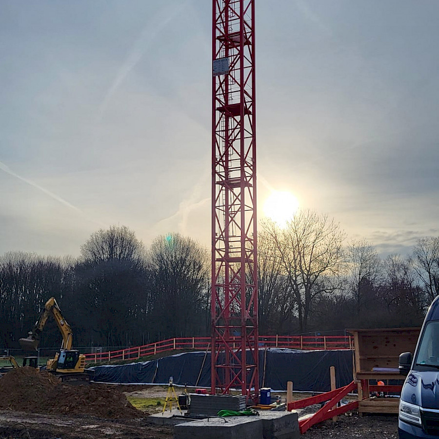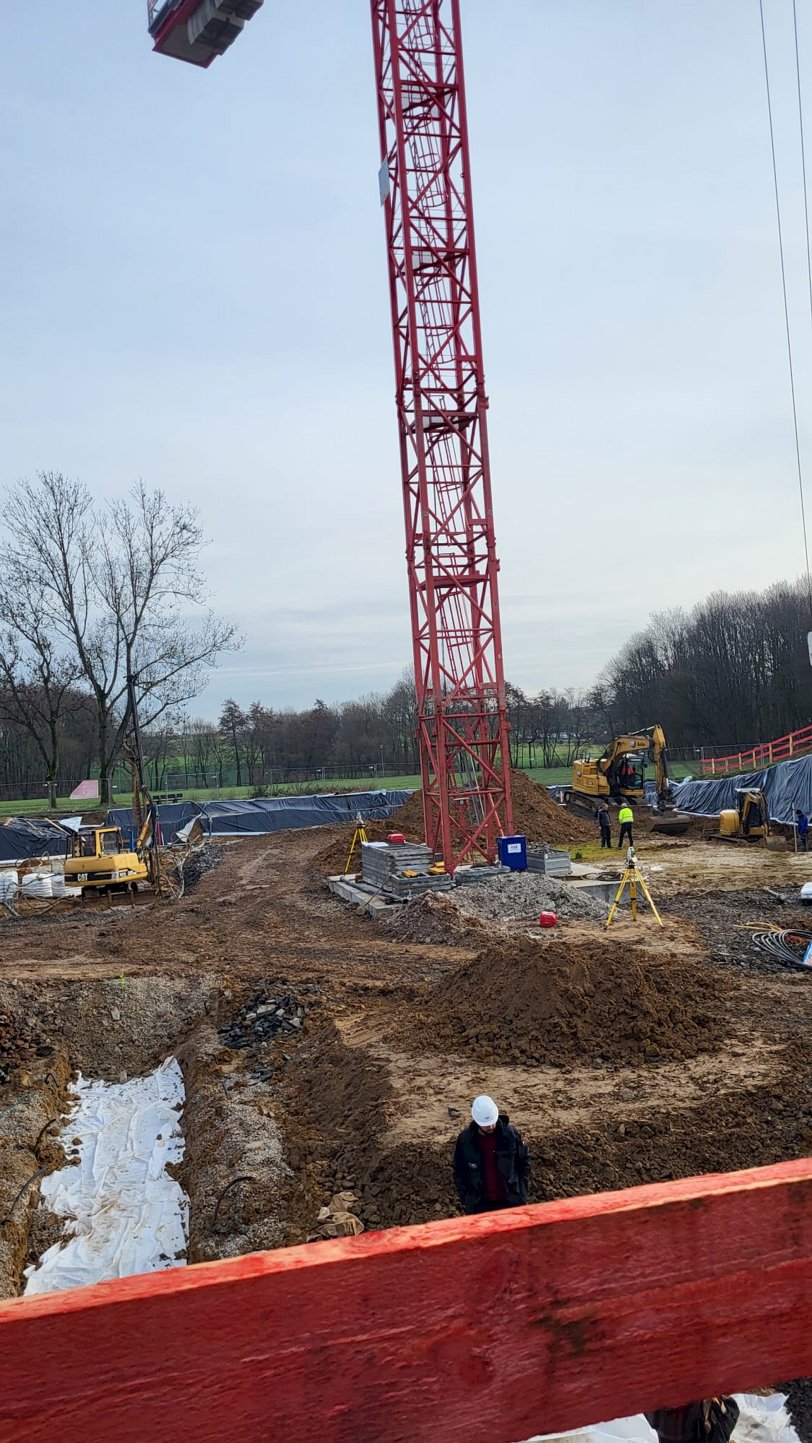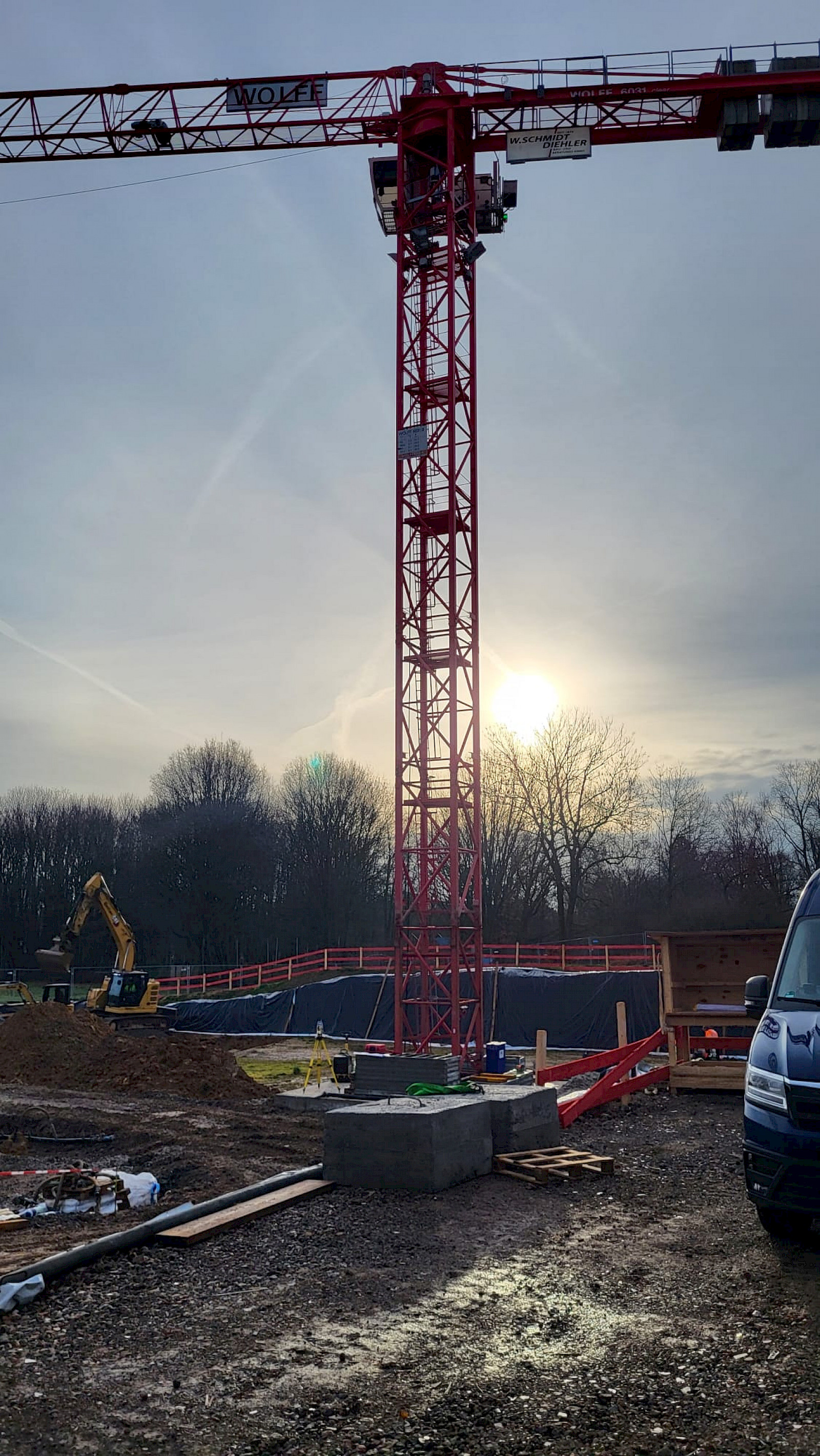 Auf der Baustelle gibt es reichlich positive Entwicklungen: Der Antrag beim Amt für Wasser und Umwelt für die Wasserhaltung und Grundwasserabsetzung wurde Mitte Dezember genehmigt. Die für einen reibungslosen Zugang notwendigen Baustraßen wurden bereits im Dezember fertiggestellt – eine zeitaufwändige Aufgabe, für die diverse gutachterliche Stellungnahmen und Abstimmungen erforderlich waren. Auch die Container für die Baustelleneinrichtung wurden im Dezember erfolgreich geliefert und angeschlossen. Die Brunnenbauer konnten am 15. Januar mit den Bohrungen für die Wasserhaltung beginnen. Nach erfolgreicher Grundwasserhaltung können dann die Kranfundamente errichtet werden.