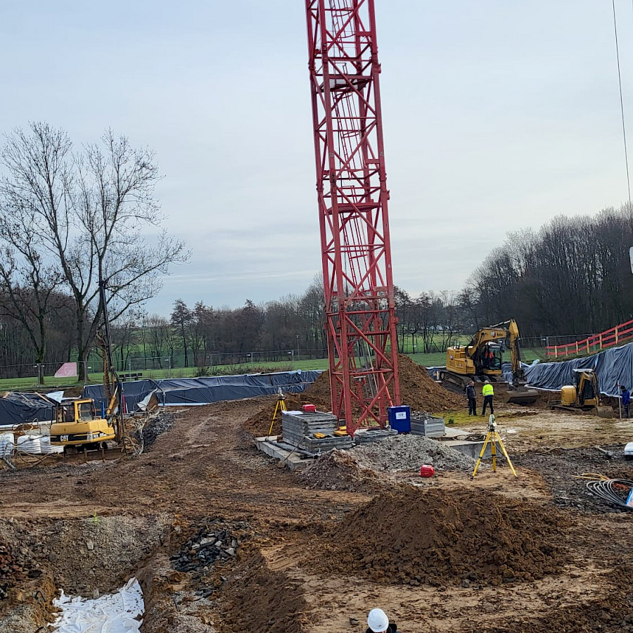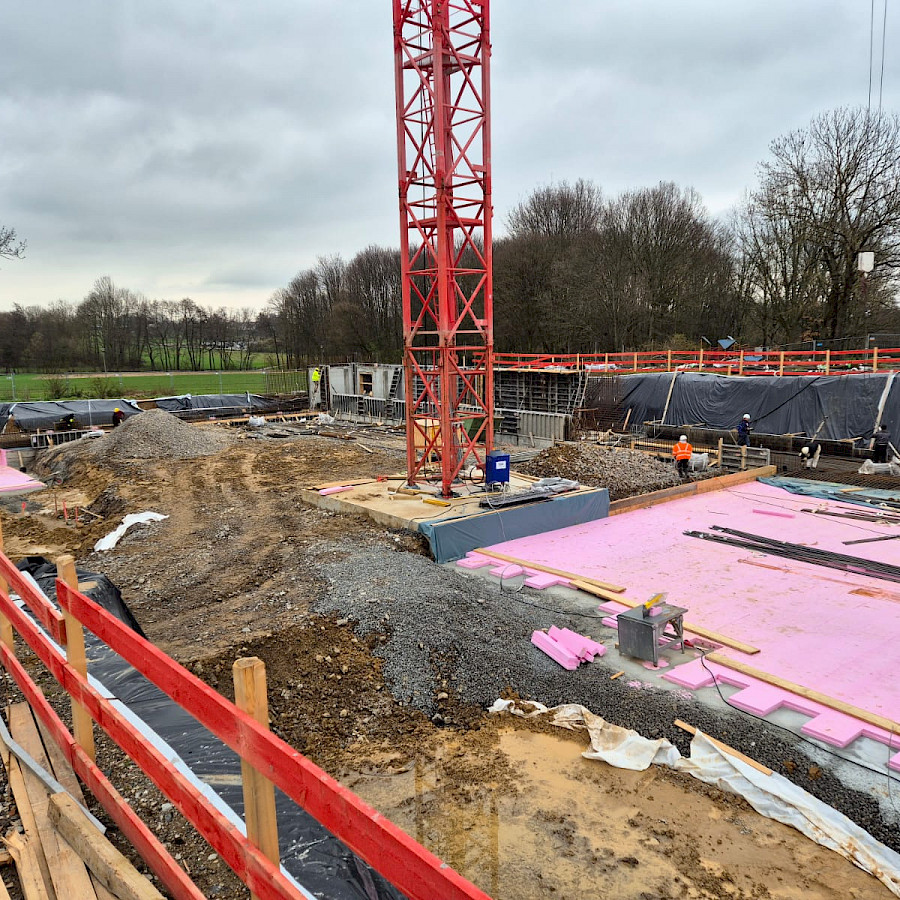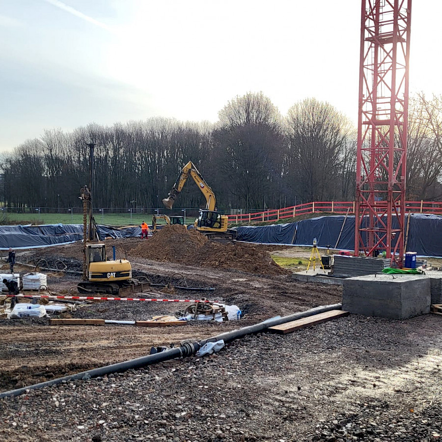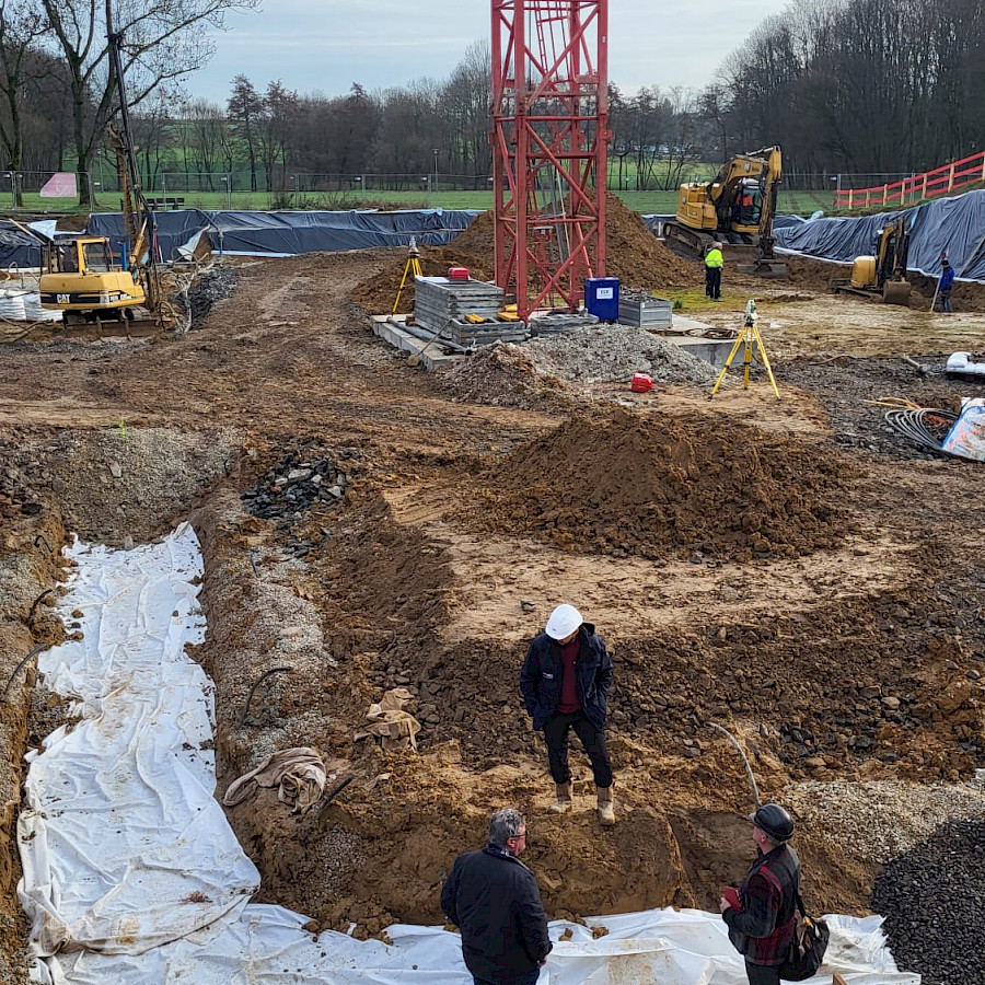 Auf der Baustelle gibt es reichlich positive Entwicklungen: Der Antrag beim Amt für Wasser und Umwelt für die Wasserhaltung und Grundwasserabsetzung wurde Mitte Dezember genehmigt. Die für einen reibungslosen Zugang notwendigen Baustraßen wurden bereits im Dezember fertiggestellt – eine zeitaufwändige Aufgabe, für die diverse gutachterliche Stellungnahmen und Abstimmungen erforderlich waren. Auch die Container für die Baustelleneinrichtung wurden im Dezember erfolgreich geliefert und angeschlossen. Die Brunnenbauer konnten am 15. Januar mit den Bohrungen für die Wasserhaltung beginnen. Nach erfolgreicher Grundwasserhaltung können dann die Kranfundamente errichtet werden.