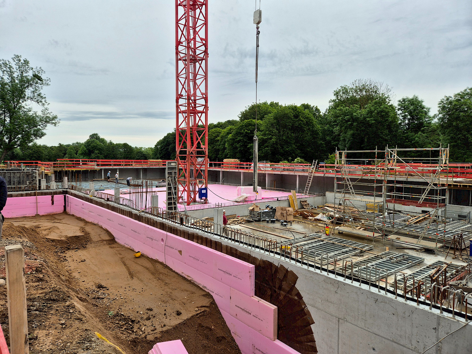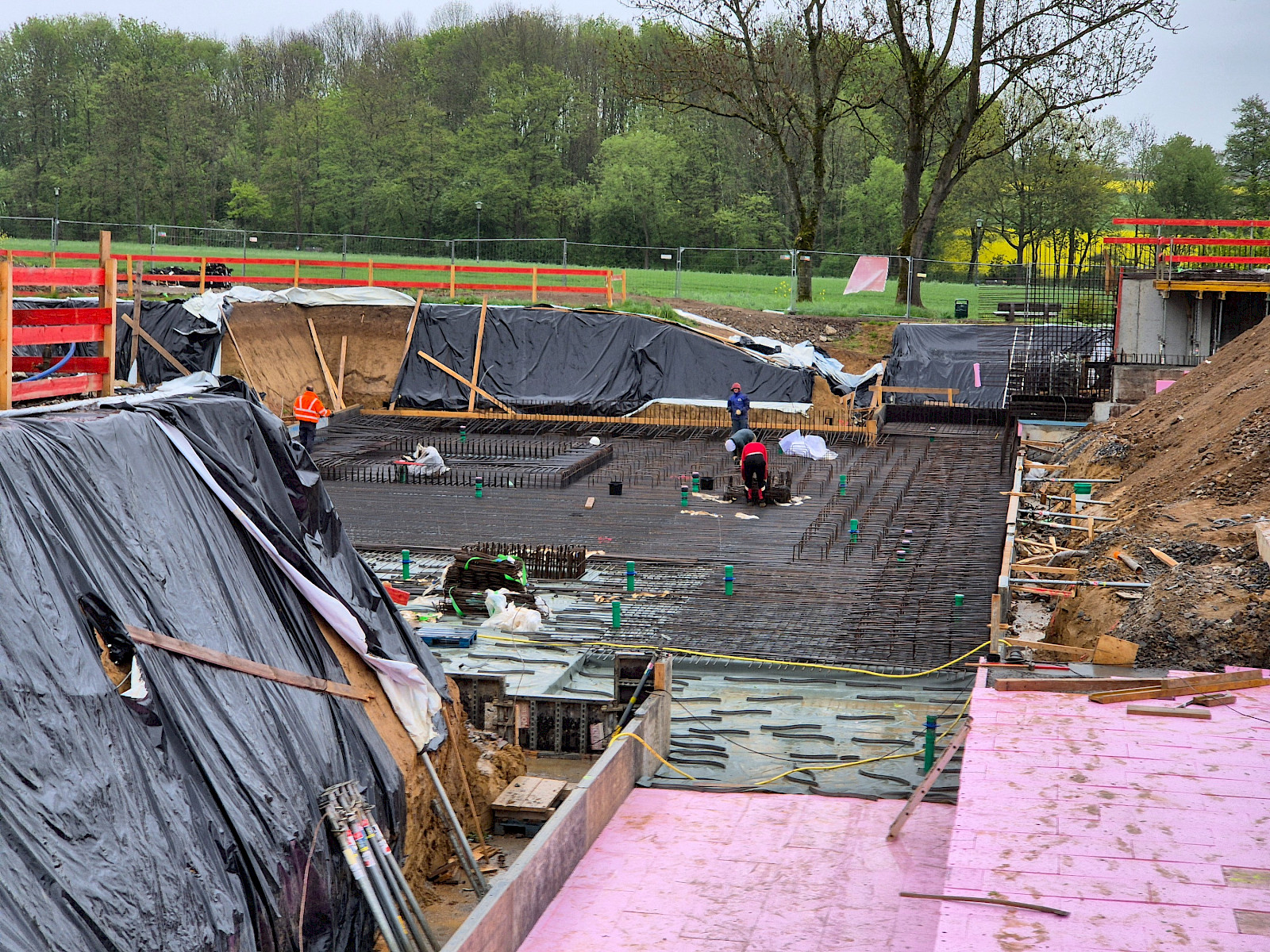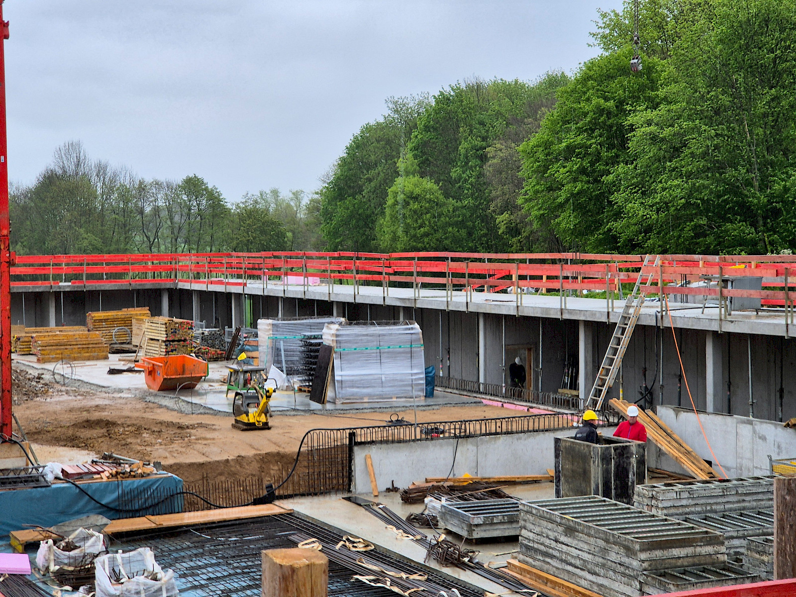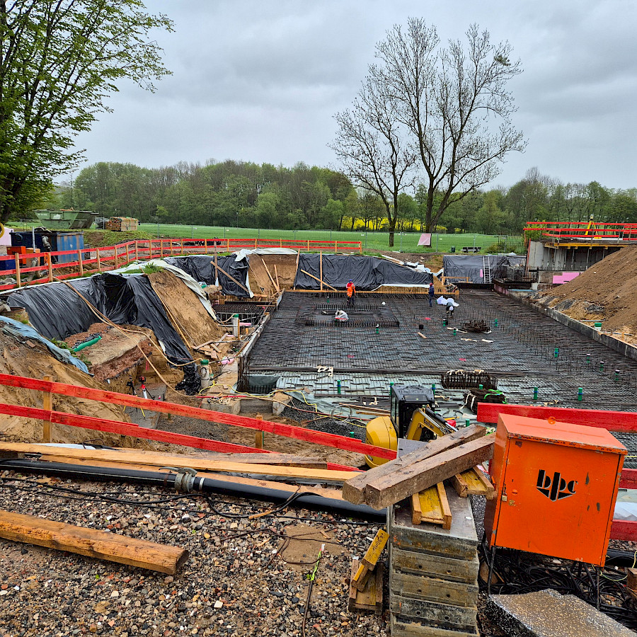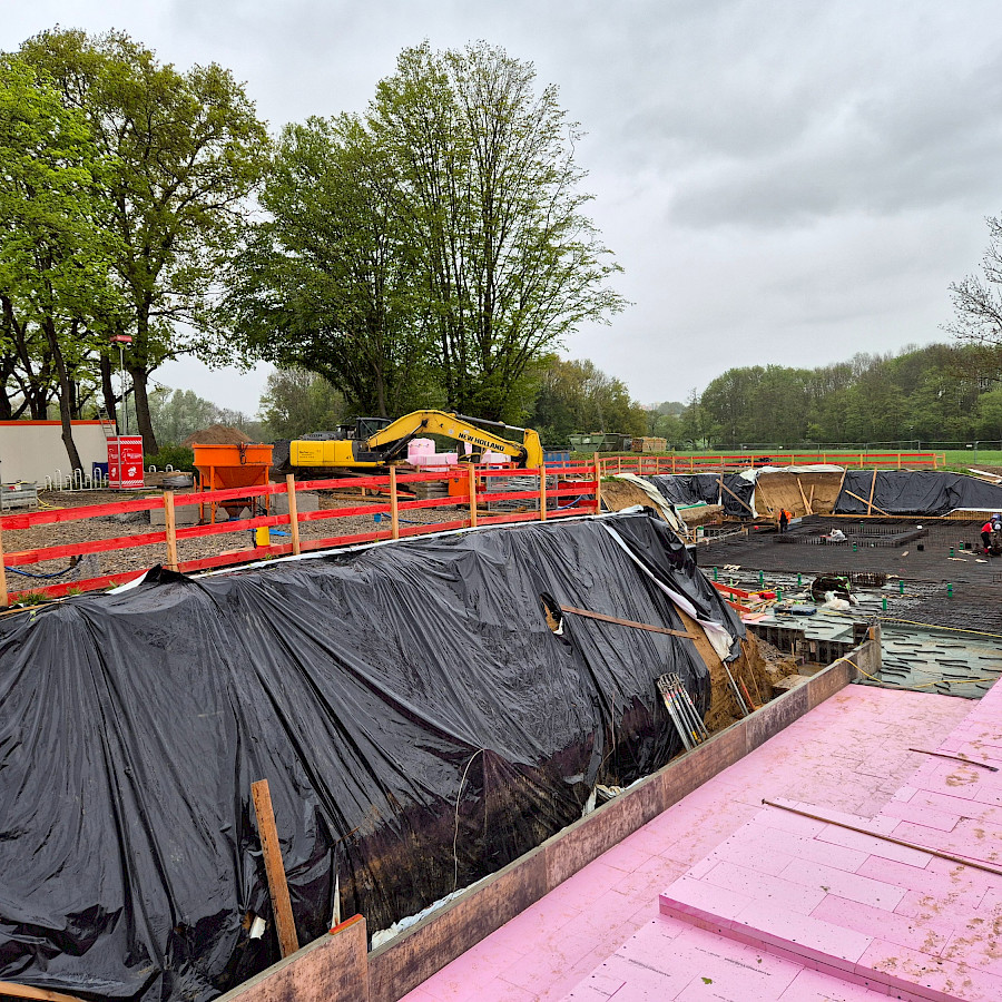 Seit der Grundsteinlegung Mitte April wurden auf der Baustelle erhebliche Fortschritte erzielt: Der erste Abschnitt der Becken-Bodenplatte ist bereits fertiggestellt, der zweite Abschnitt wird bis Freitag nachziehen. Auch der erste Abschnitt des Beckenumgangs und der Kellerdecke ist ausgeführt. Der Rohbau der Kelleraußenwände steht, die ersten Kellerräume und Kellerinnenwände sind schon gemauert.