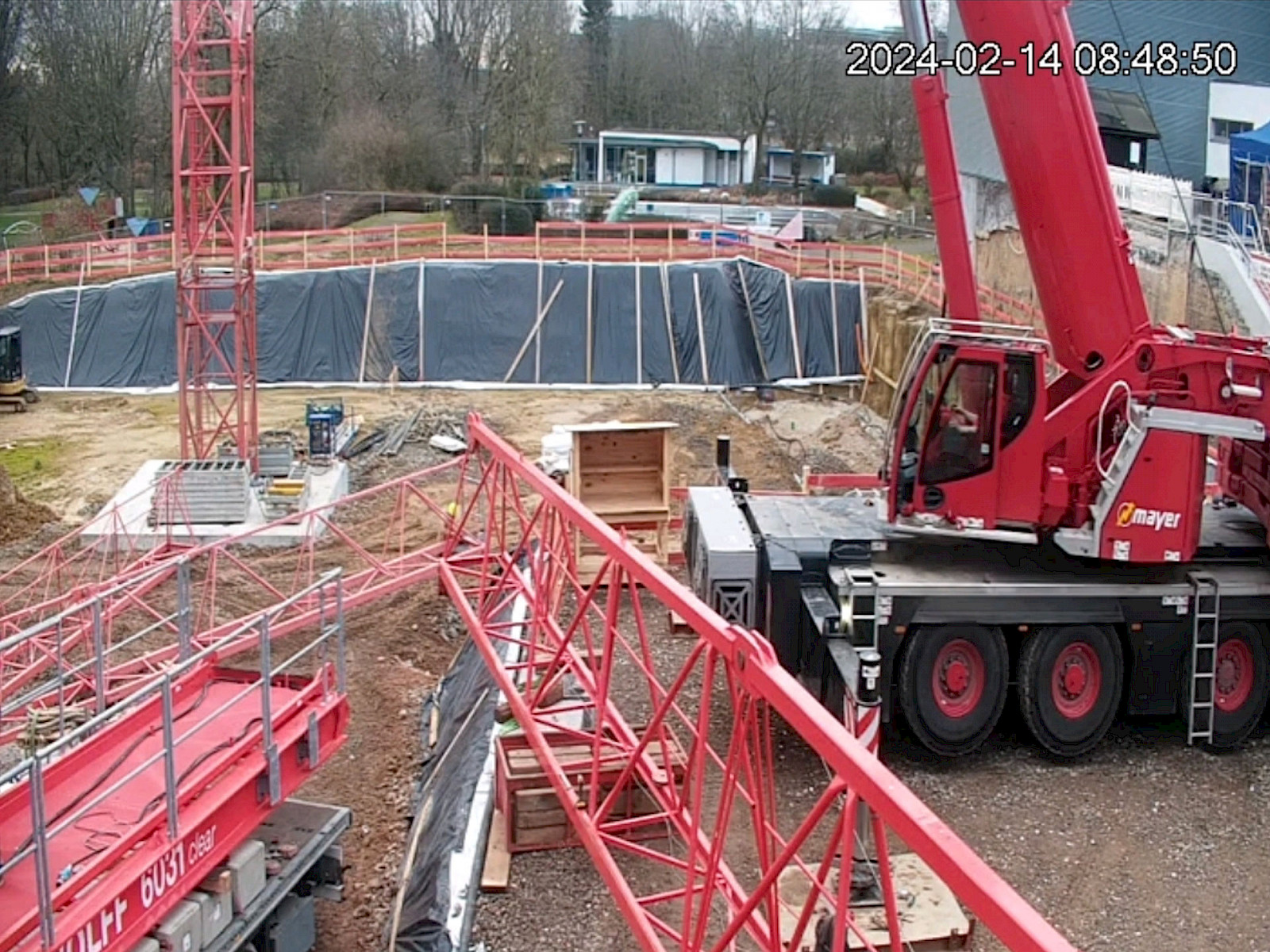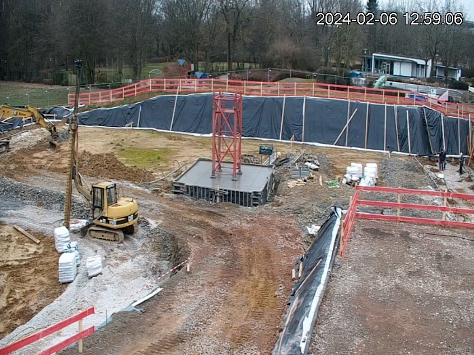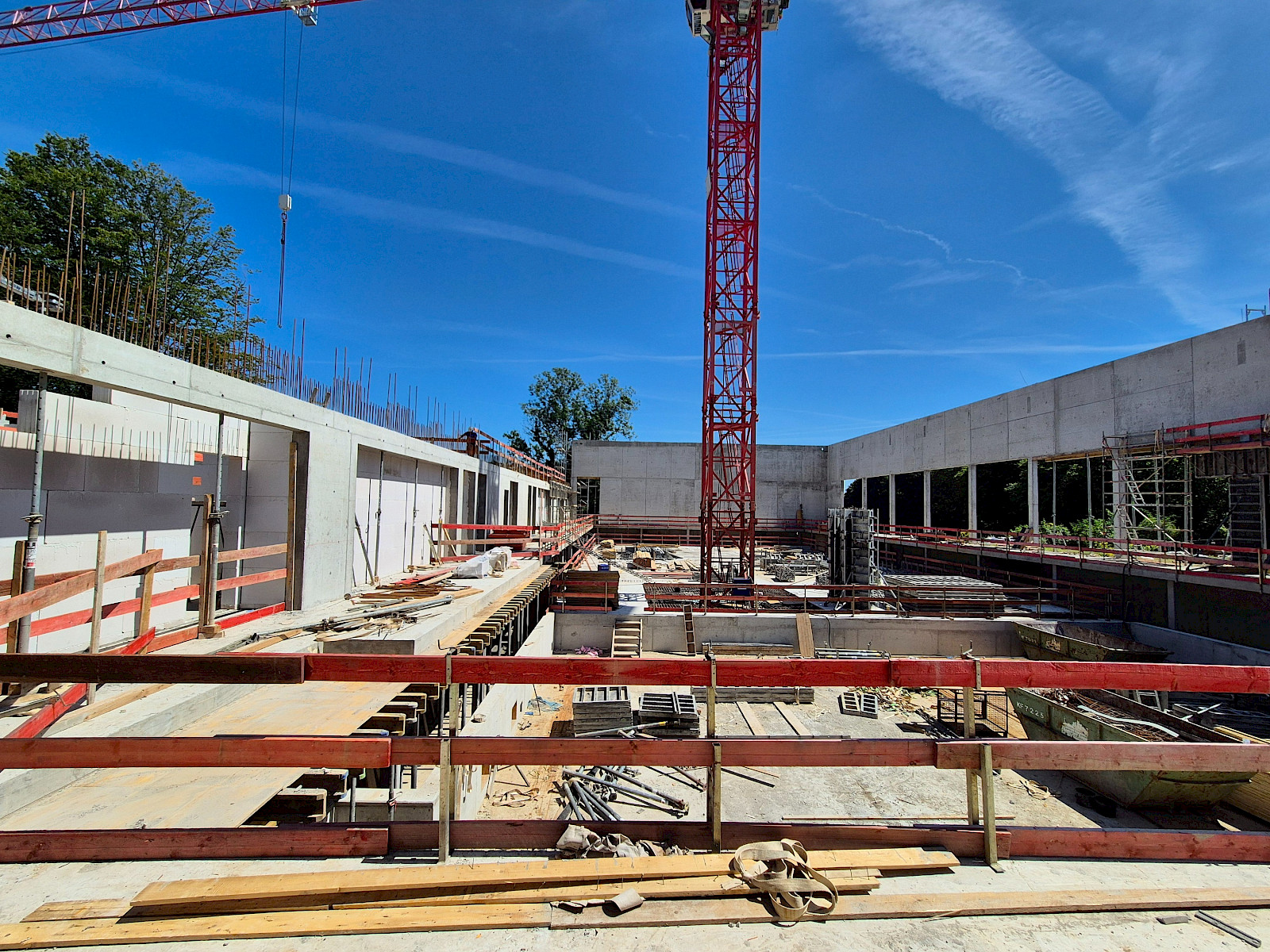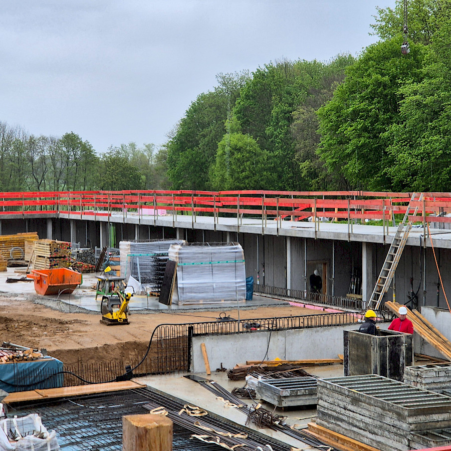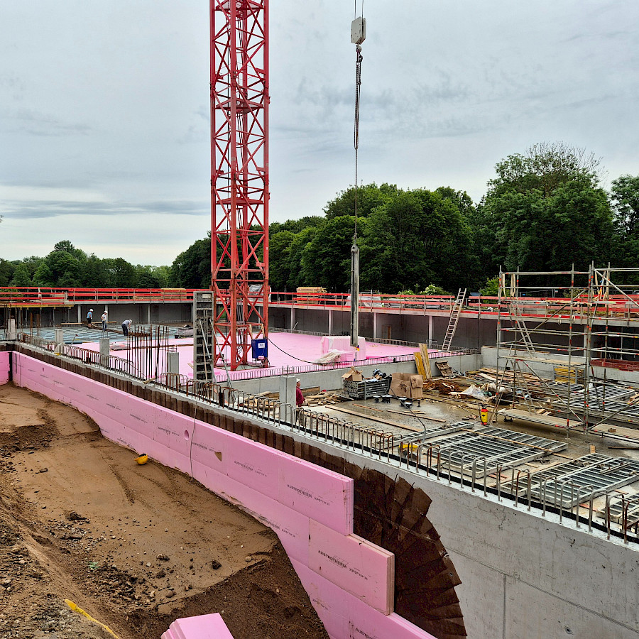 Seit der Grundsteinlegung Mitte April wurden auf der Baustelle erhebliche Fortschritte erzielt: Der erste Abschnitt der Becken-Bodenplatte ist bereits fertiggestellt, der zweite Abschnitt wird bis Freitag nachziehen. Auch der erste Abschnitt des Beckenumgangs und der Kellerdecke ist ausgeführt. Der Rohbau der Kelleraußenwände steht, die ersten Kellerräume und Kellerinnenwände sind schon gemauert.