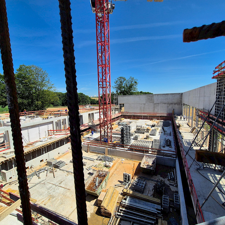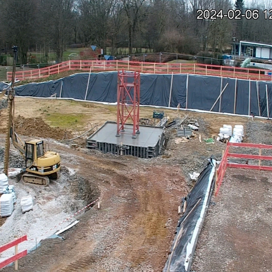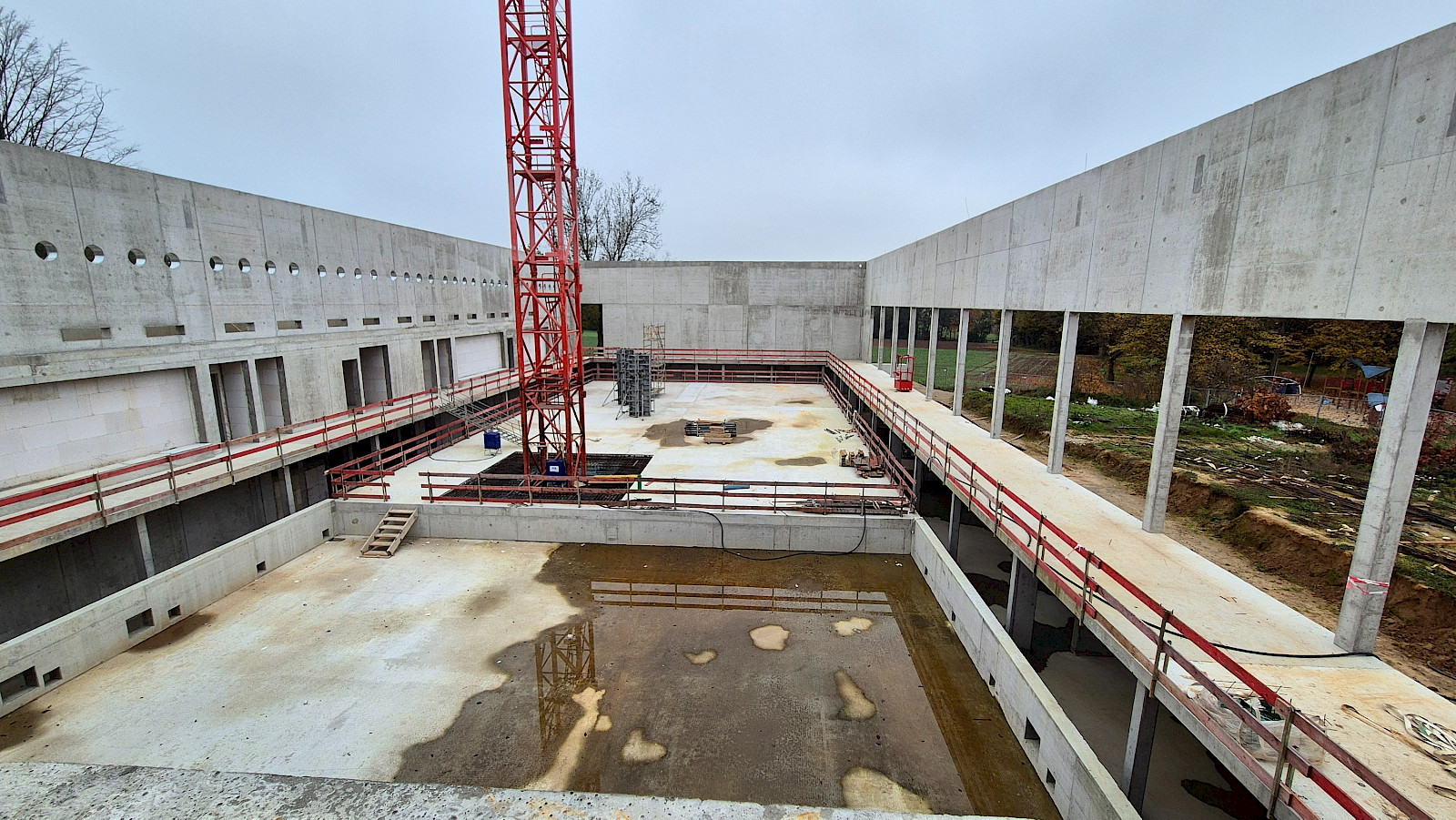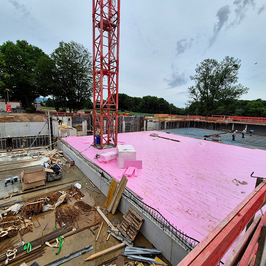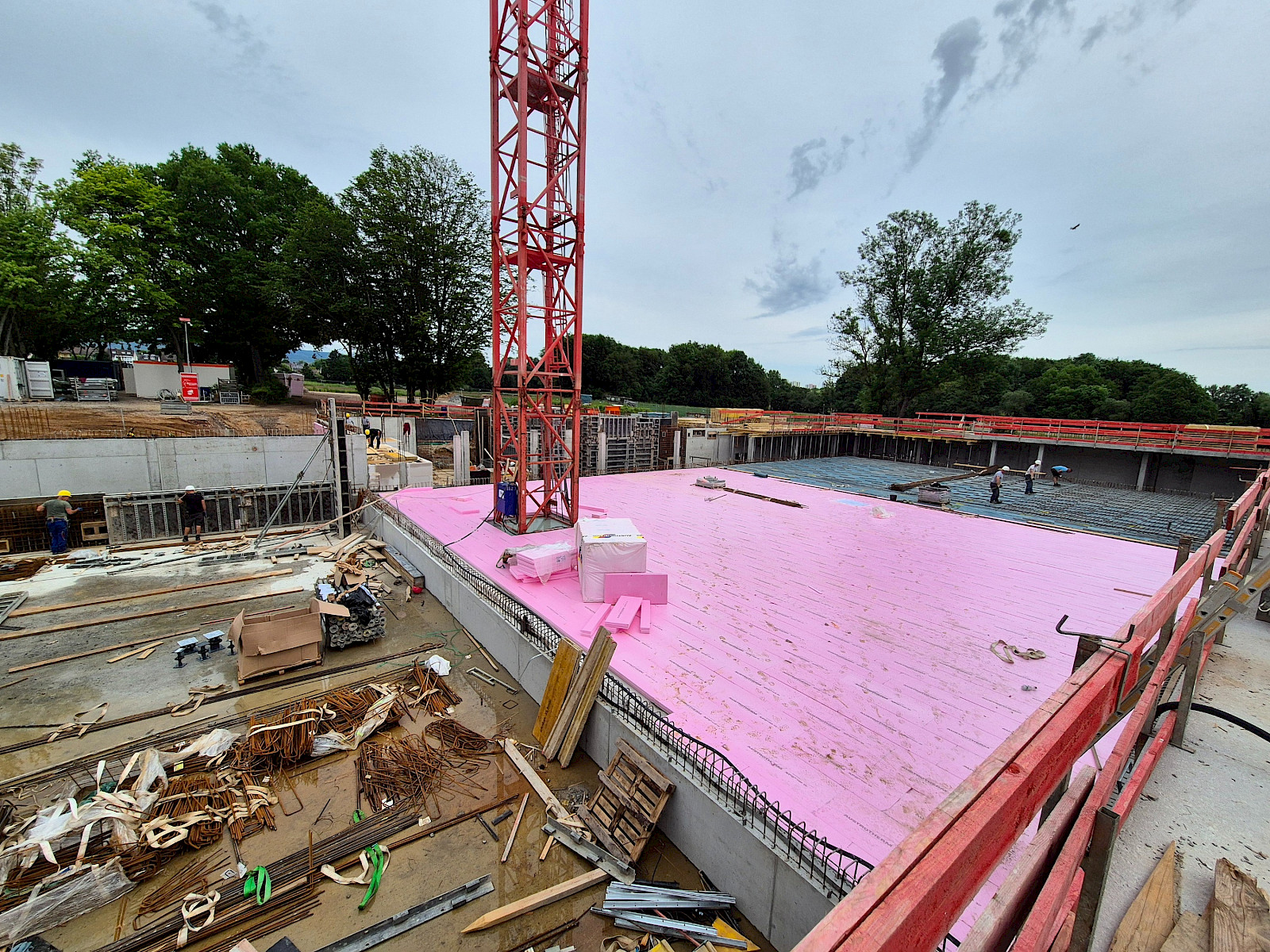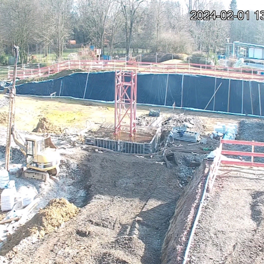 Seit der Grundsteinlegung Mitte April wurden auf der Baustelle erhebliche Fortschritte erzielt: Der erste Abschnitt der Becken-Bodenplatte ist bereits fertiggestellt, der zweite Abschnitt wird bis Freitag nachziehen. Auch der erste Abschnitt des Beckenumgangs und der Kellerdecke ist ausgeführt. Der Rohbau der Kelleraußenwände steht, die ersten Kellerräume und Kellerinnenwände sind schon gemauert.