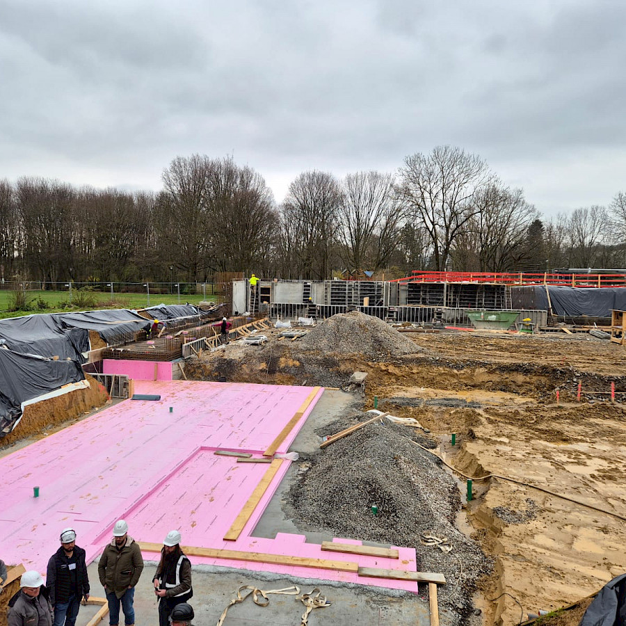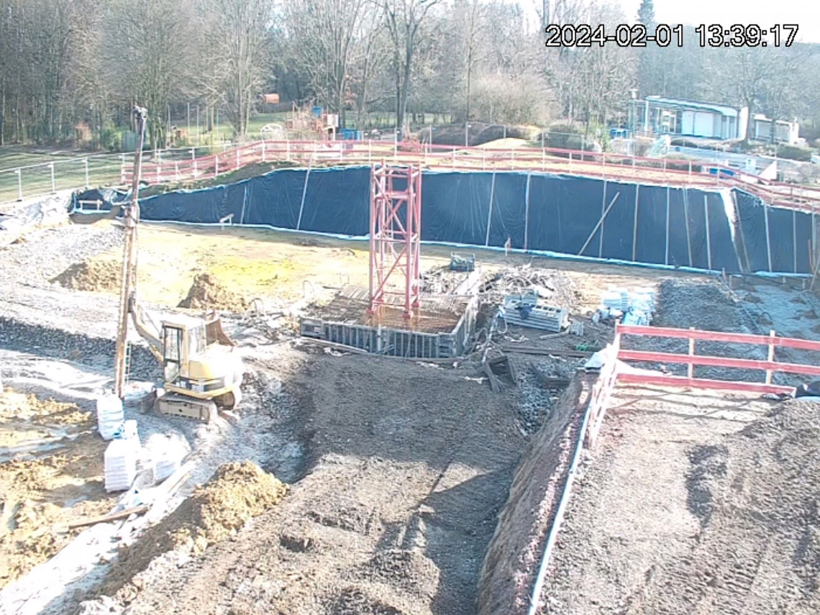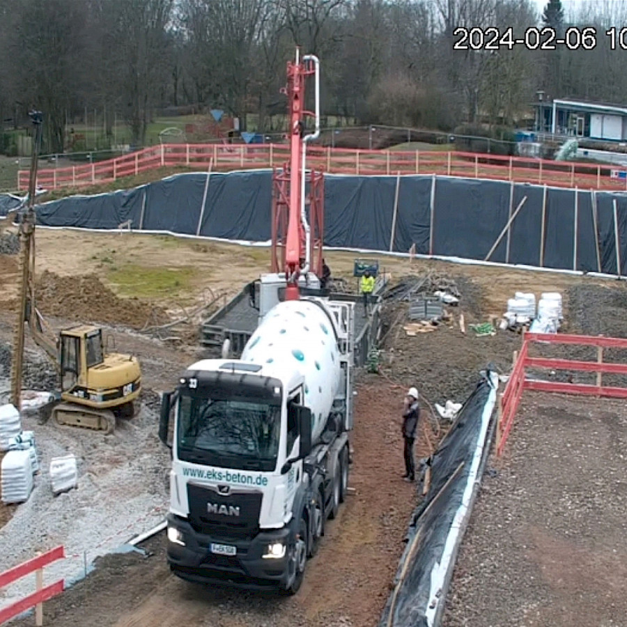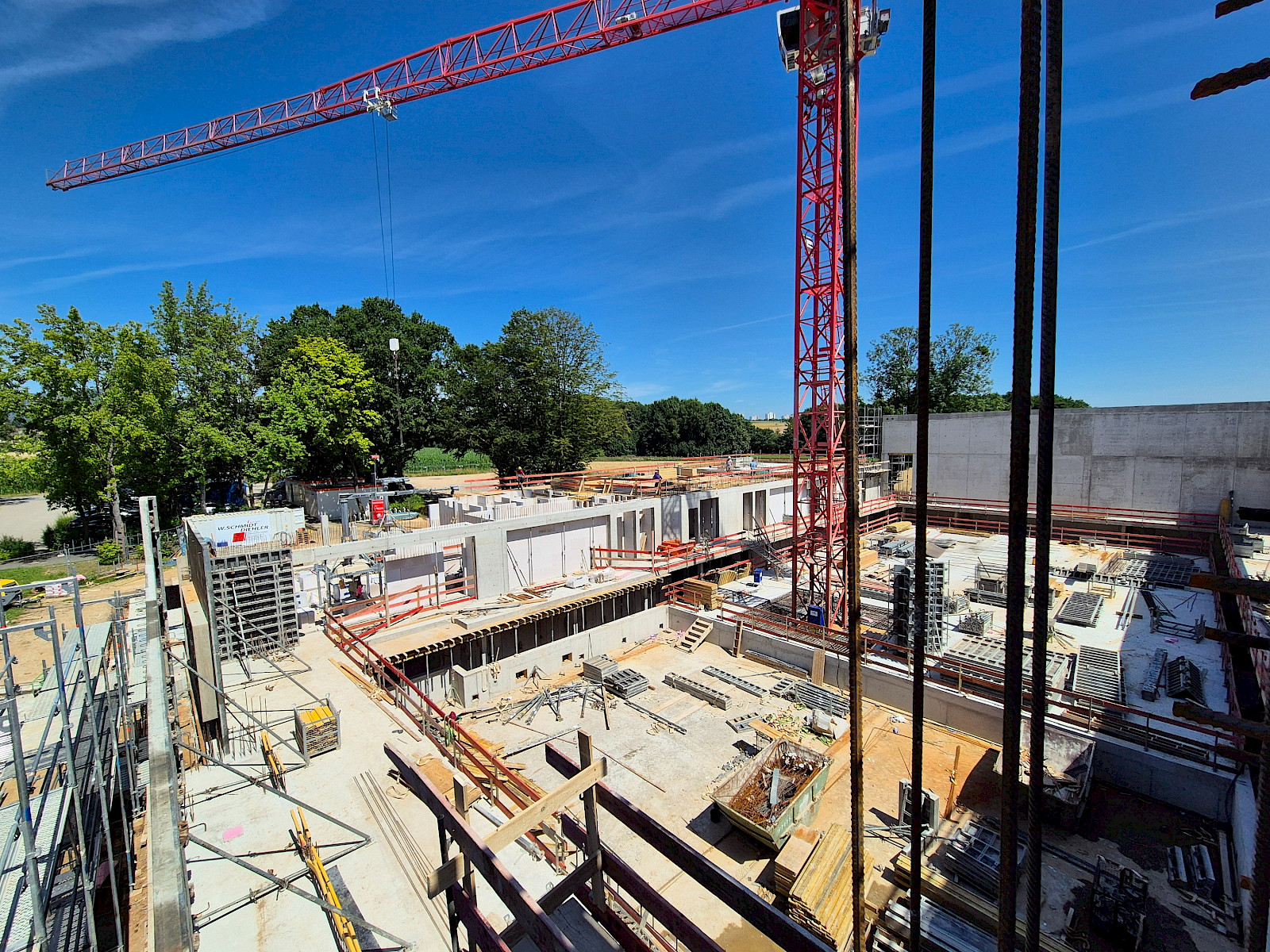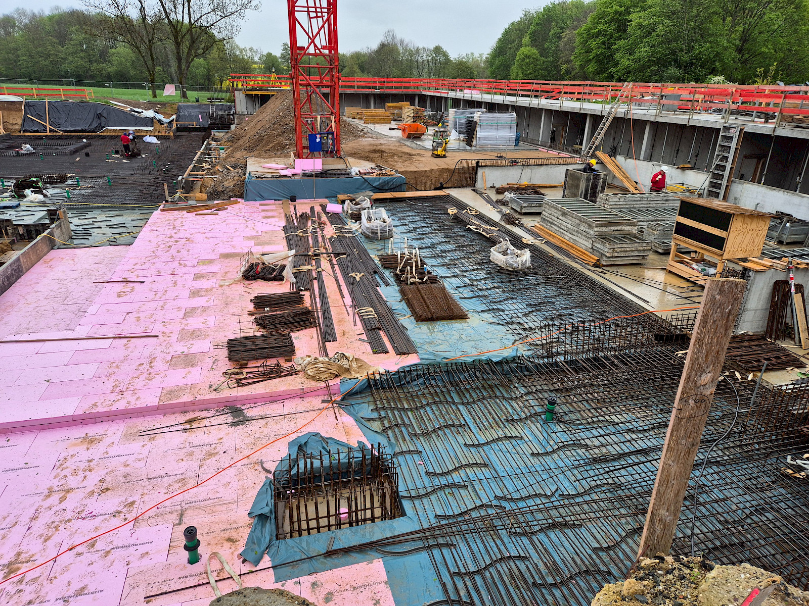 Seit der Grundsteinlegung Mitte April wurden auf der Baustelle erhebliche Fortschritte erzielt: Der erste Abschnitt der Becken-Bodenplatte ist bereits fertiggestellt, der zweite Abschnitt wird bis Freitag nachziehen. Auch der erste Abschnitt des Beckenumgangs und der Kellerdecke ist ausgeführt. Der Rohbau der Kelleraußenwände steht, die ersten Kellerräume und Kellerinnenwände sind schon gemauert.