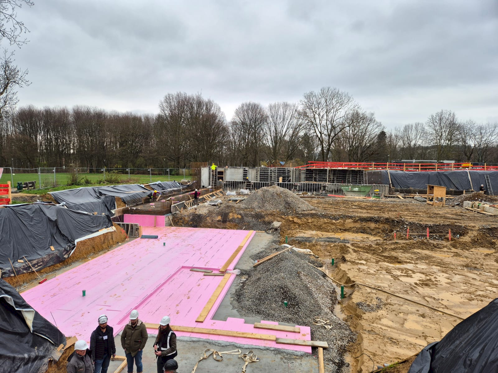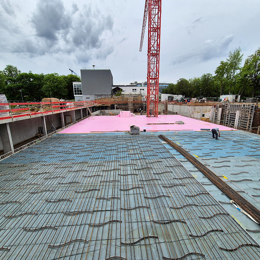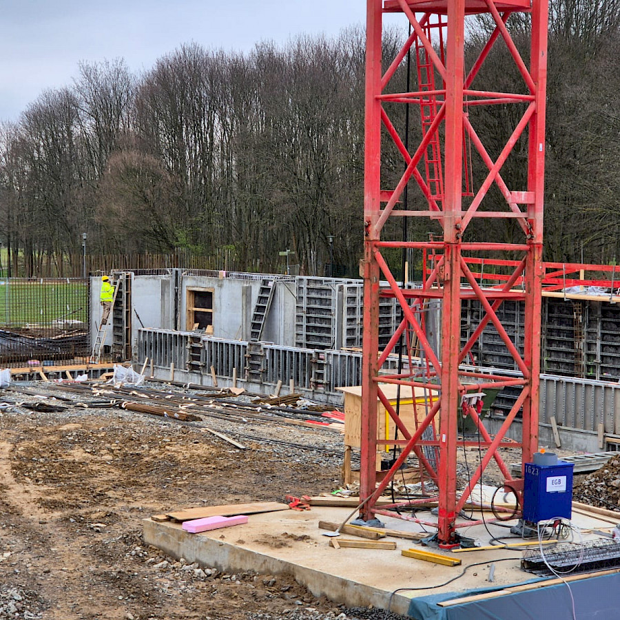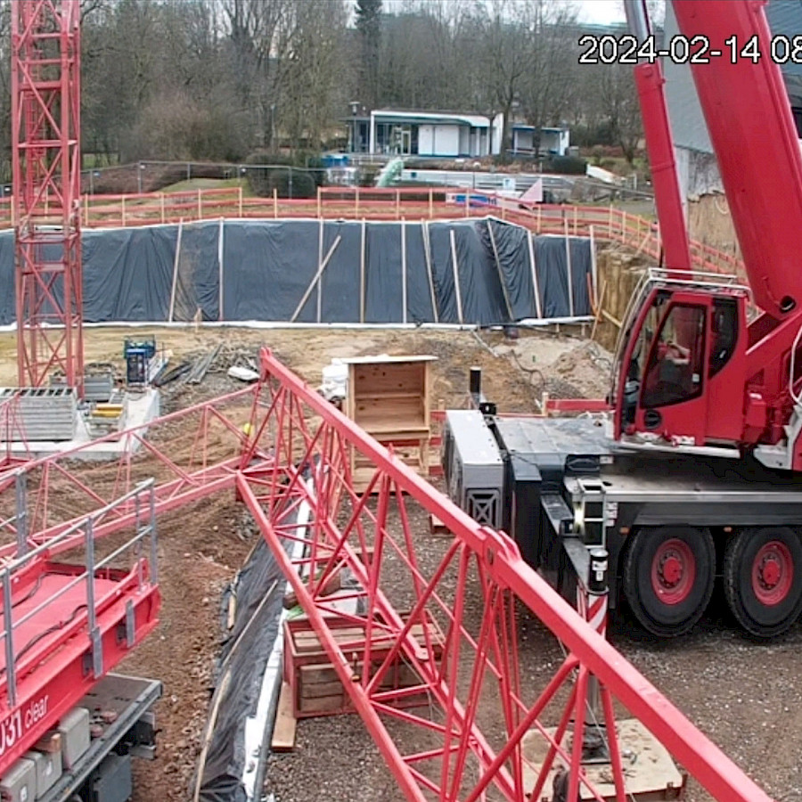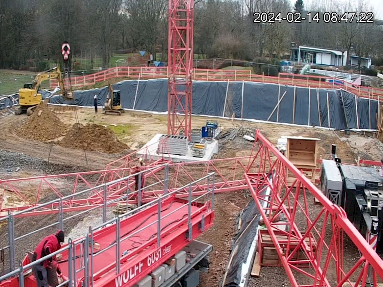 Seit der Grundsteinlegung Mitte April wurden auf der Baustelle erhebliche Fortschritte erzielt: Der erste Abschnitt der Becken-Bodenplatte ist bereits fertiggestellt, der zweite Abschnitt wird bis Freitag nachziehen. Auch der erste Abschnitt des Beckenumgangs und der Kellerdecke ist ausgeführt. Der Rohbau der Kelleraußenwände steht, die ersten Kellerräume und Kellerinnenwände sind schon gemauert.