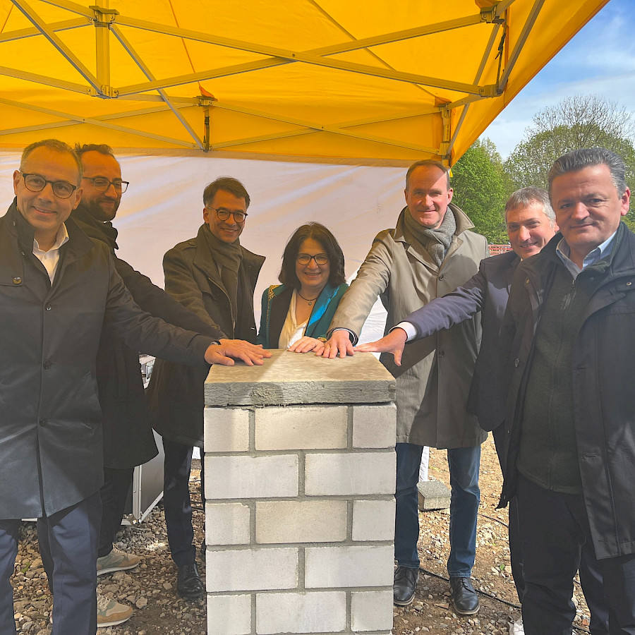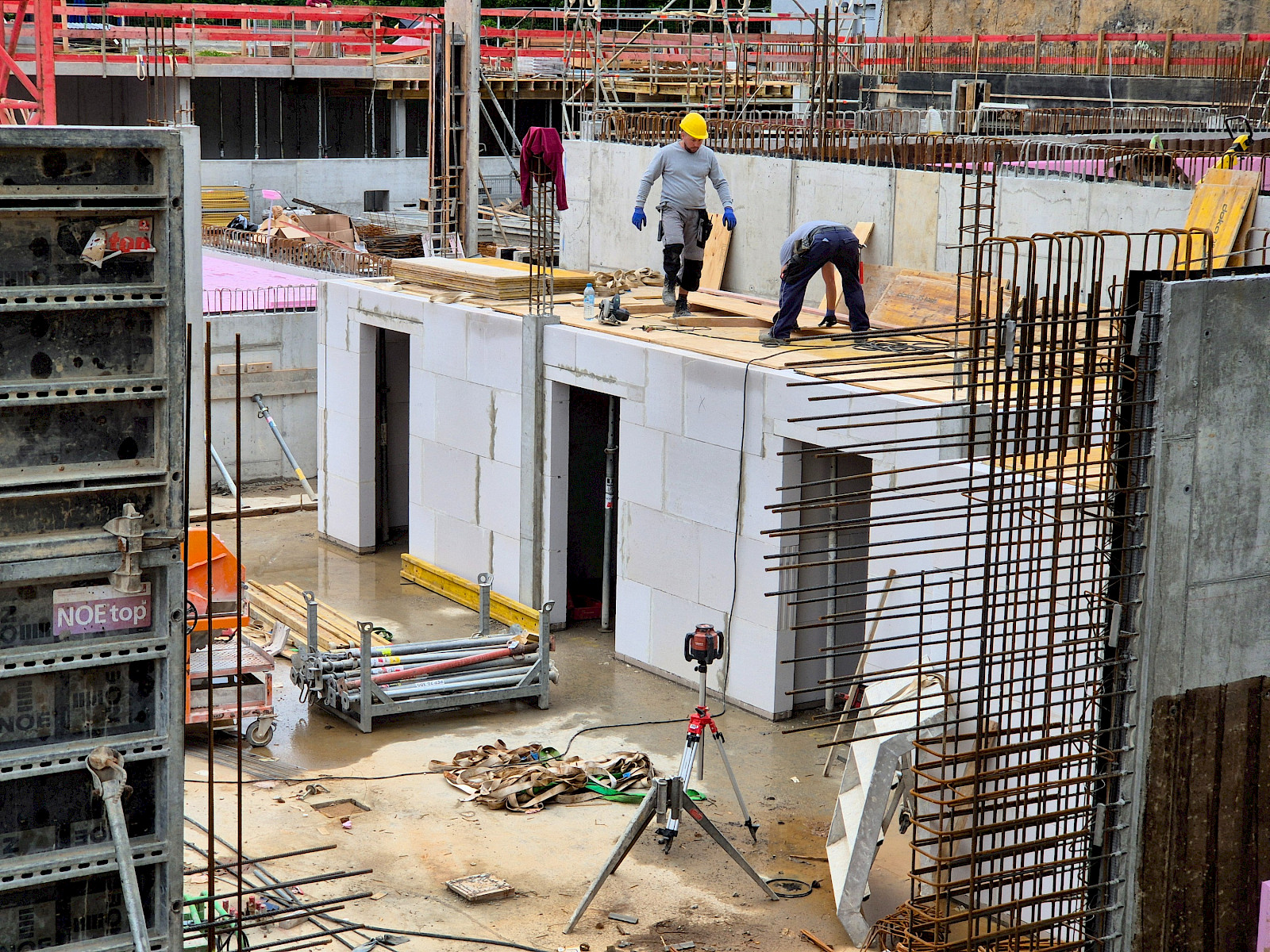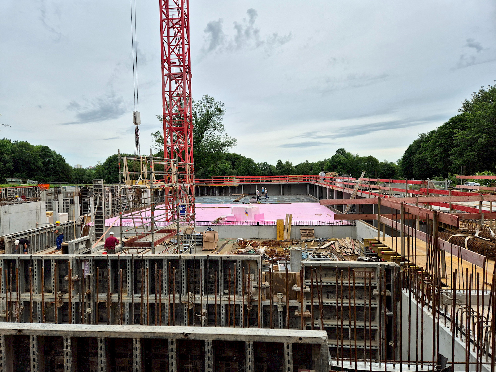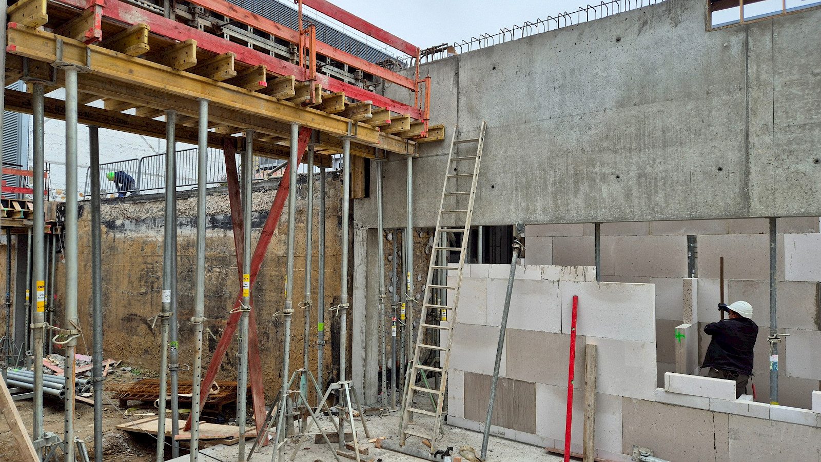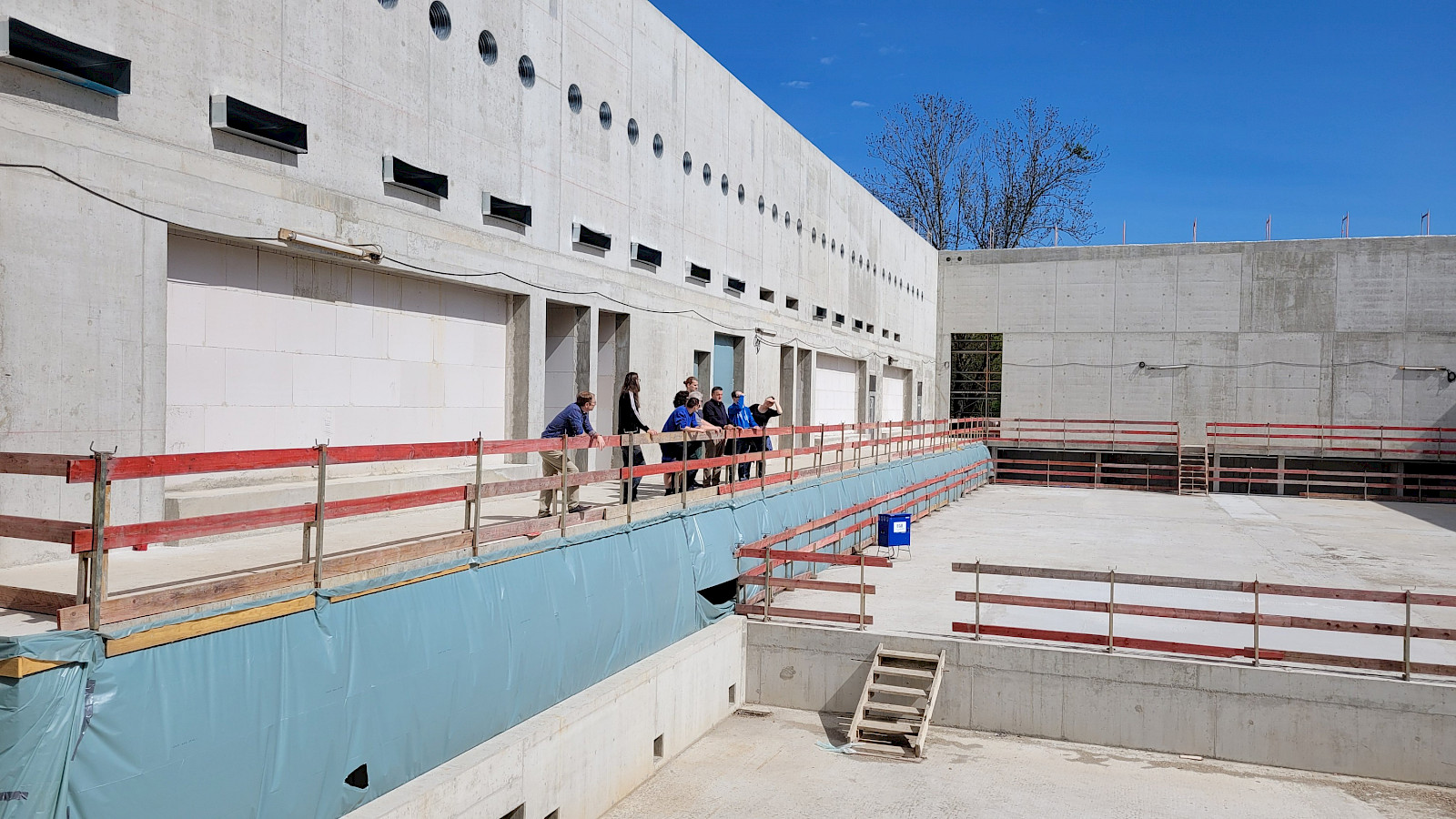 Seit der Grundsteinlegung Mitte April wurden auf der Baustelle erhebliche Fortschritte erzielt: Der erste Abschnitt der Becken-Bodenplatte ist bereits fertiggestellt, der zweite Abschnitt wird bis Freitag nachziehen. Auch der erste Abschnitt des Beckenumgangs und der Kellerdecke ist ausgeführt. Der Rohbau der Kelleraußenwände steht, die ersten Kellerräume und Kellerinnenwände sind schon gemauert.