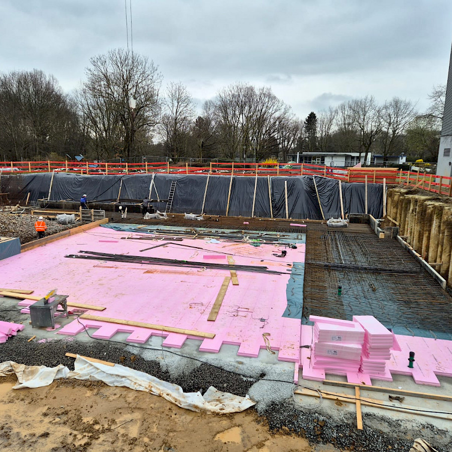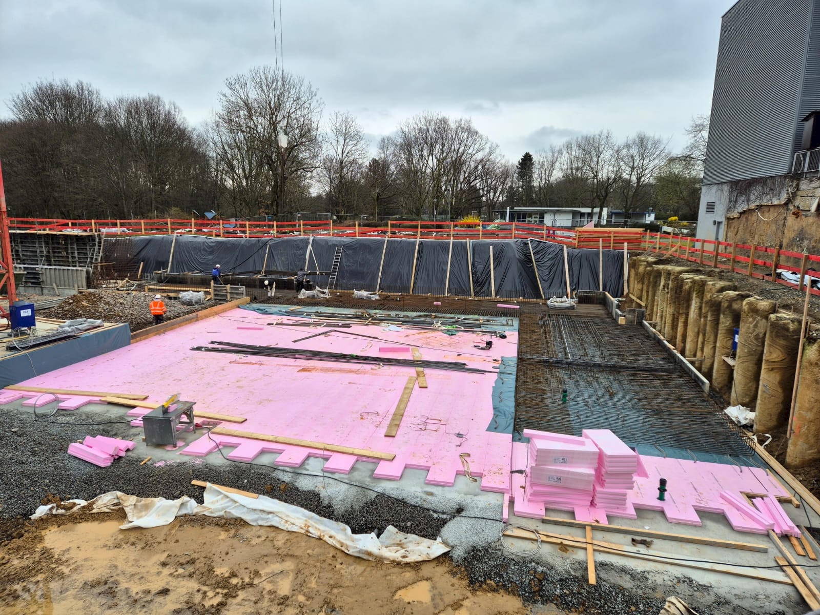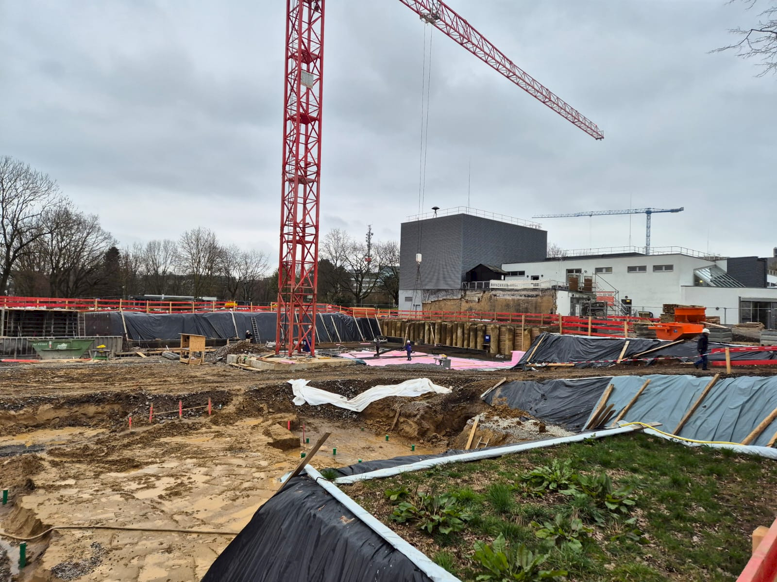 Zum Frühlingsbeginn zeigt sich die Baustelle in frischen Farben – und es geht zügig voran. Die Sauberkeitsschicht ist erstellt, die Bodenplatte ist in Teilbereichen bereits fertig. Die Bewehrung der Restbodenplatte läuft. In Teilbereichen sind die Wände schon eingeschalt und bewehrt. Die Wasserhaltung wurde zurückgebaut, muss aber in einem Bereich durch einen neuen Brunnen erweitert werden, da immer noch Wasser eintritt.