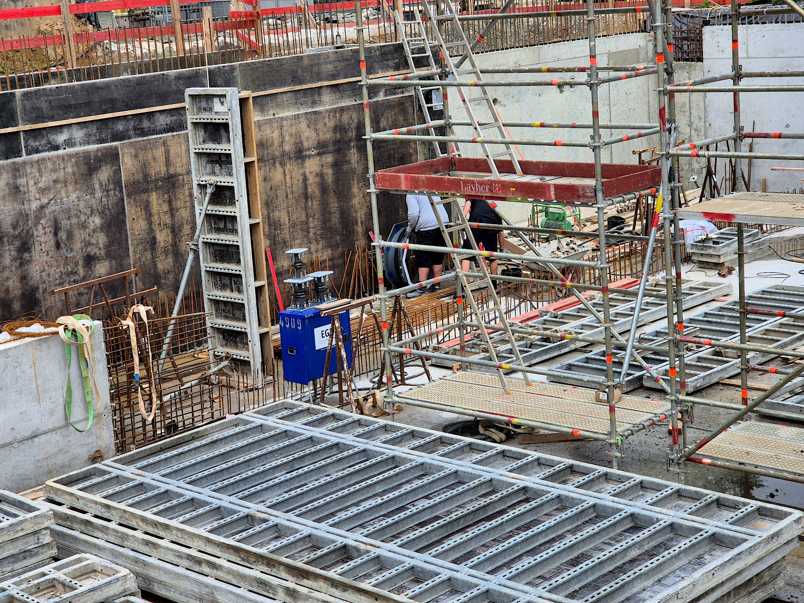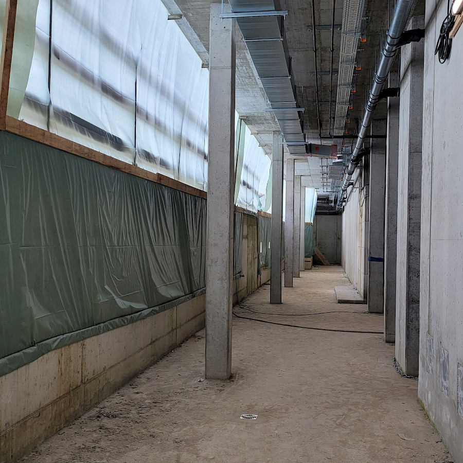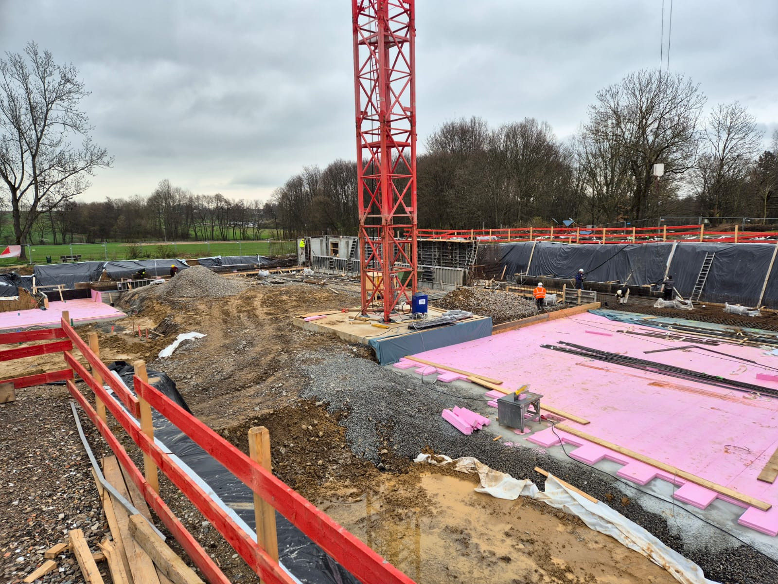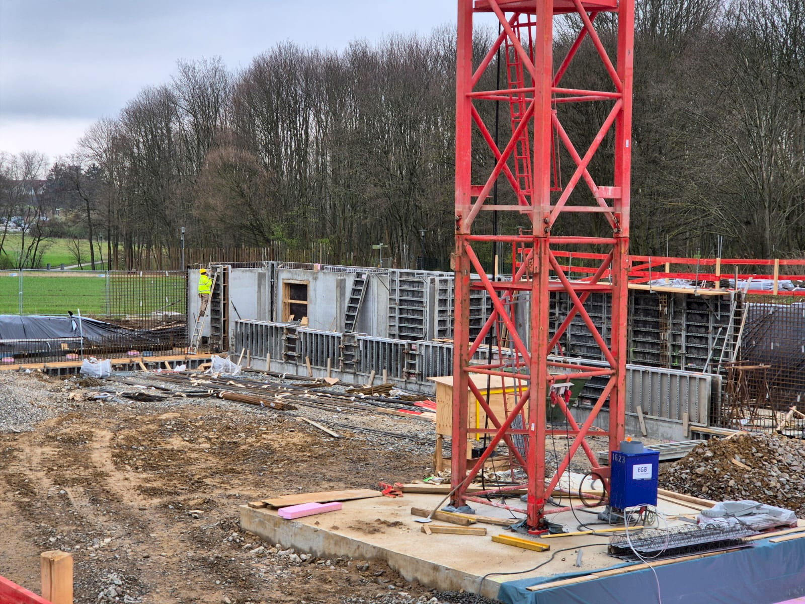 Zum Frühlingsbeginn zeigt sich die Baustelle in frischen Farben – und es geht zügig voran. Die Sauberkeitsschicht ist erstellt, die Bodenplatte ist in Teilbereichen bereits fertig. Die Bewehrung der Restbodenplatte läuft. In Teilbereichen sind die Wände schon eingeschalt und bewehrt. Die Wasserhaltung wurde zurückgebaut, muss aber in einem Bereich durch einen neuen Brunnen erweitert werden, da immer noch Wasser eintritt.
