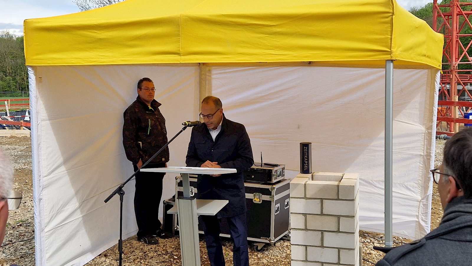 Im Rahmen der offiziellen Grundsteinlegung wurde symbolisch eine Zeitkapsel in eine vorgemauerte Wand eingelassen. Diese wurde am 22. April von Projektleiter Dipl.-Ing. Ivica Kelava – in Begleitung des Bauleiters Dipl.-Ing. Harun Popal und des Poliers Jozo Camber der Rohbaufirma W. Schmidt-Diehler GmbH – ihrer Bestimmung übergeben und in die Bodenplatte der neuen Schwimmhalle einbetoniert. In der Kapsel befinden sich Kopien von Planzeichnungen der neuen Schwimmhalle, ein Stadtplan, aktuelle Tageszeitungen und Fotos von bisherigen Meilensteinen des Bauprojekts – wie der Übergabe des Förderbescheids durch Innenminister Peter Beuth im September 2022.