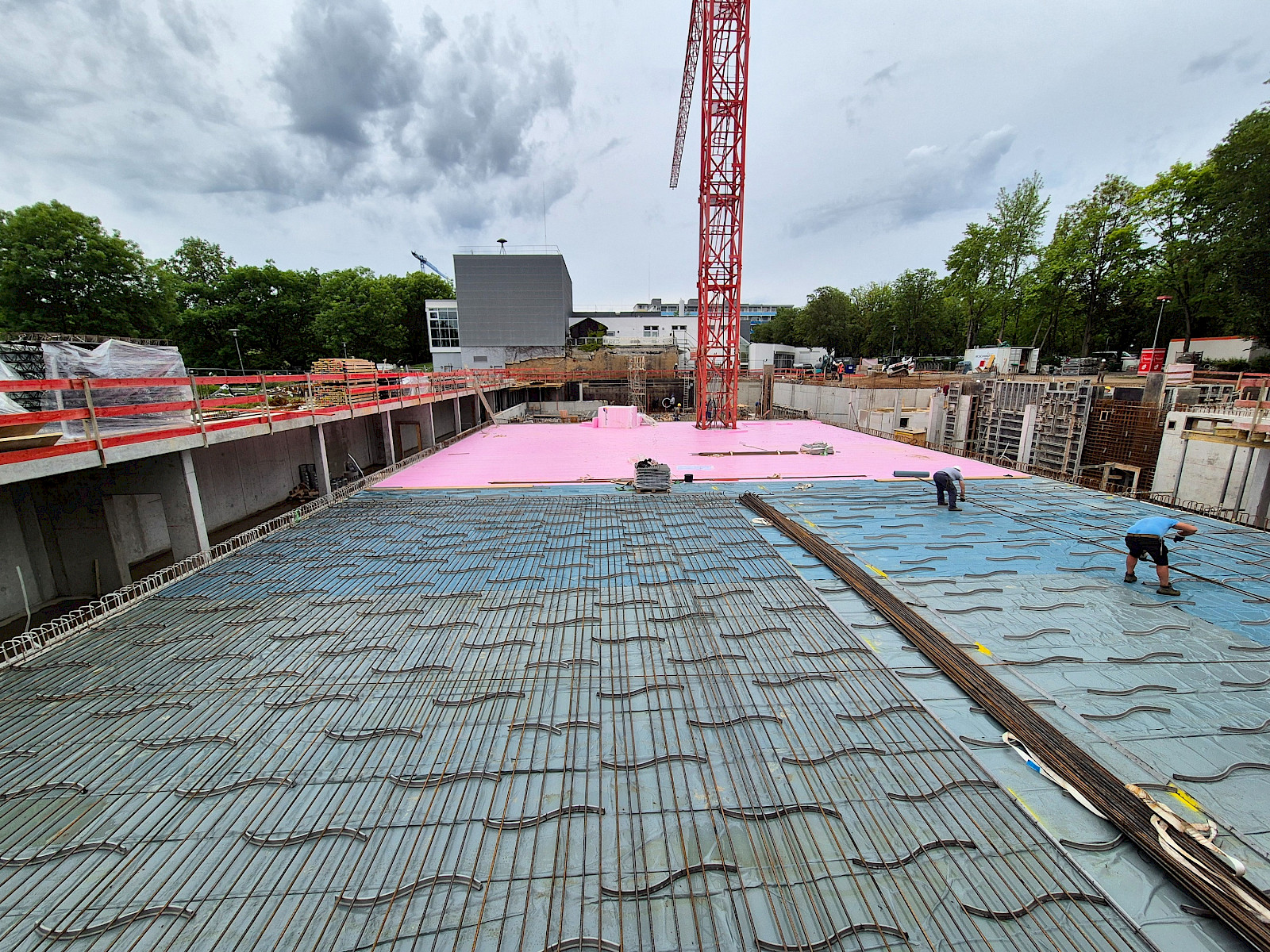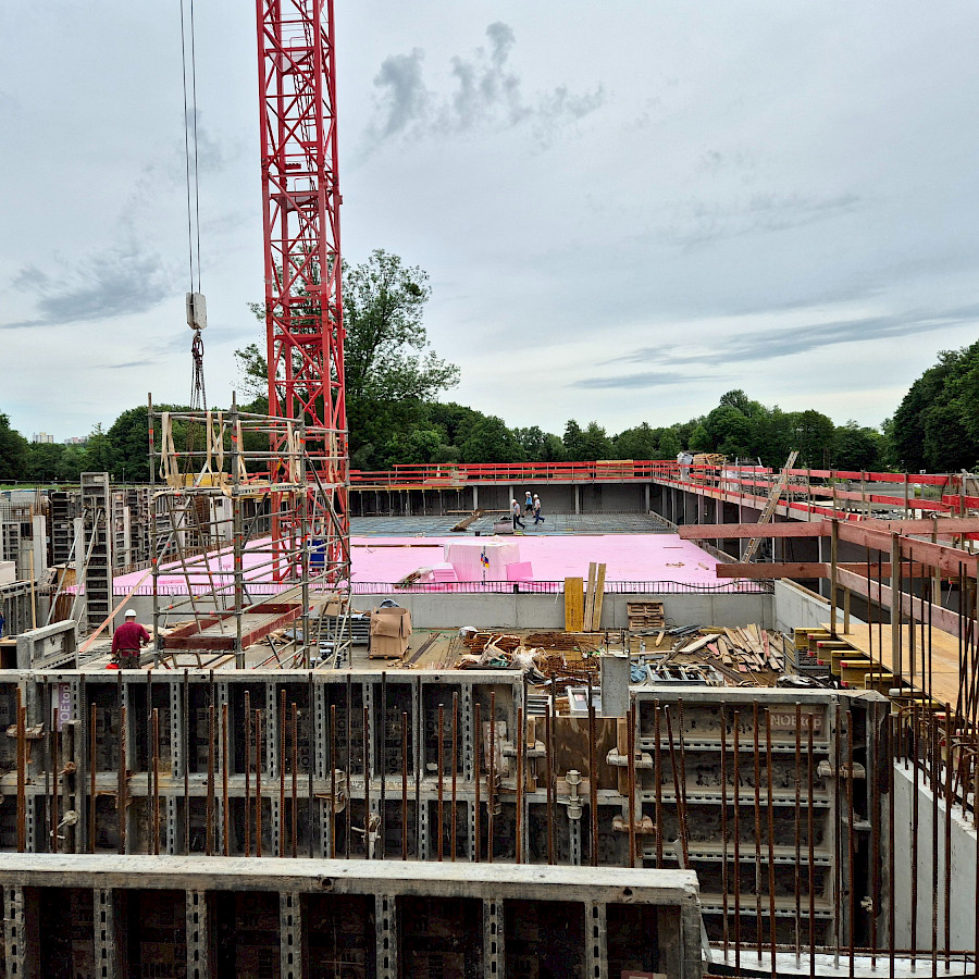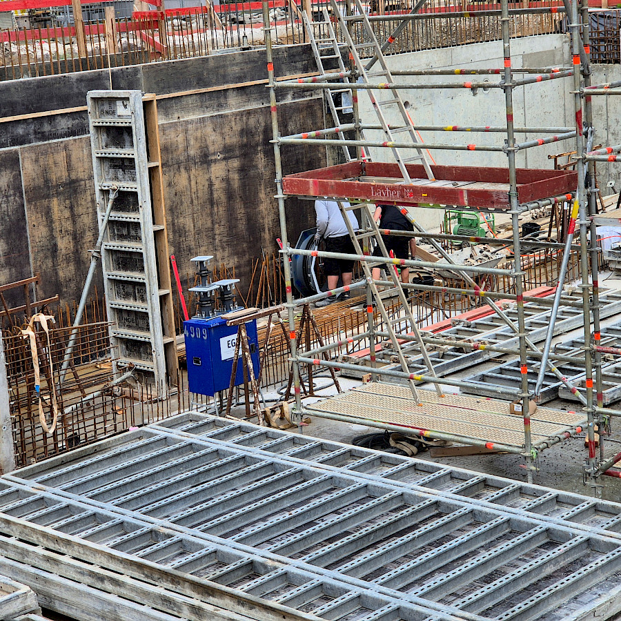 Im vergangenen Monat sind die Arbeiten gut vorangekommen. Einige Kellerwände sind bereits fertiggestellt, ebenso der größte Teil der Bodenplatte. Der Rest der Bodenplatte wird derzeit bewehrt. Nachdem der zusätzliche Brunnen als Brunnengalerie hergestellt wurde, funktioniert die Wasserhaltung einwandfrei. Die Vorbereitungen für den nächsten Meilenstein – die Grundsteinlegung – laufen auf Hochtouren.