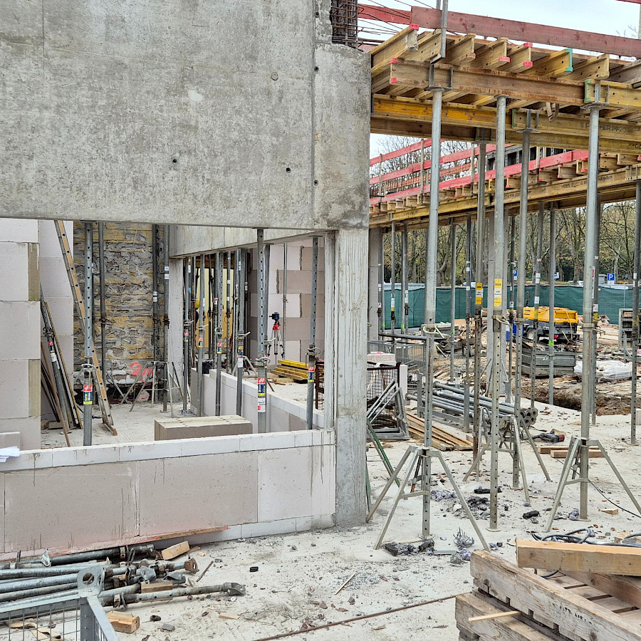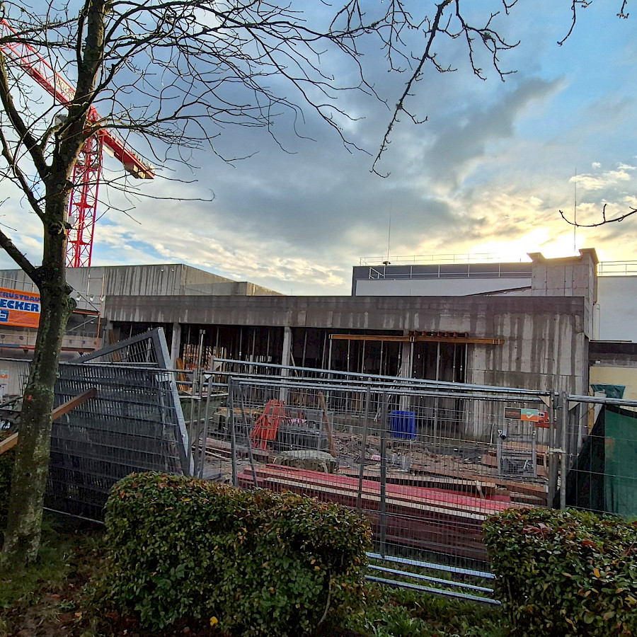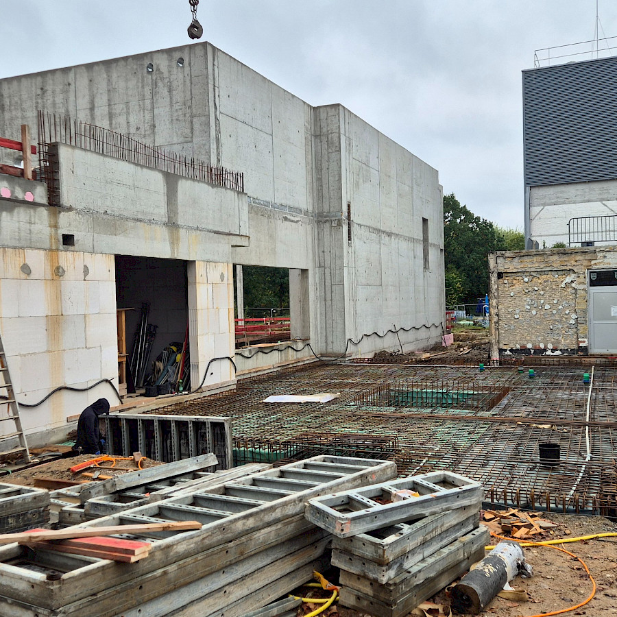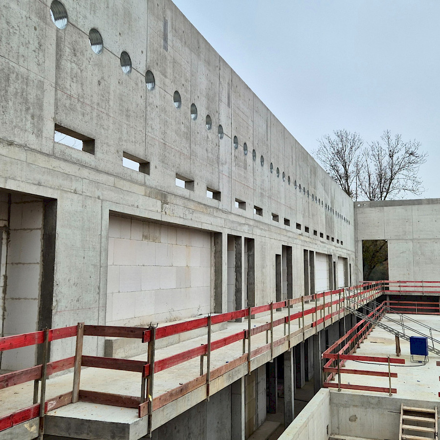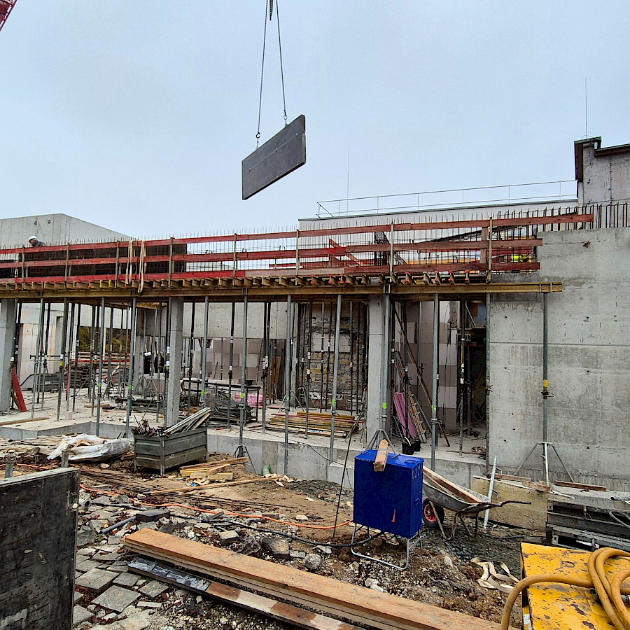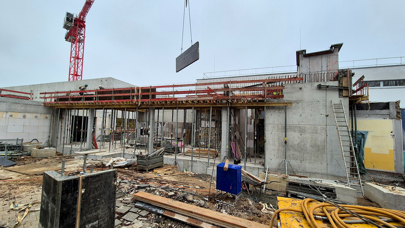 Auch der Rohbau der neuen Eingangshalle ist komplett fertiggestellt. Die Ausschalarbeiten sind derzeit im Gange. Die Gerüststellung ist größtenteils abgeschlossen.