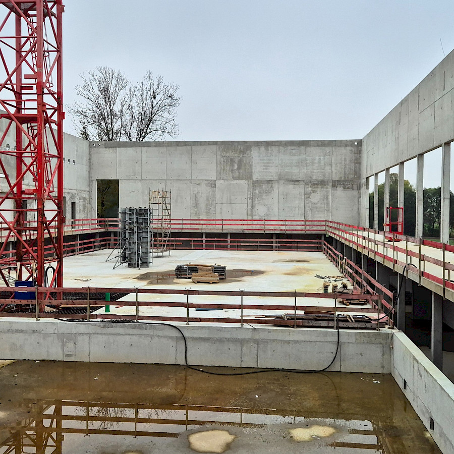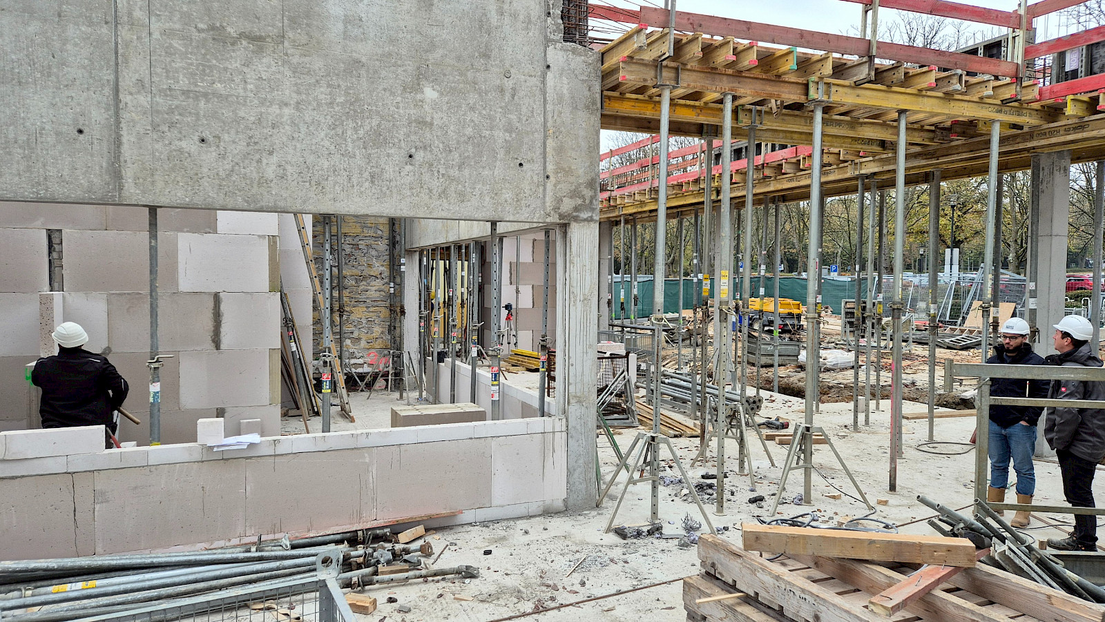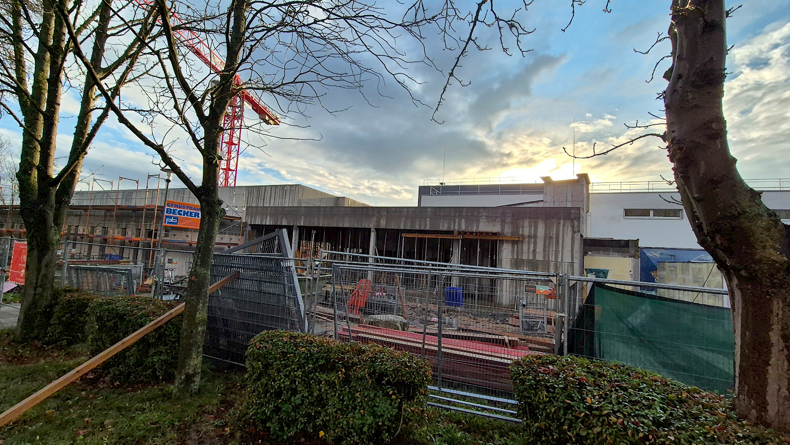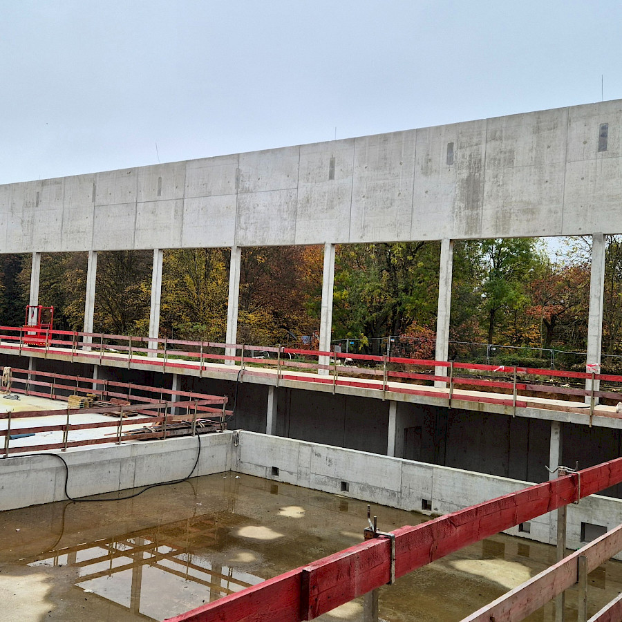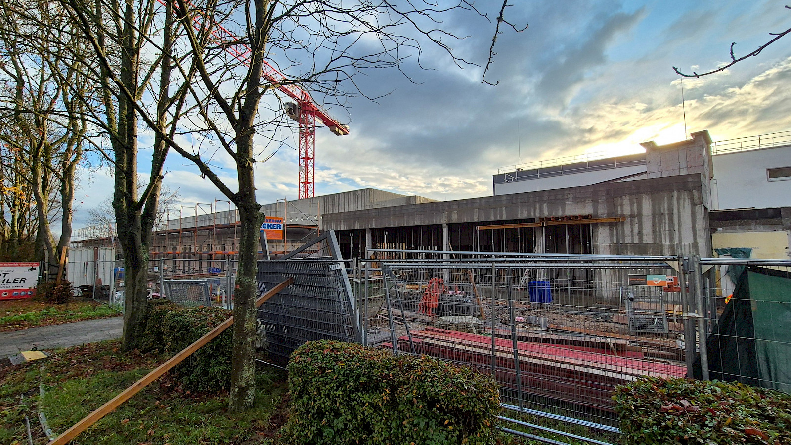 Auch der Rohbau der neuen Eingangshalle ist komplett fertiggestellt. Die Ausschalarbeiten sind derzeit im Gange. Die Gerüststellung ist größtenteils abgeschlossen.