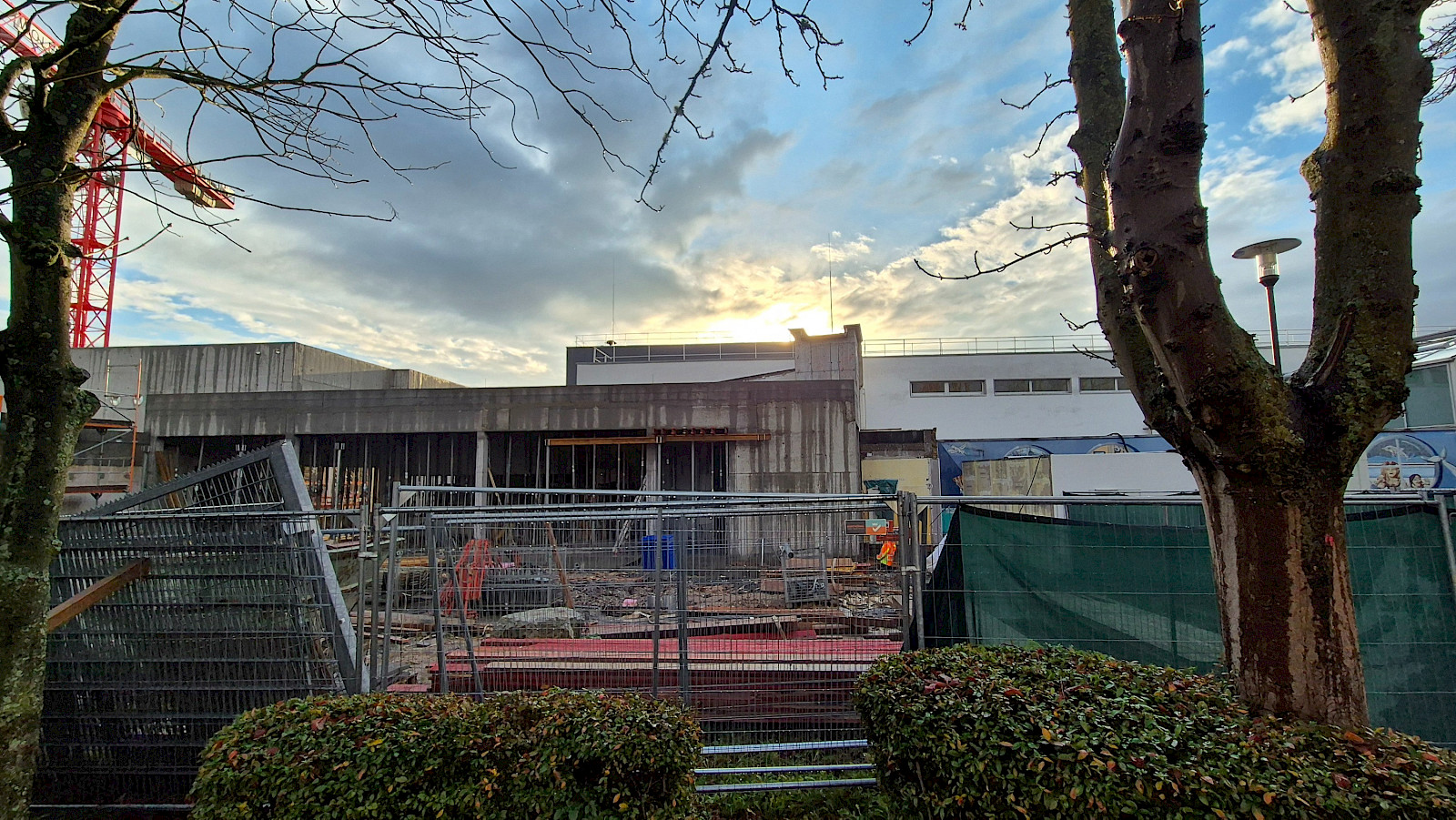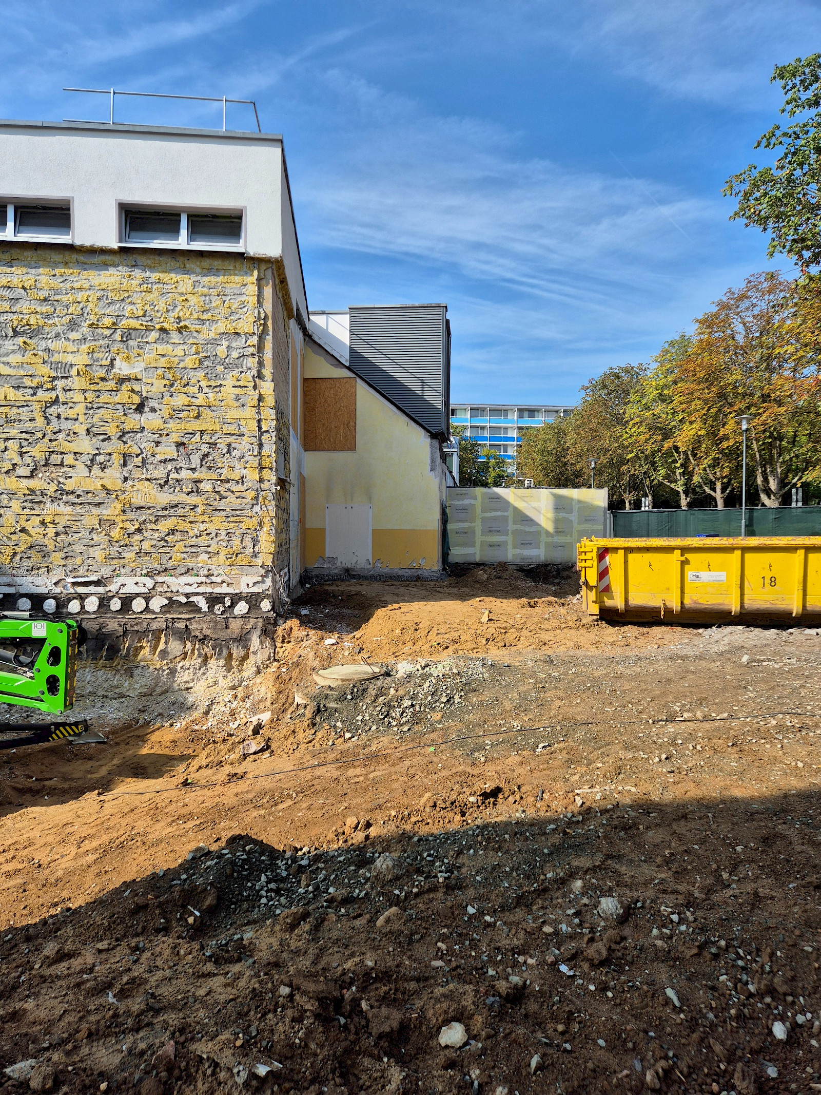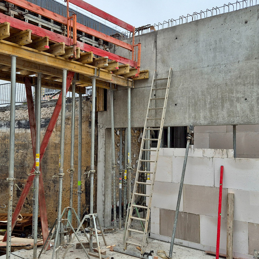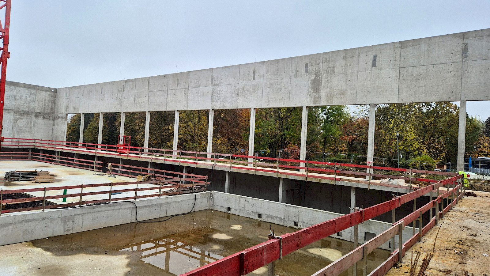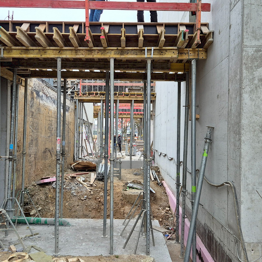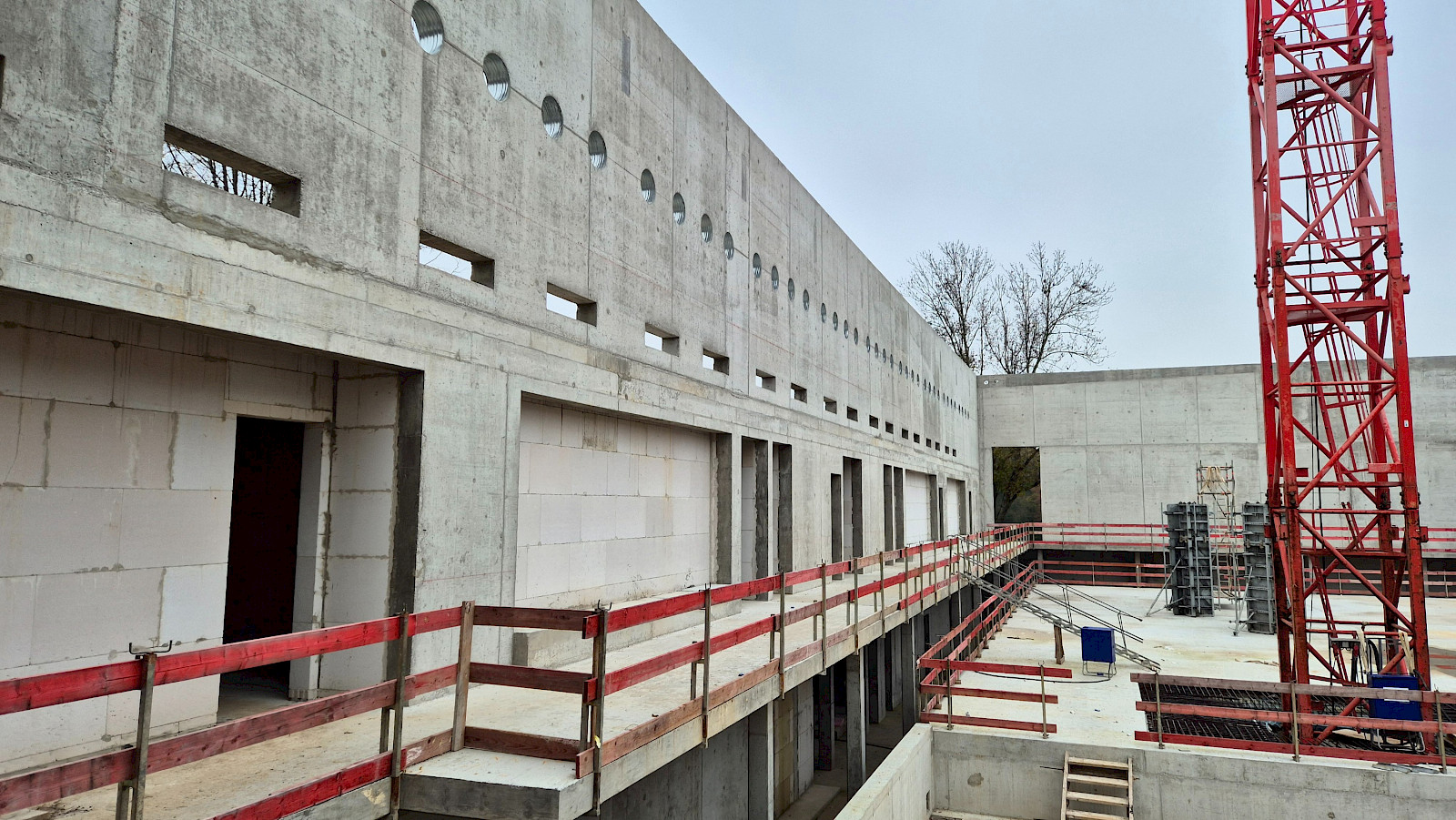 Auch der Rohbau der neuen Eingangshalle ist komplett fertiggestellt. Die Ausschalarbeiten sind derzeit im Gange. Die Gerüststellung ist größtenteils abgeschlossen.