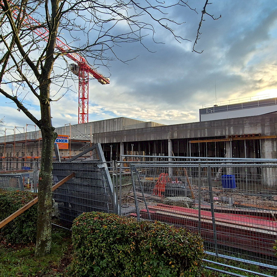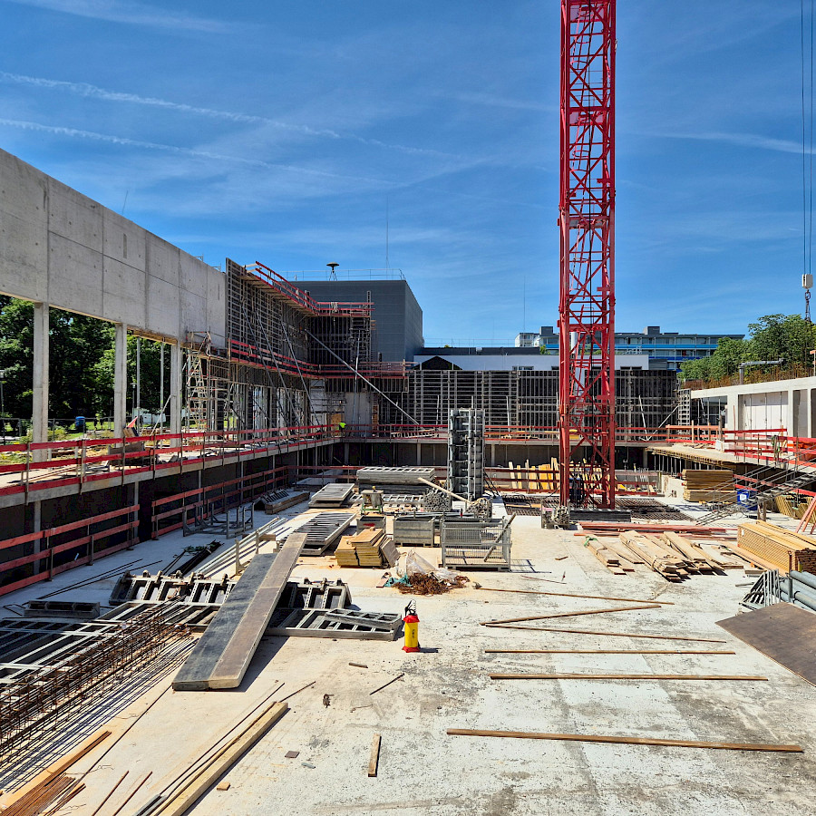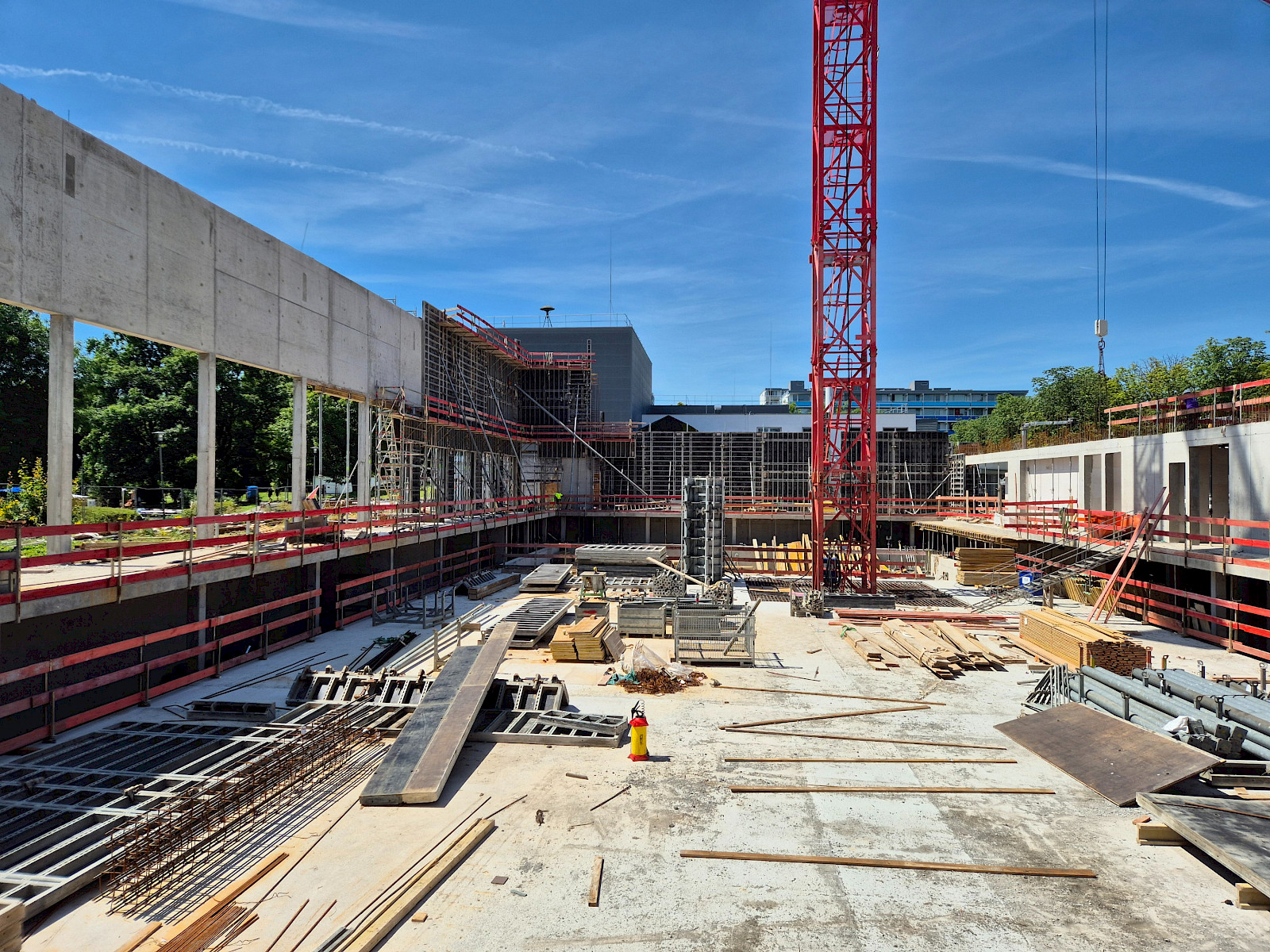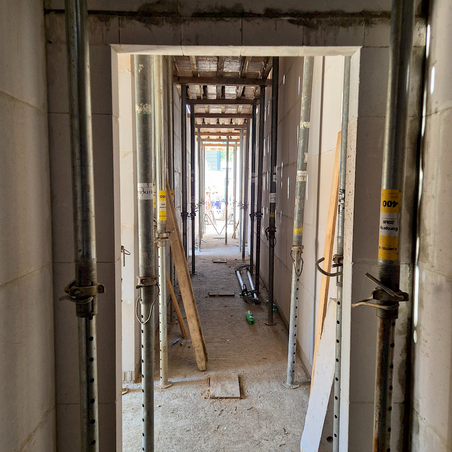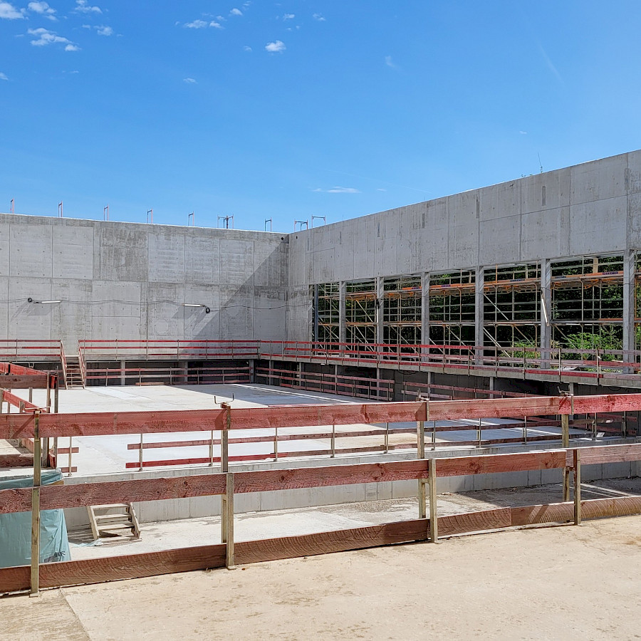 Auch der Rohbau der neuen Eingangshalle ist komplett fertiggestellt. Die Ausschalarbeiten sind derzeit im Gange. Die Gerüststellung ist größtenteils abgeschlossen.