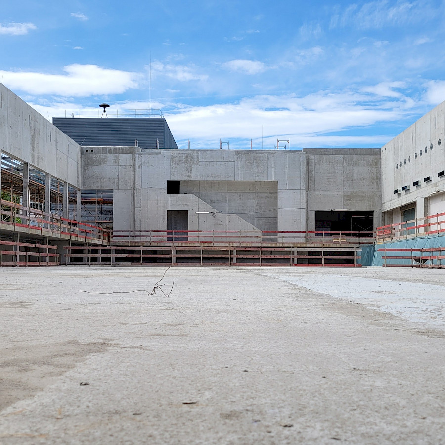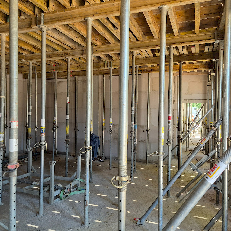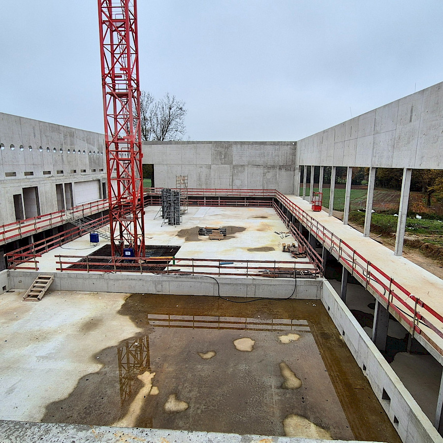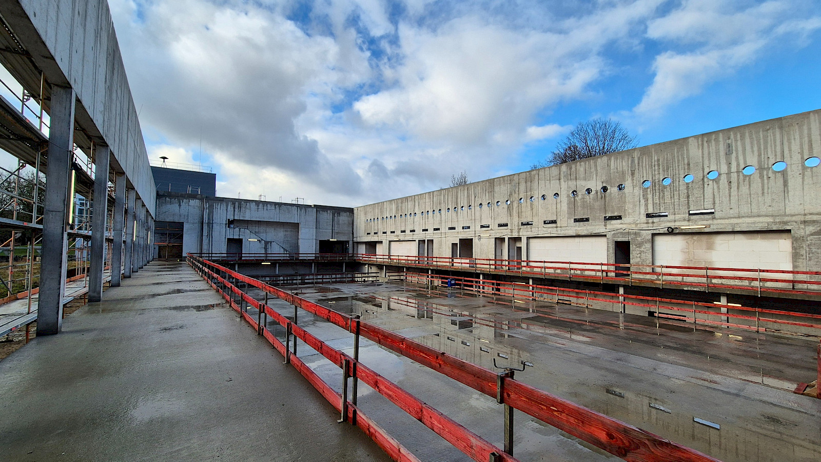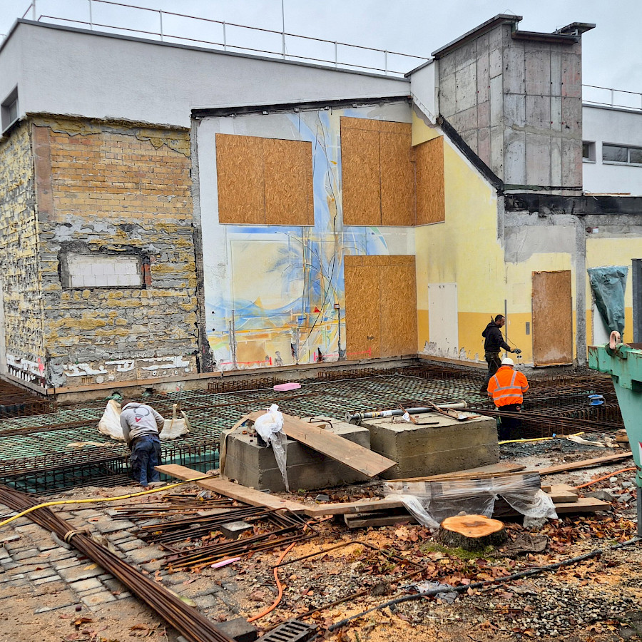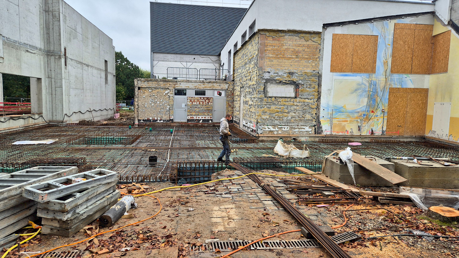 Auch der Rohbau der neuen Eingangshalle ist komplett fertiggestellt. Die Ausschalarbeiten sind derzeit im Gange. Die Gerüststellung ist größtenteils abgeschlossen.
