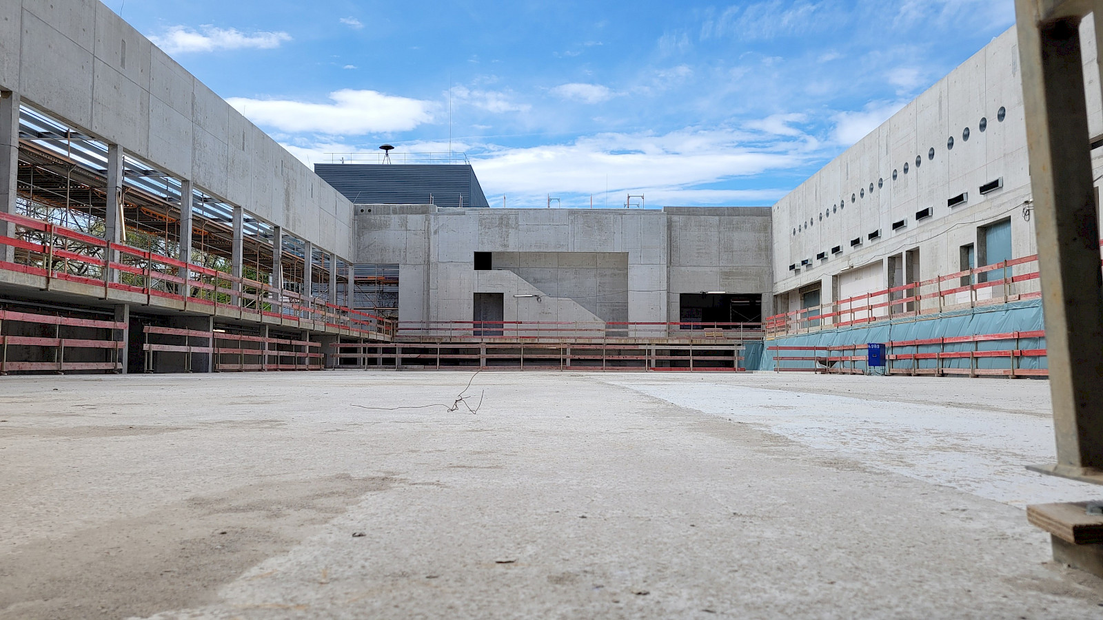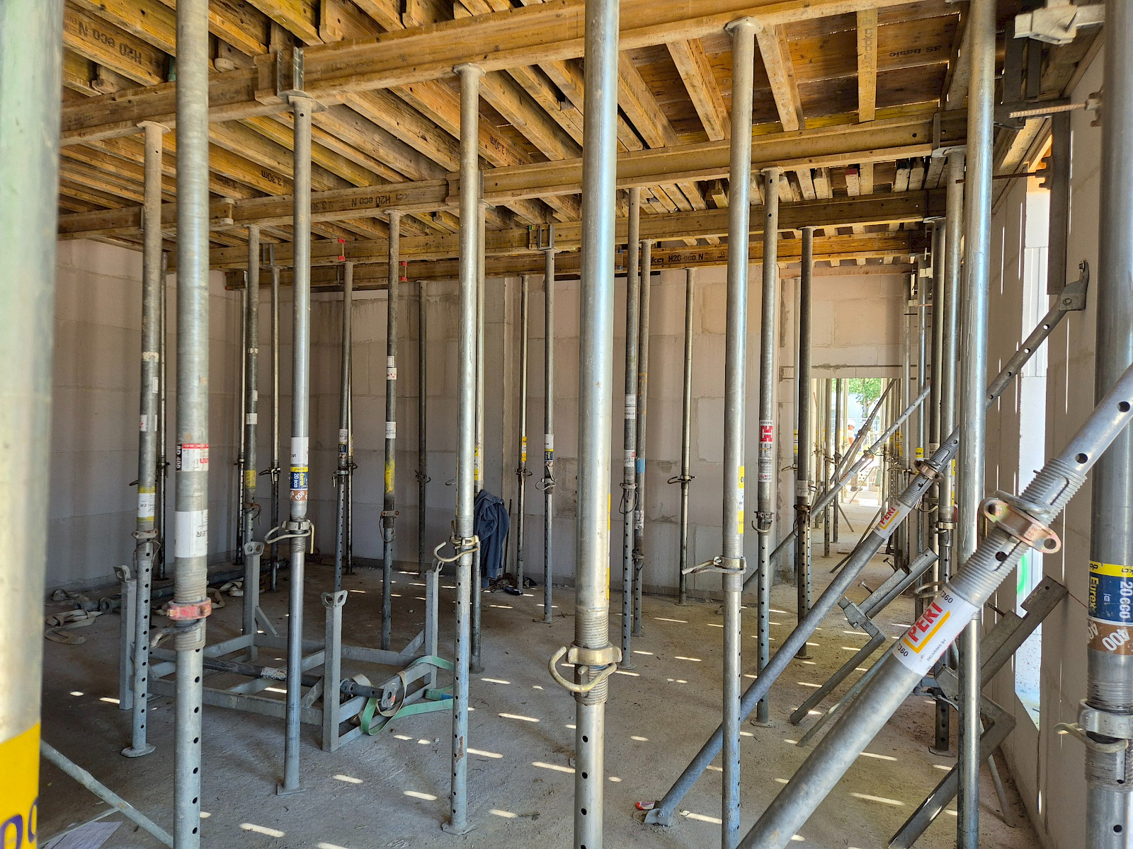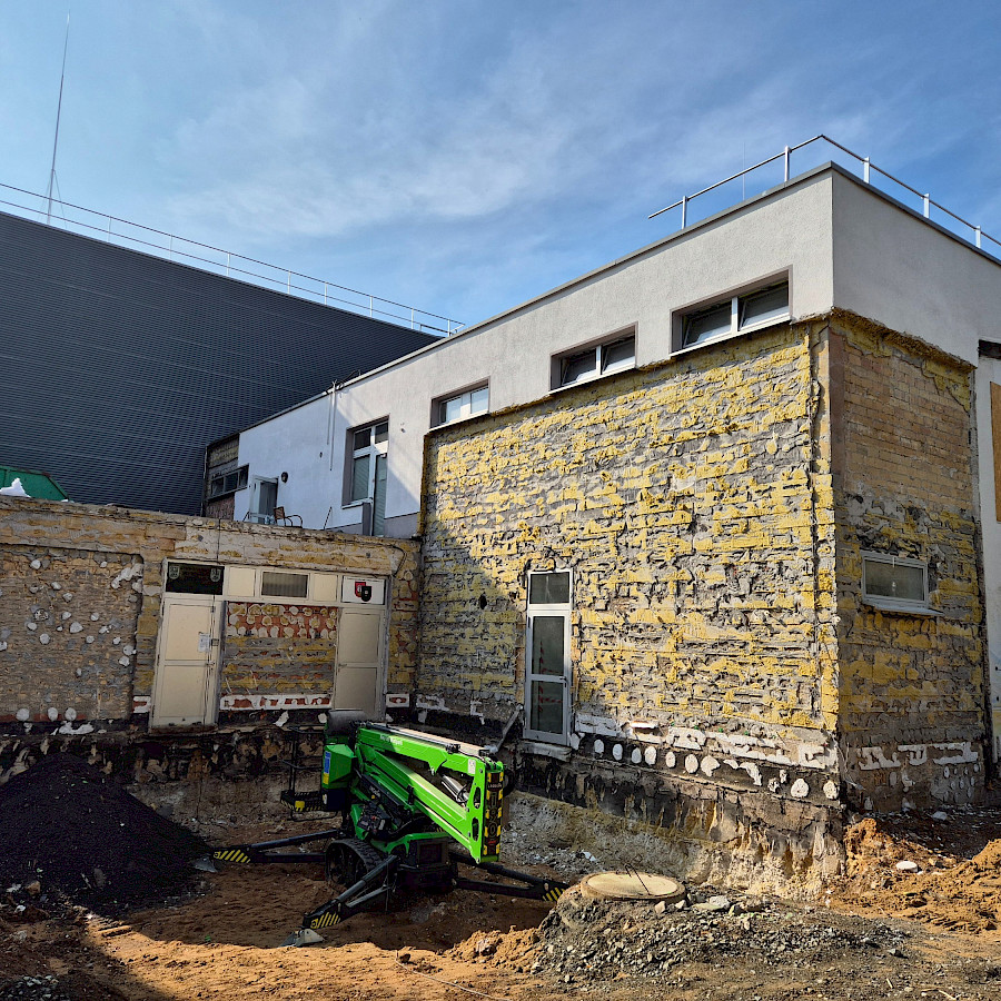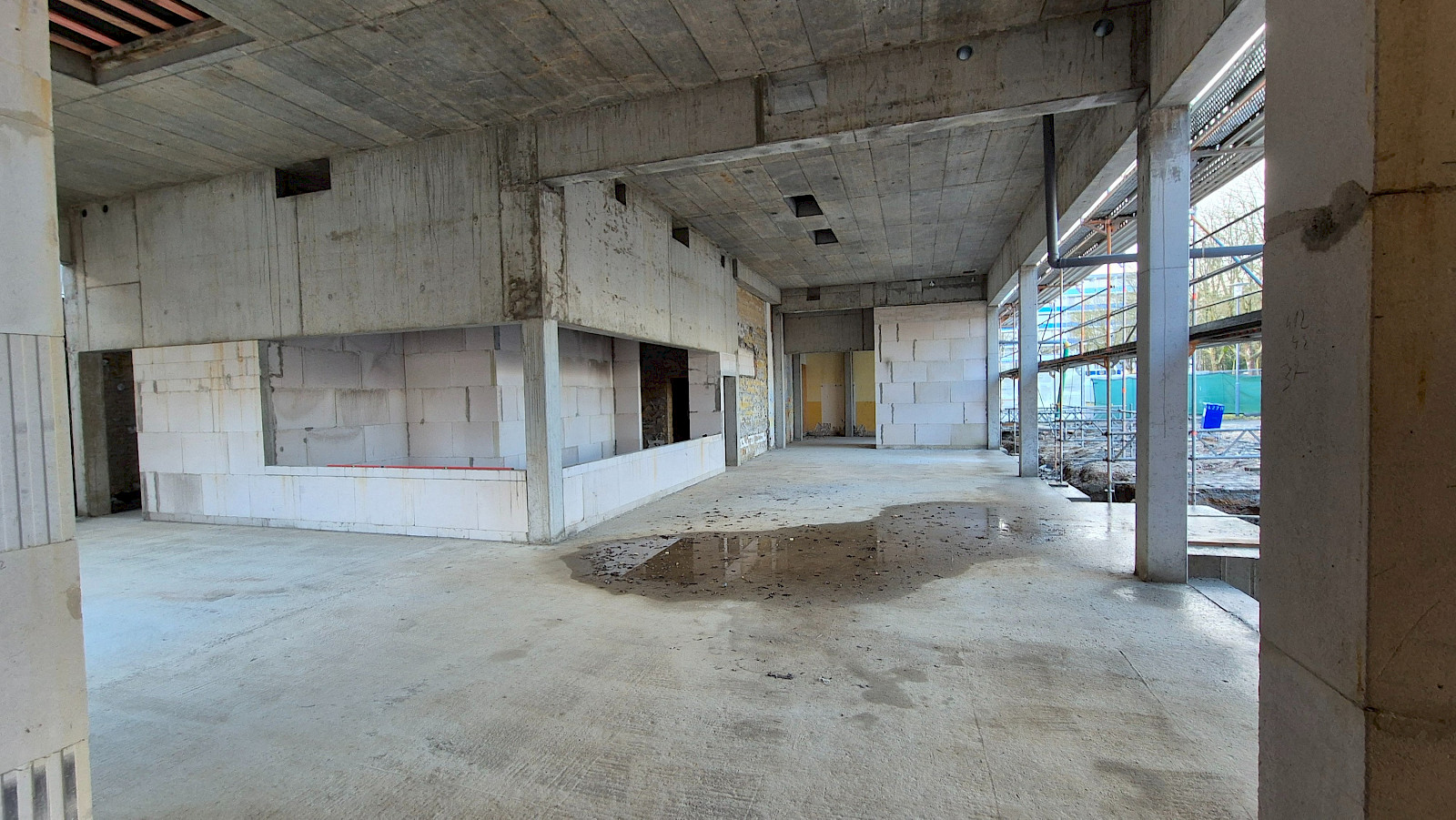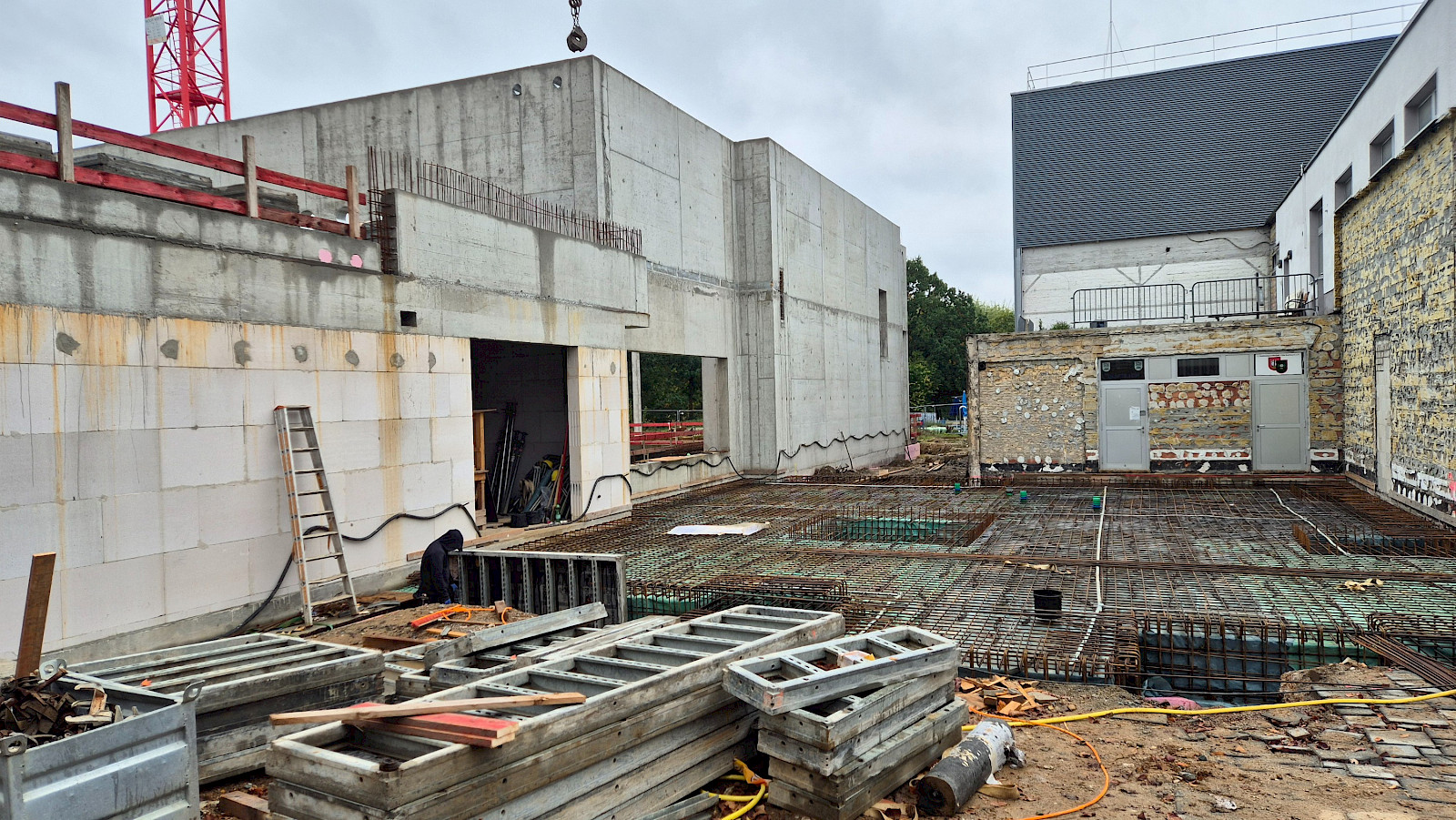 Auch der Rohbau der neuen Eingangshalle ist komplett fertiggestellt. Die Ausschalarbeiten sind derzeit im Gange. Die Gerüststellung ist größtenteils abgeschlossen.