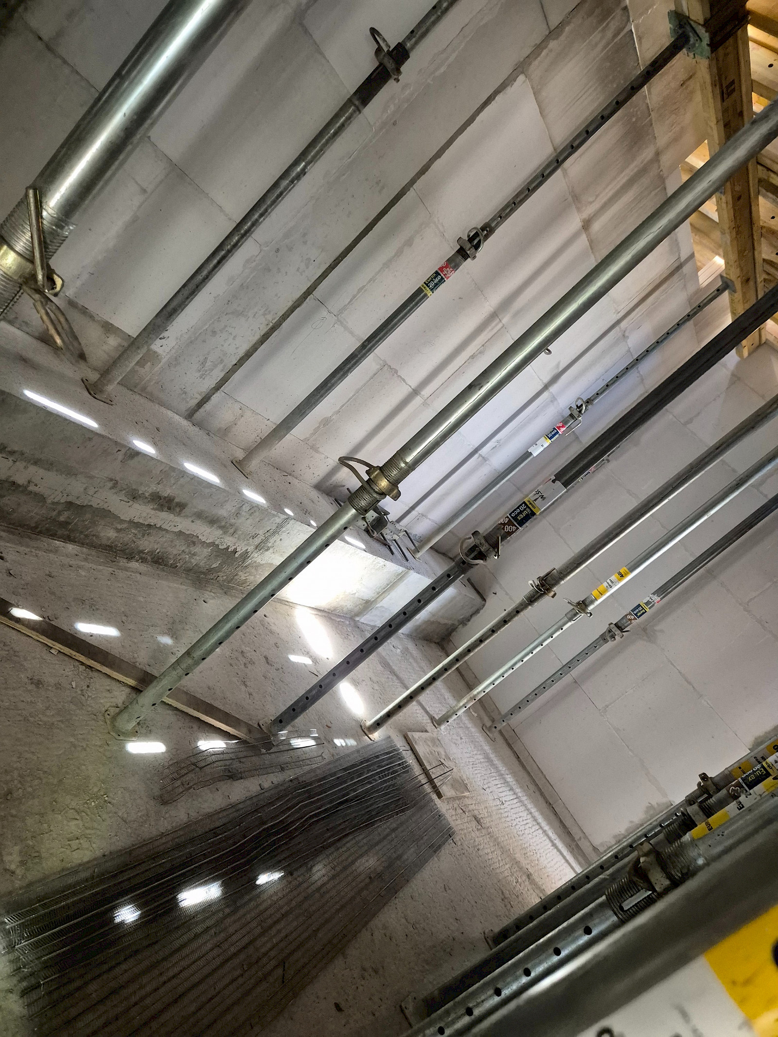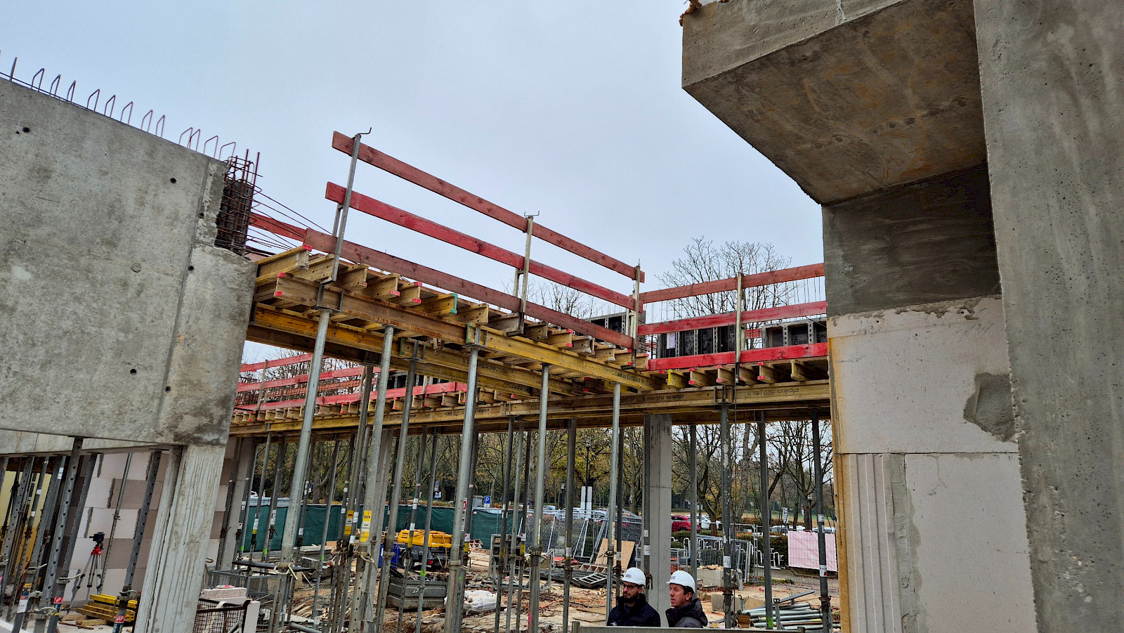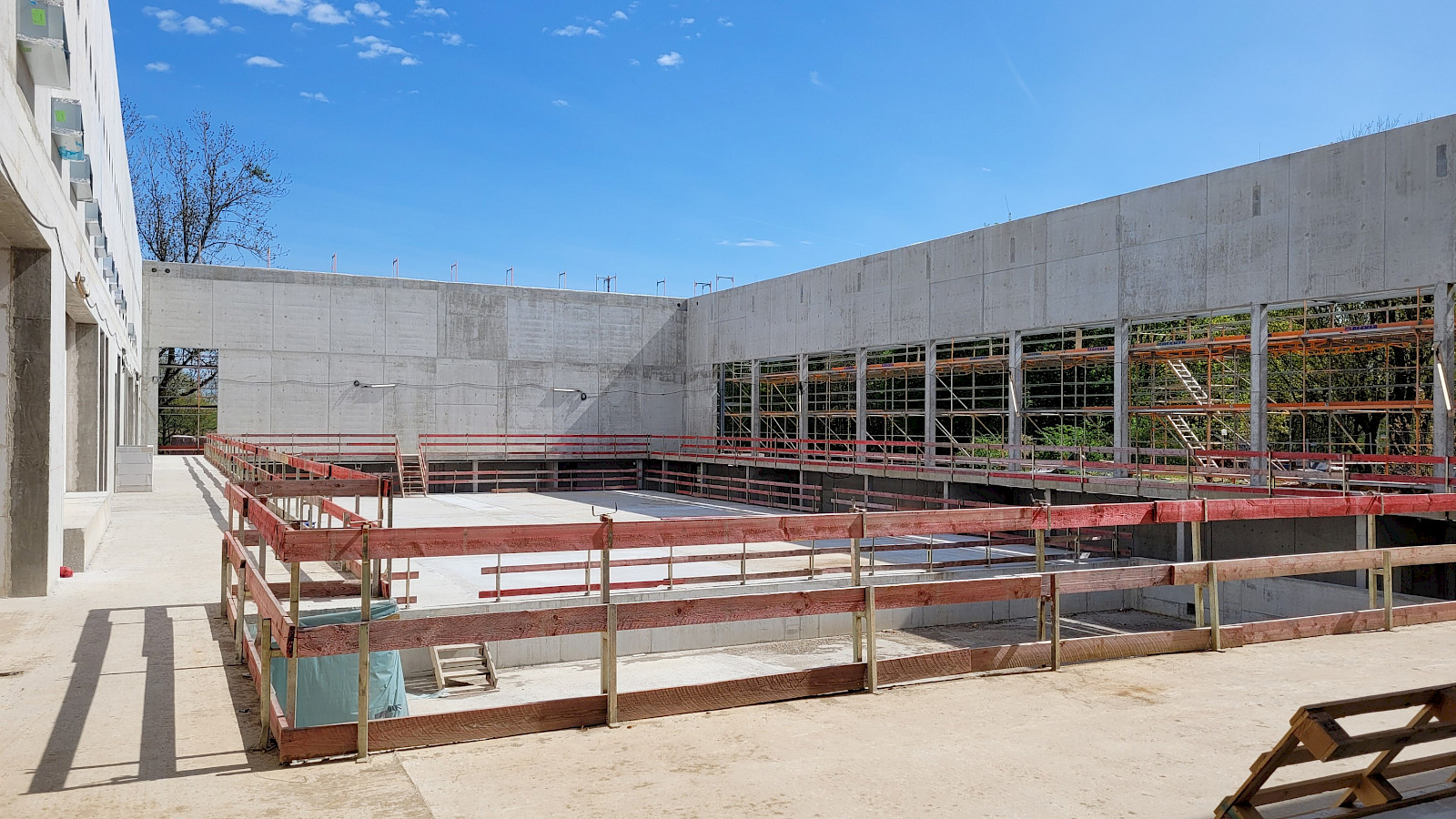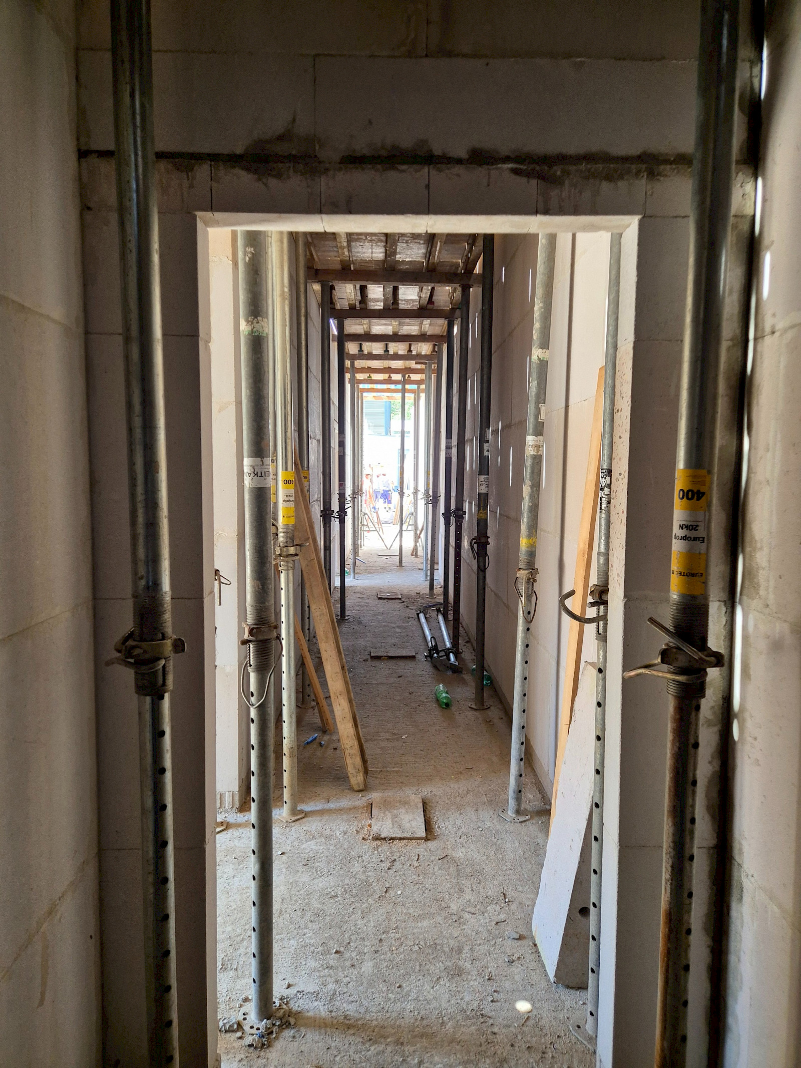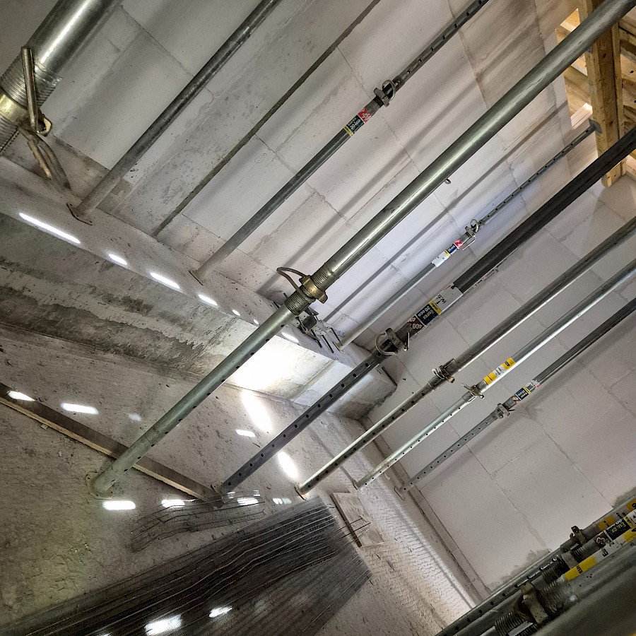 Auch der Rohbau der neuen Eingangshalle ist komplett fertiggestellt. Die Ausschalarbeiten sind derzeit im Gange. Die Gerüststellung ist größtenteils abgeschlossen.