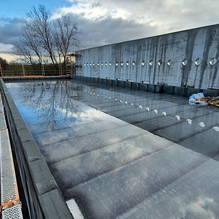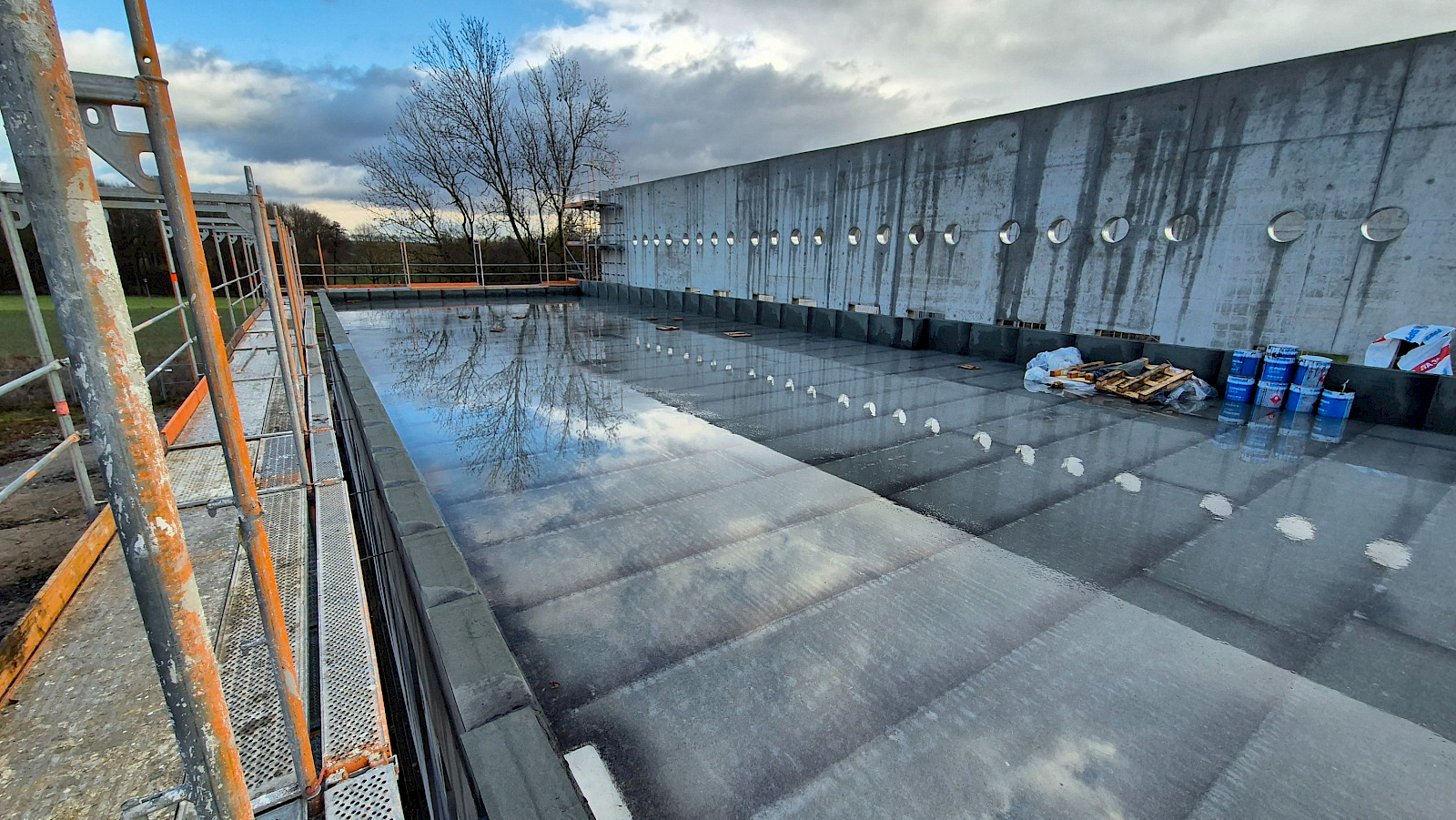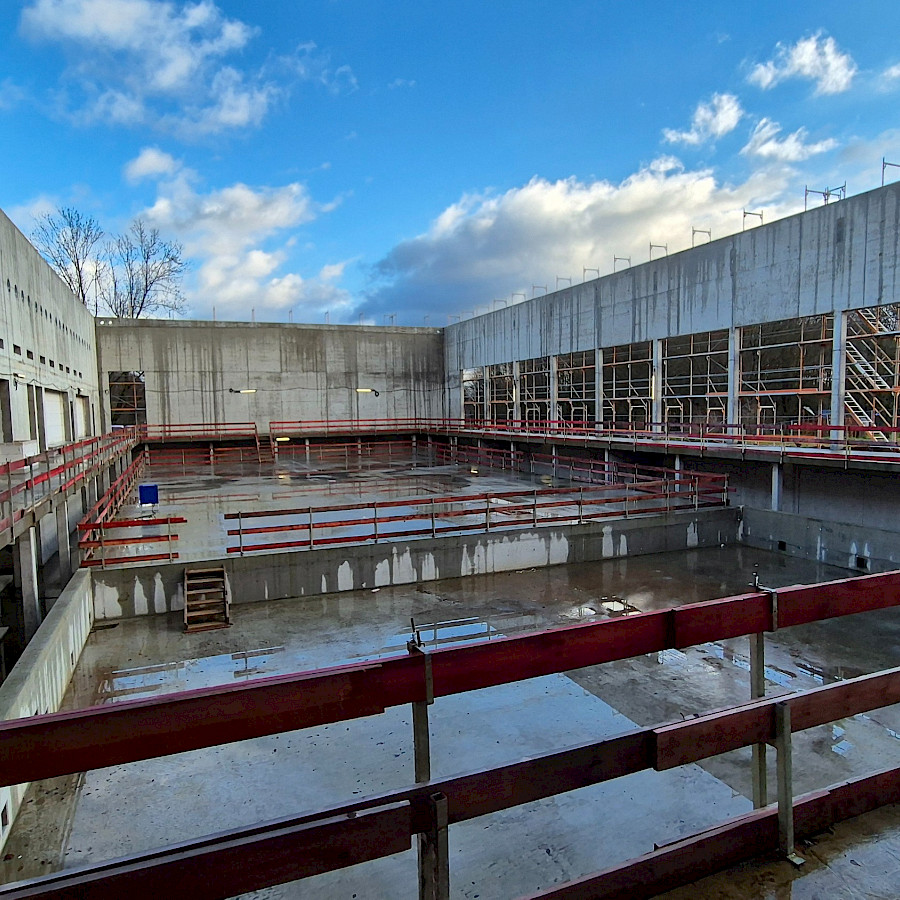 Der Rohbau der neuen 50-Meter-Halle ist vollständig abgeschlossen, ebenso wie die Arbeiten an der Gerüststellung. Aktuell befinden sich die Dachabdichtungsarbeiten in der Umsetzung und schreiten zügig voran.