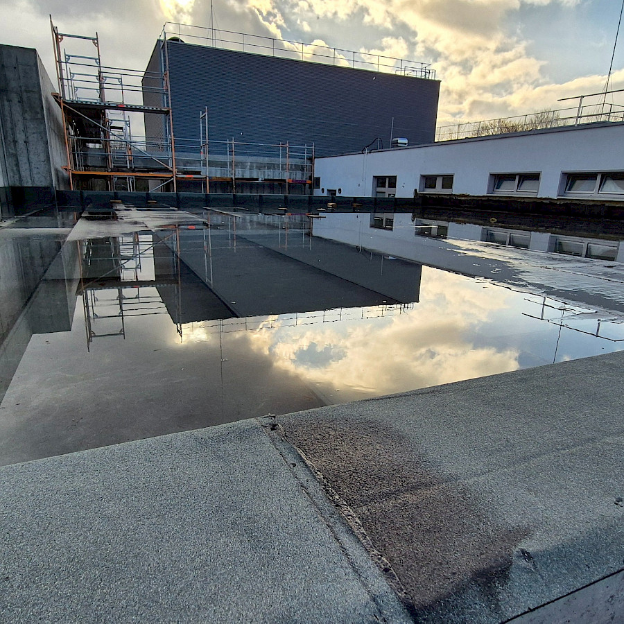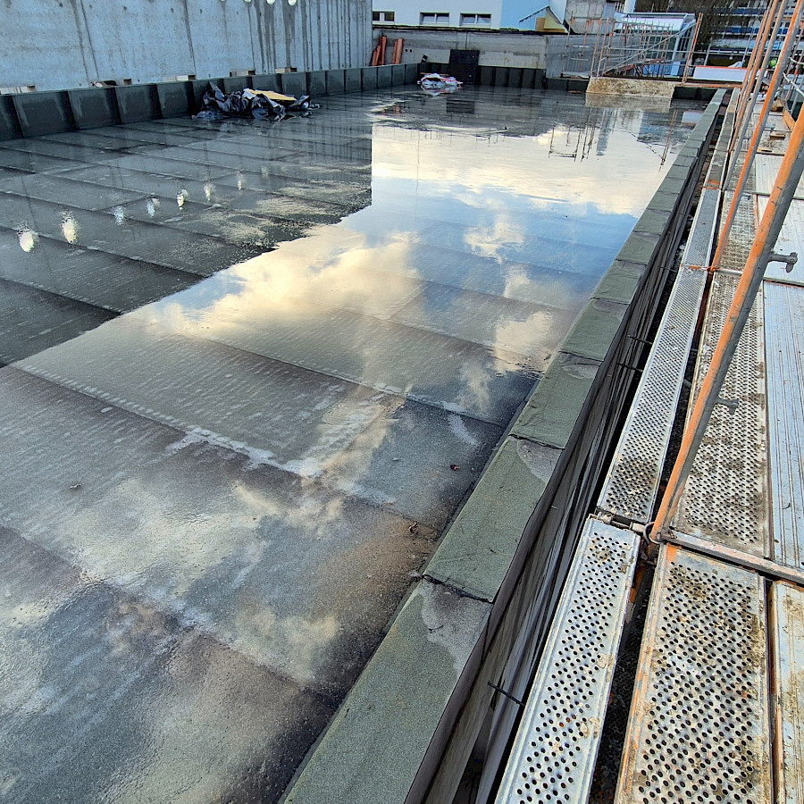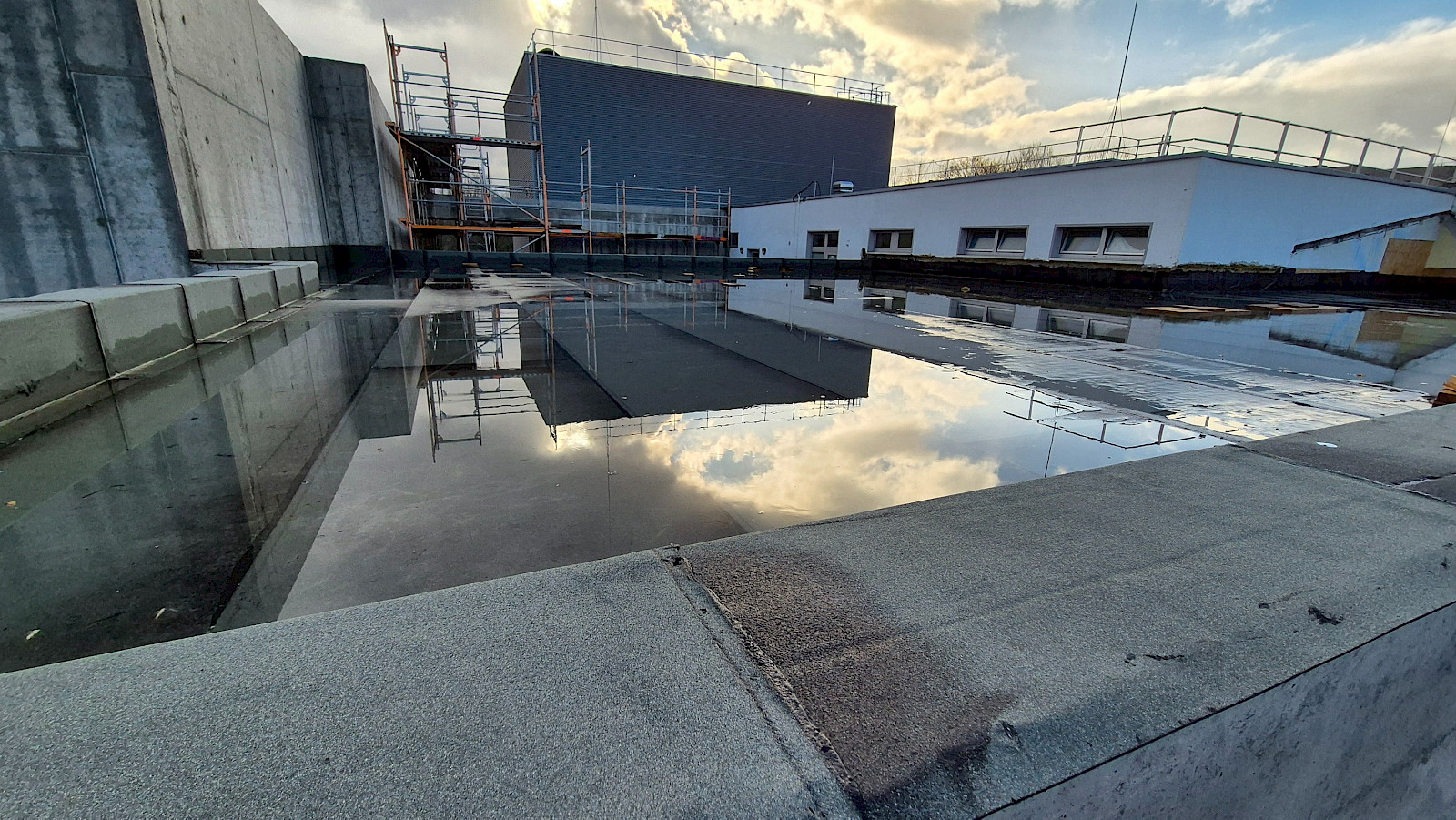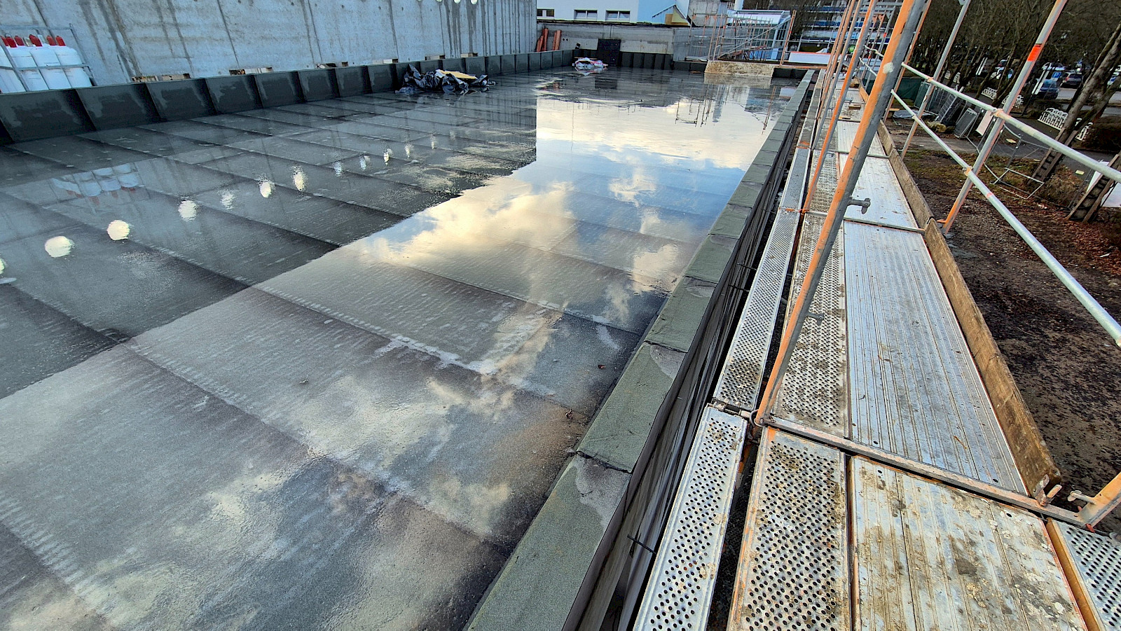 Der Rohbau der neuen 50-Meter-Halle ist vollständig abgeschlossen, ebenso wie die Arbeiten an der Gerüststellung. Aktuell befinden sich die Dachabdichtungsarbeiten in der Umsetzung und schreiten zügig voran.