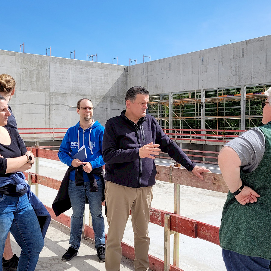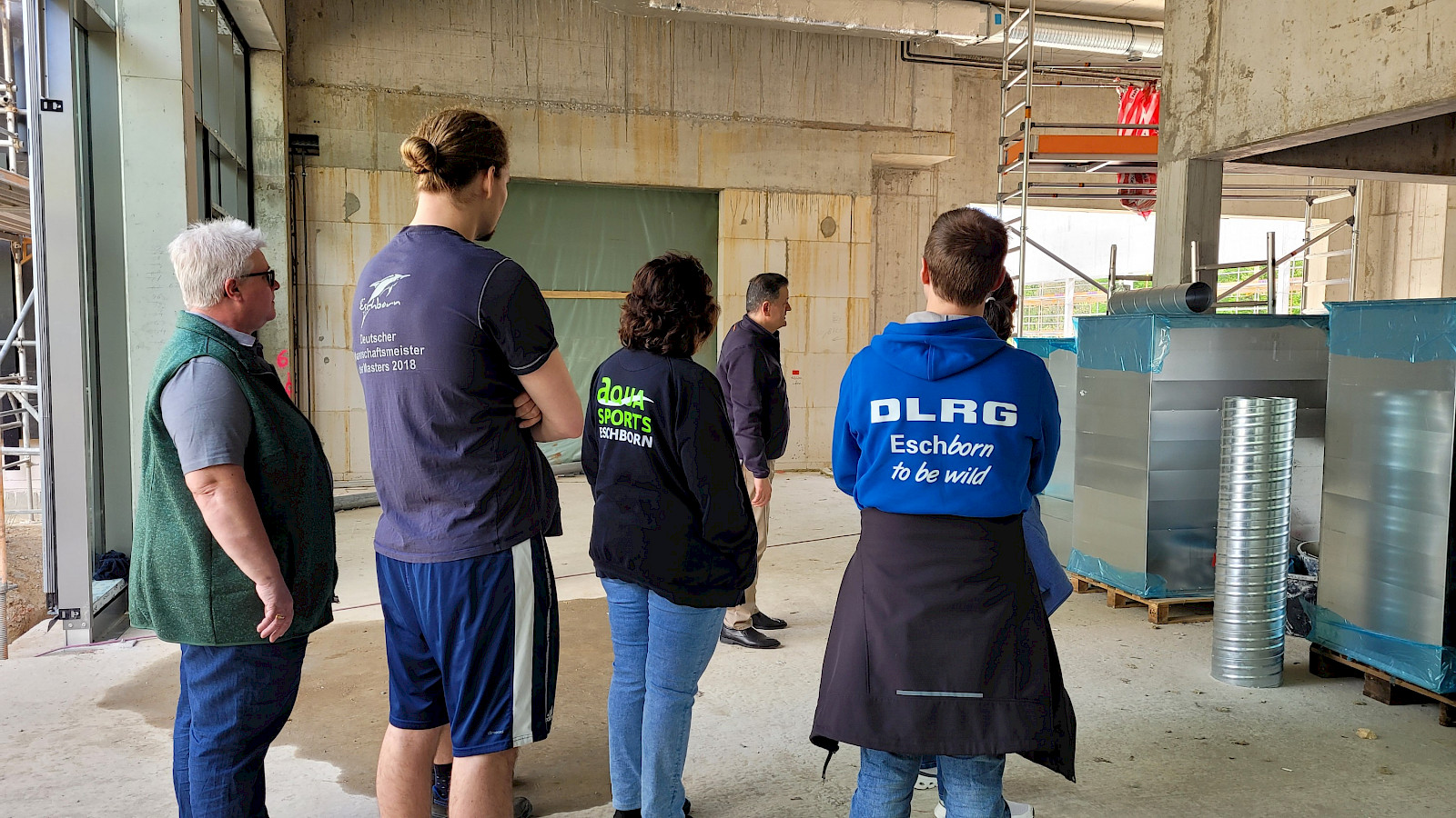 Eshref Bajrami, Generalplaner des Projekts, führte die Gäste über die Baustelle und beantwortete Fragen zu den Planungen. Darüber hinaus tauschten der Planer und die Vereinsvertreterinnen und -vertreter Ideen zur Gestaltung der entstehenden Räumlichkeiten aus, um die neue Halle zukünftig optimal an die Anforderungen des Eschborner Schwimmsports anpassen zu können.