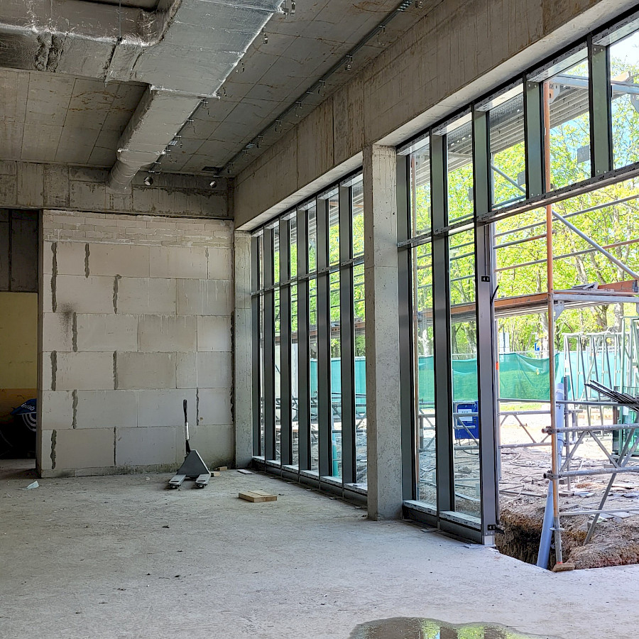 Die Verglasung der Fensterfronten ist größtenteils abgeschlossen und verleiht dem Gebäude nun erste klare Konturen. Auch im Inneren tut sich viel: In der Lüftungszentrale sind Geräte und Leitungen bereits montiert, aktuell laufen die Isolierungsarbeiten an den Lüftungsleitungen. Die Einhausung auf dem Umkleidedach ist ebenfalls fertiggestellt.