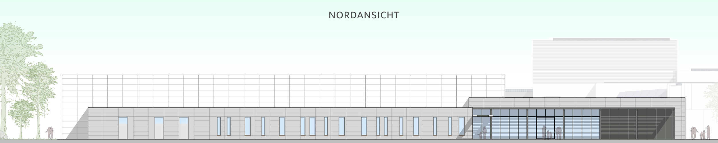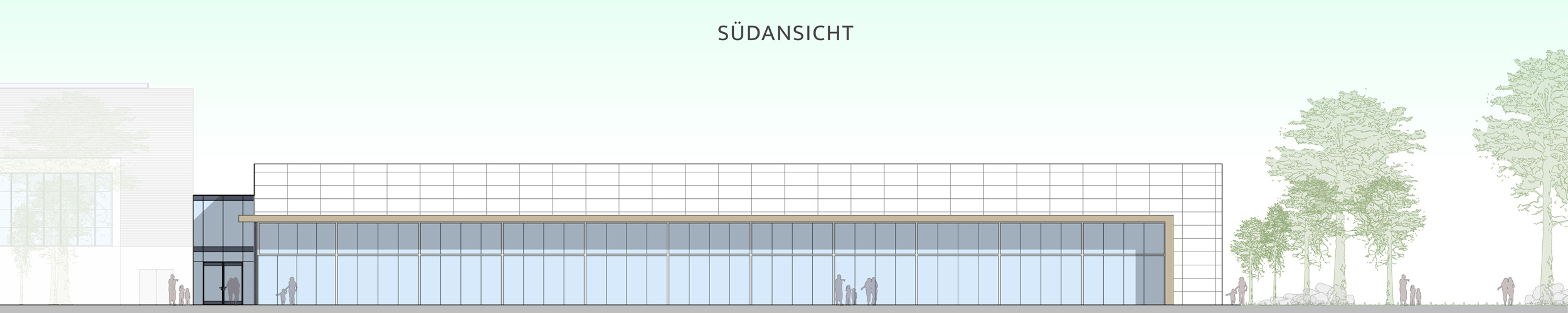 Angegliedert an die neue Schwimmhalle entsteht ein neues Foyer mit großflächiger Verglasung, das das Bestandsbad mit dem neuen Teil verbindet und über das auch der Zugang zum Freibad möglich ist.