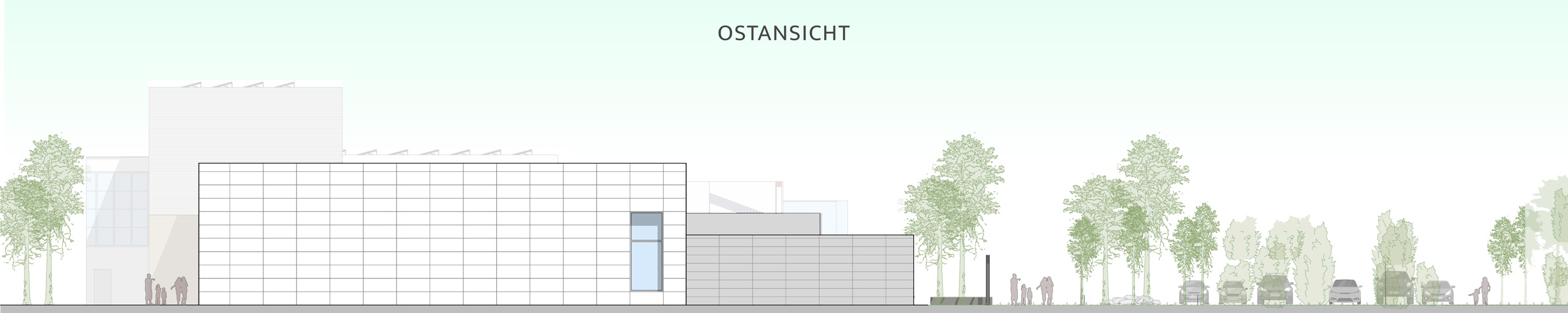 Die Fassade des Neubaus ist nach Süden zum Freibad hin ausgerichtet. Große Fensterflächen im unteren Teil können komplett geöffnet werden, um Außen- und Innenbereich miteinander zu verbinden. Das Gebäude wird die umstehenden Bäume nicht überragen und sich harmonisch in die Landschaft einfügen.